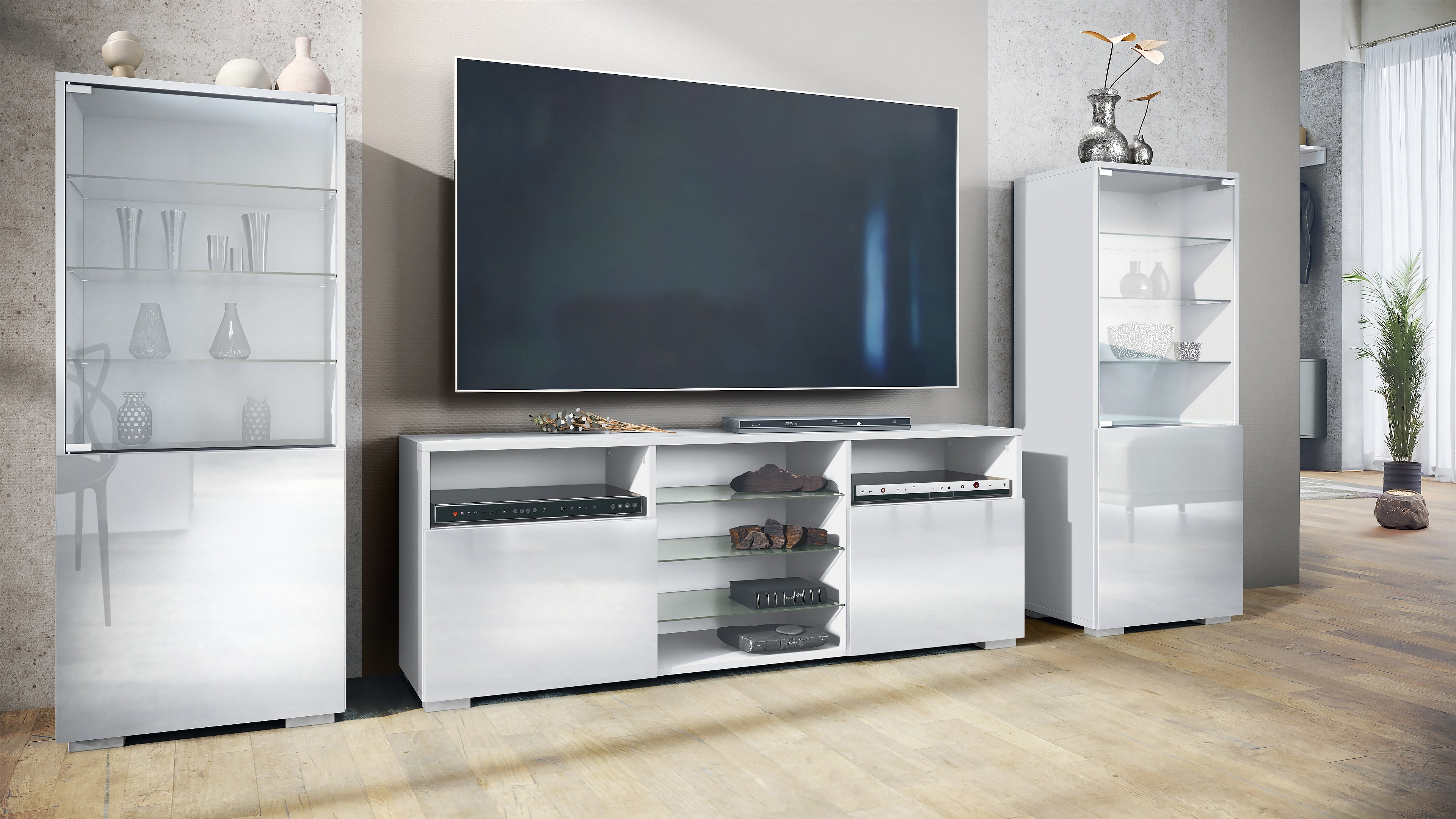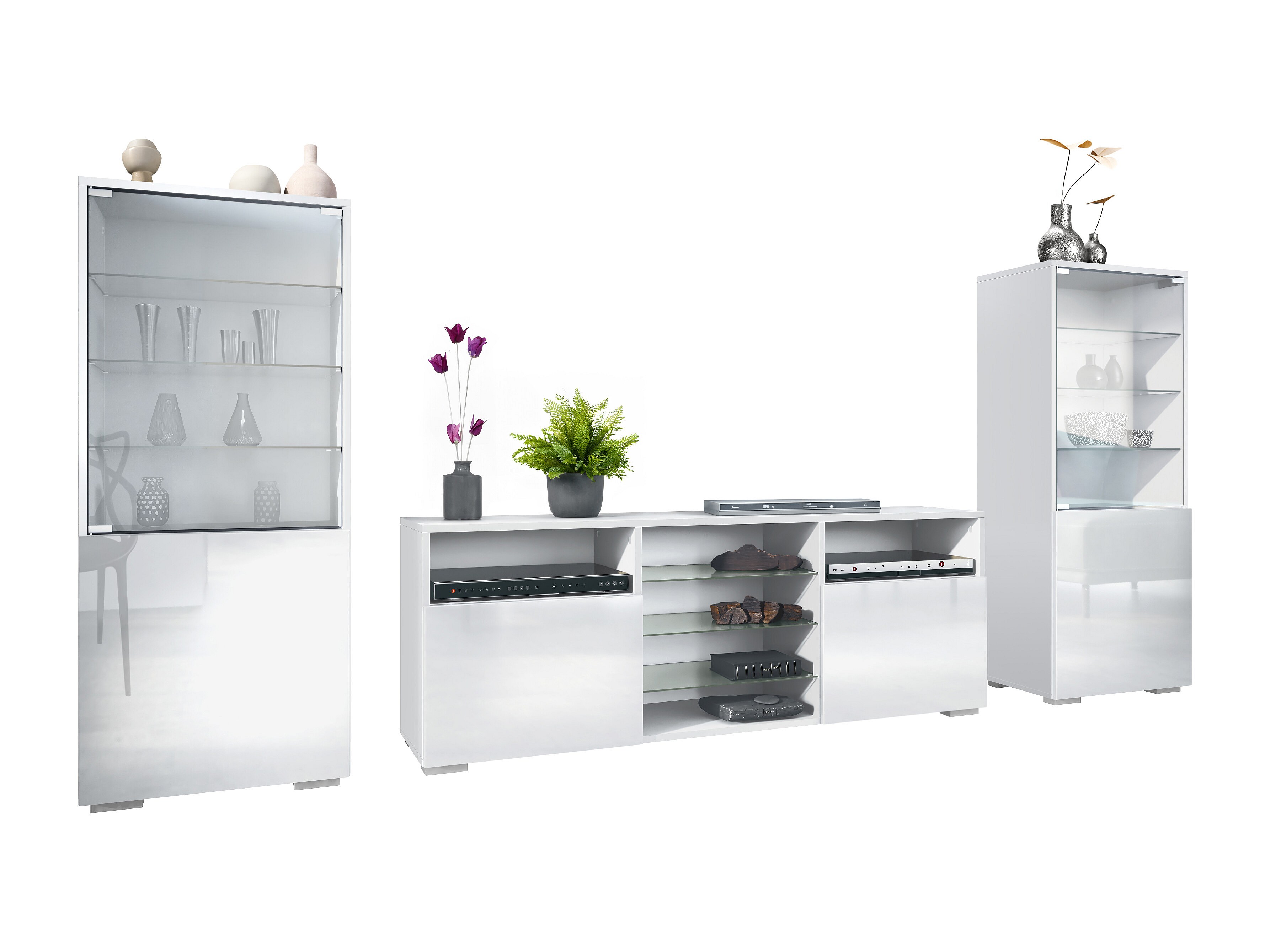 Mueble de pared Davos para sala de estar, compuesto por 2 vitrinas y 1 mueble de TV, blanco mate/blanco de alto brillo incl. iluminación LED (329 x 134 x 35 cm)