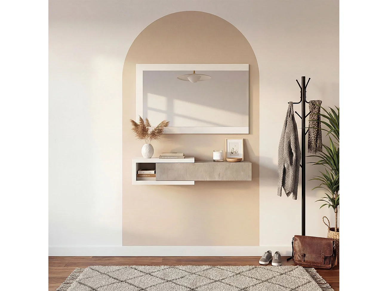 Mueble recibidor con 1 cajón y espejo en blanco mate y gris cemento 95 cm Derek Blanco Artik (Blanco Mate) - Gris Cemento