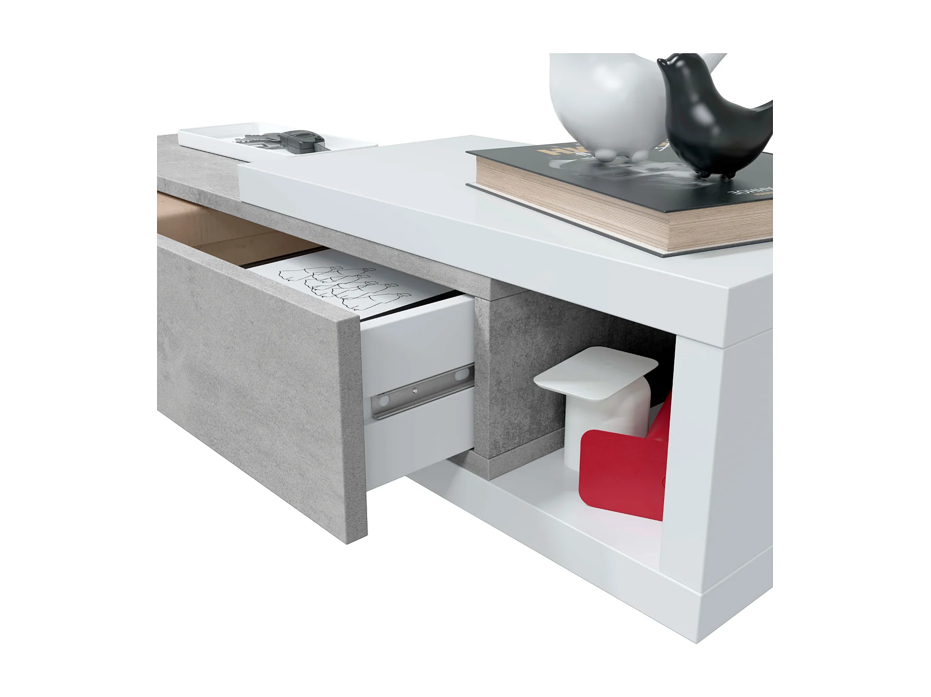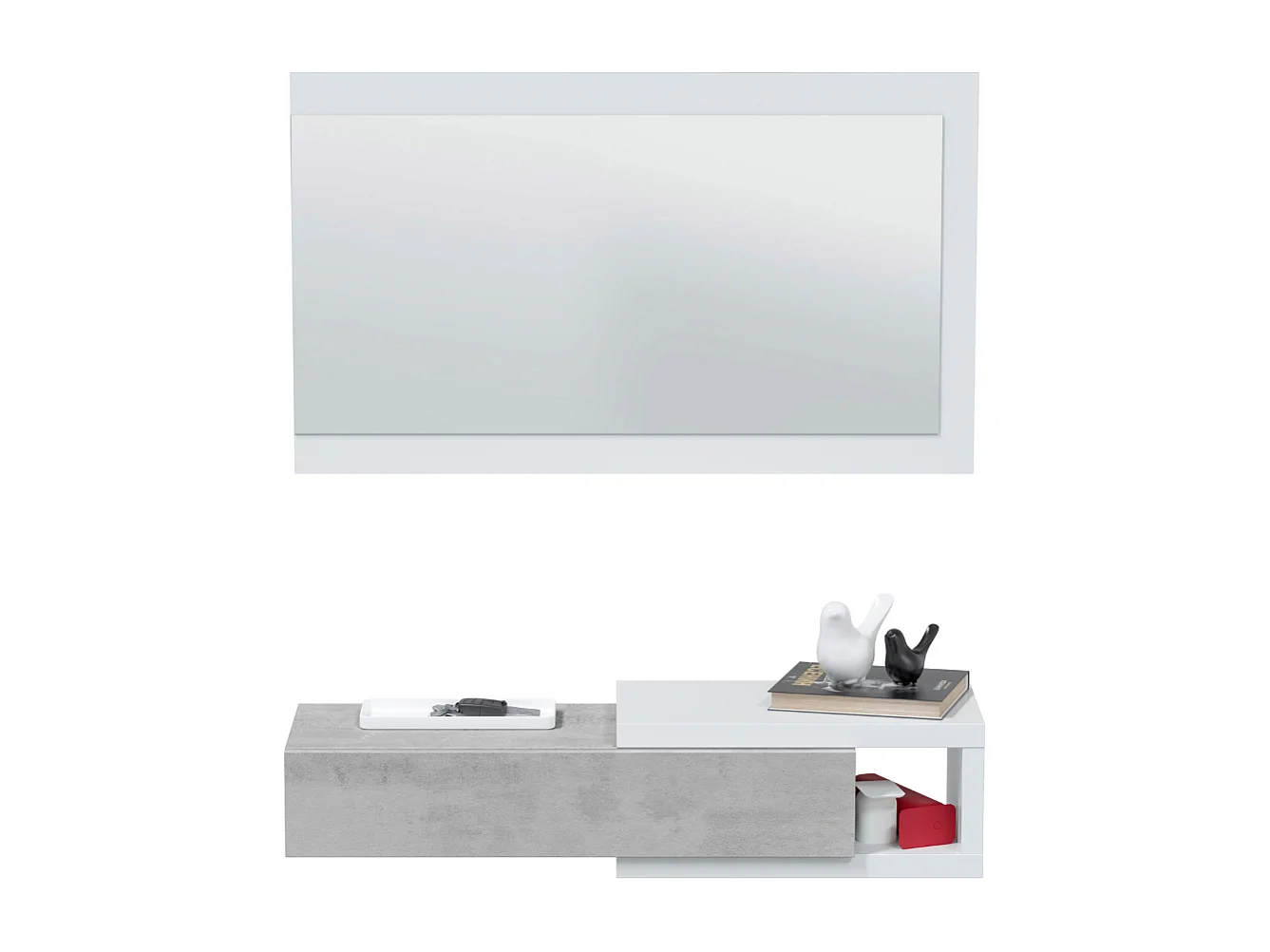 Mueble de entrada Mcallen, Entrada reversible con espejo, Mueble recibidor con cajón, Bandeja de bolsillo para apartamentos, 95x26h69 cm, Blanco y Cemento