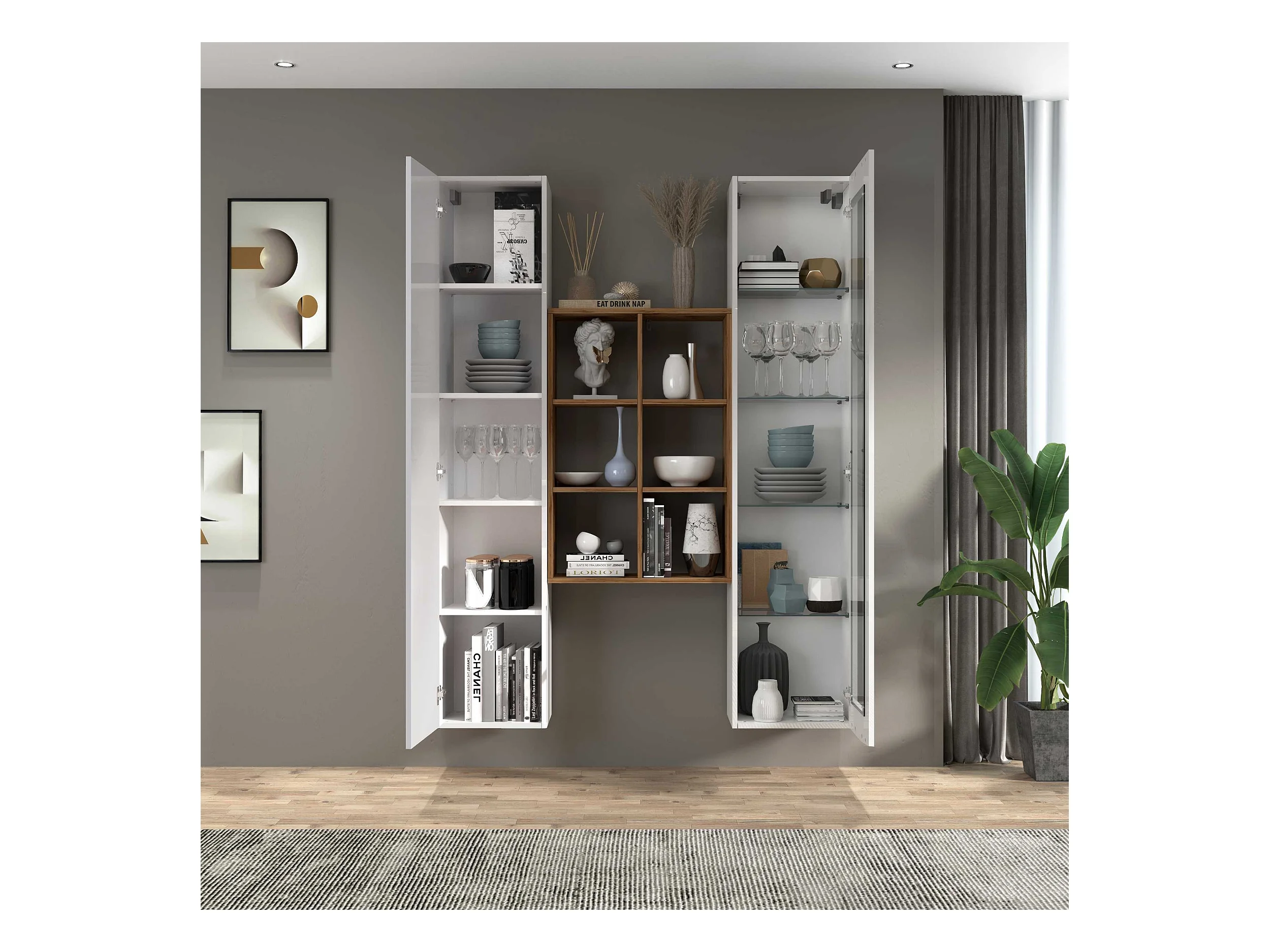 Pared de almacenamiento suspendida blanca 2 armarios 9 estantes Pella WH