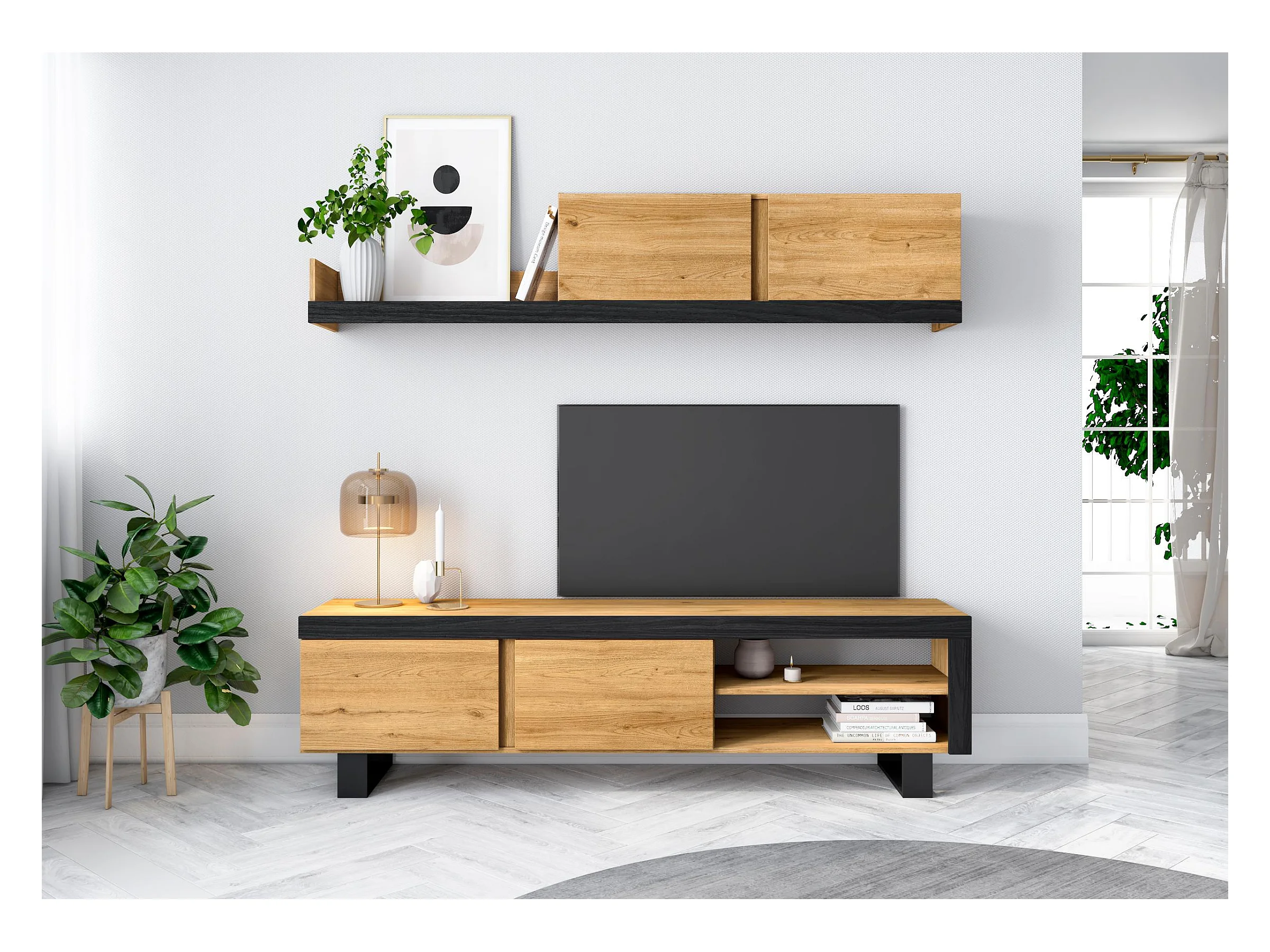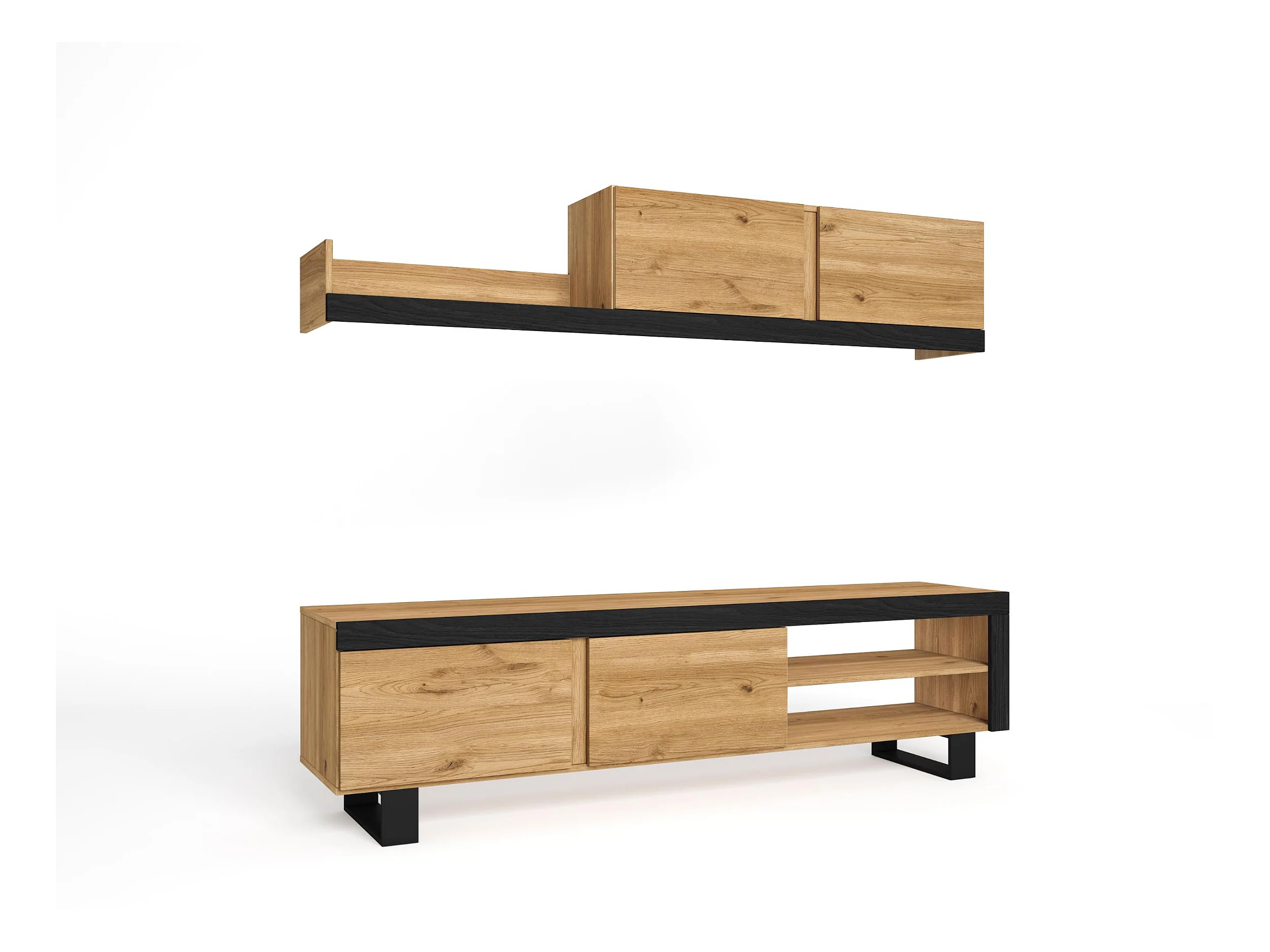 Mueble de Salón IDEM "Naturale" con patas - Módulos de Comedor - Roble/Negro Nórdico, 200x40x180cm