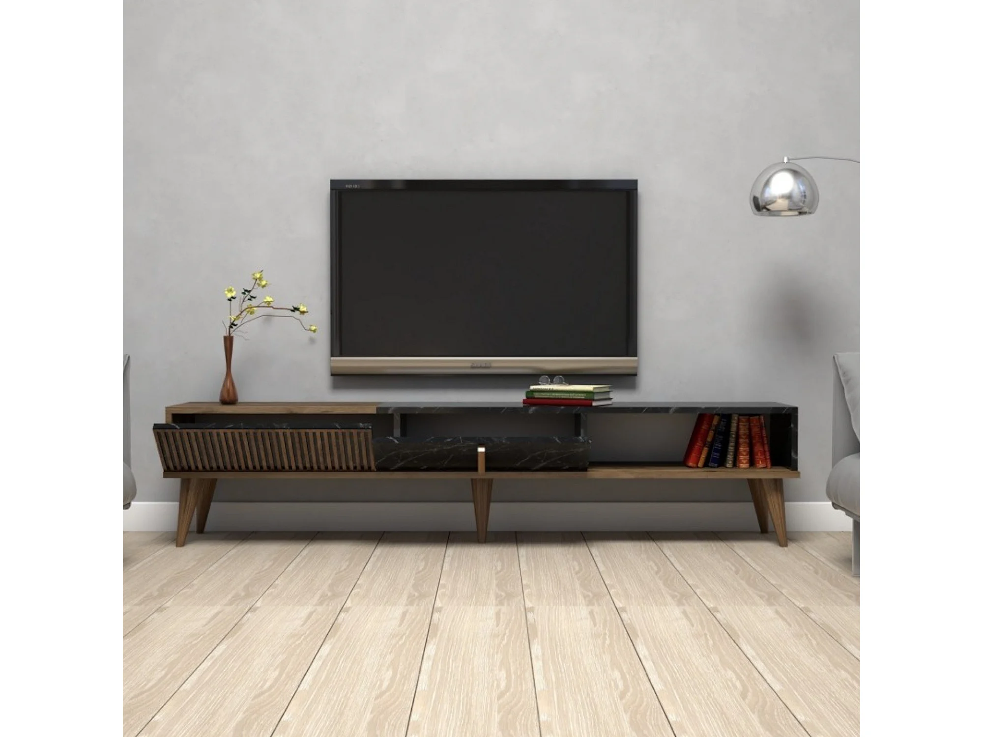 Mueble de televisión Dpellicor, Aparador de salón, Mueble bajo para TV, Base de pared equipada, 180x35 h40 cm, Nogal y Negro
