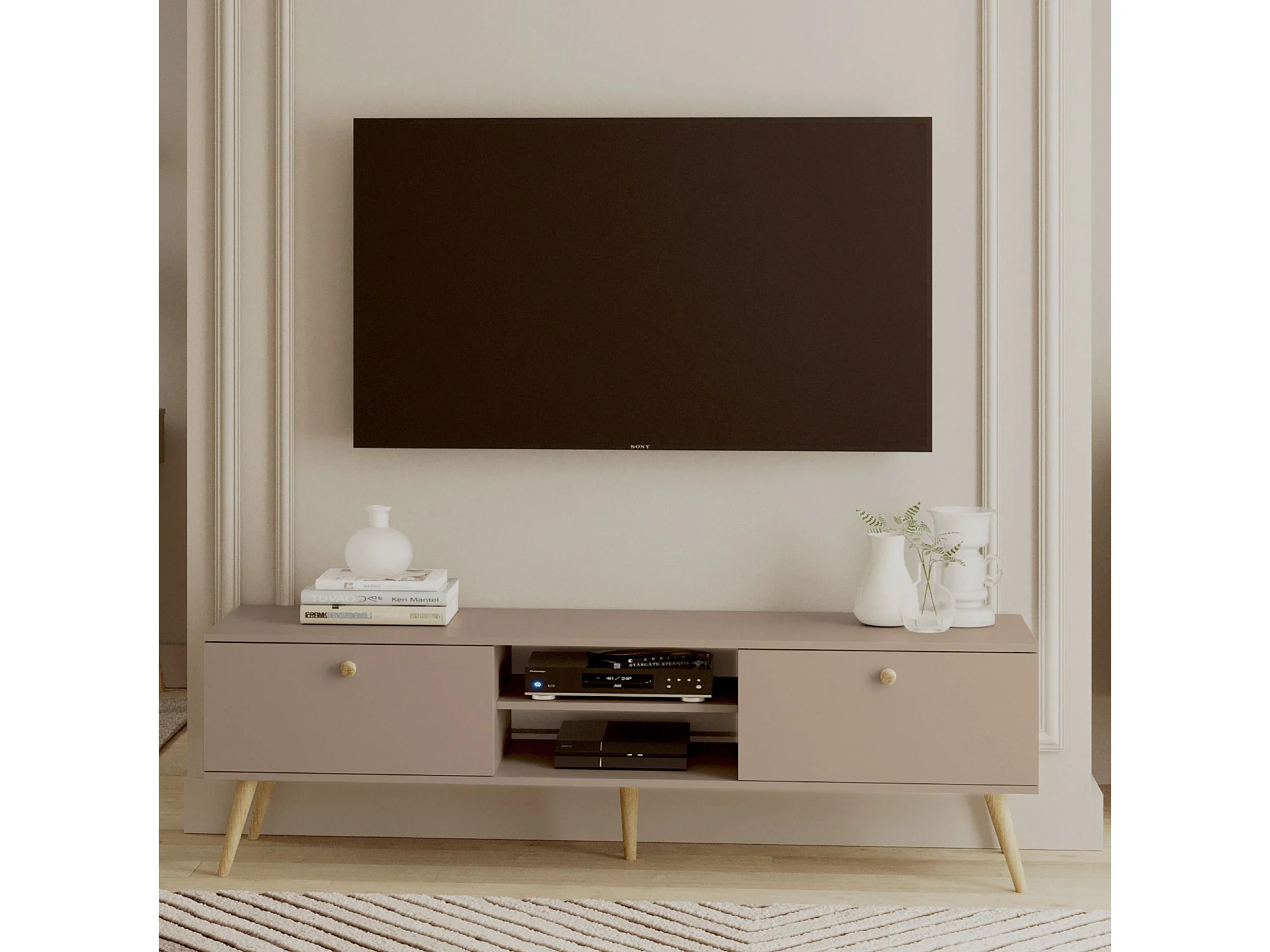 Mueble TV, Mueble de Salón Moderno, Mesa de televisión 2 Puertas y 2 Estantes, Acabado en Color Cañón, Patas de Madera, 135 cm Lar x 56,6 cm Al x 41,