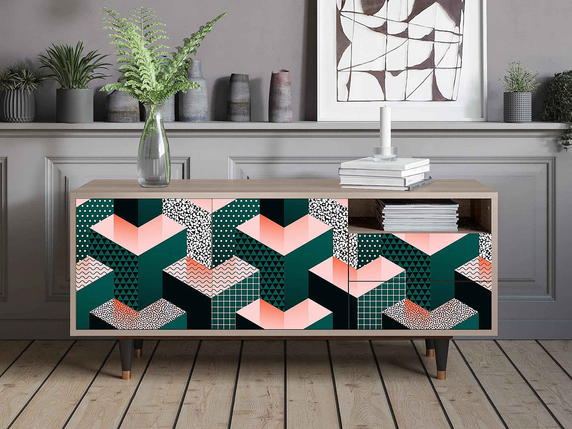 Mueble de TV - 125х56х41 cm - T7 - Geometric Madness, Latte