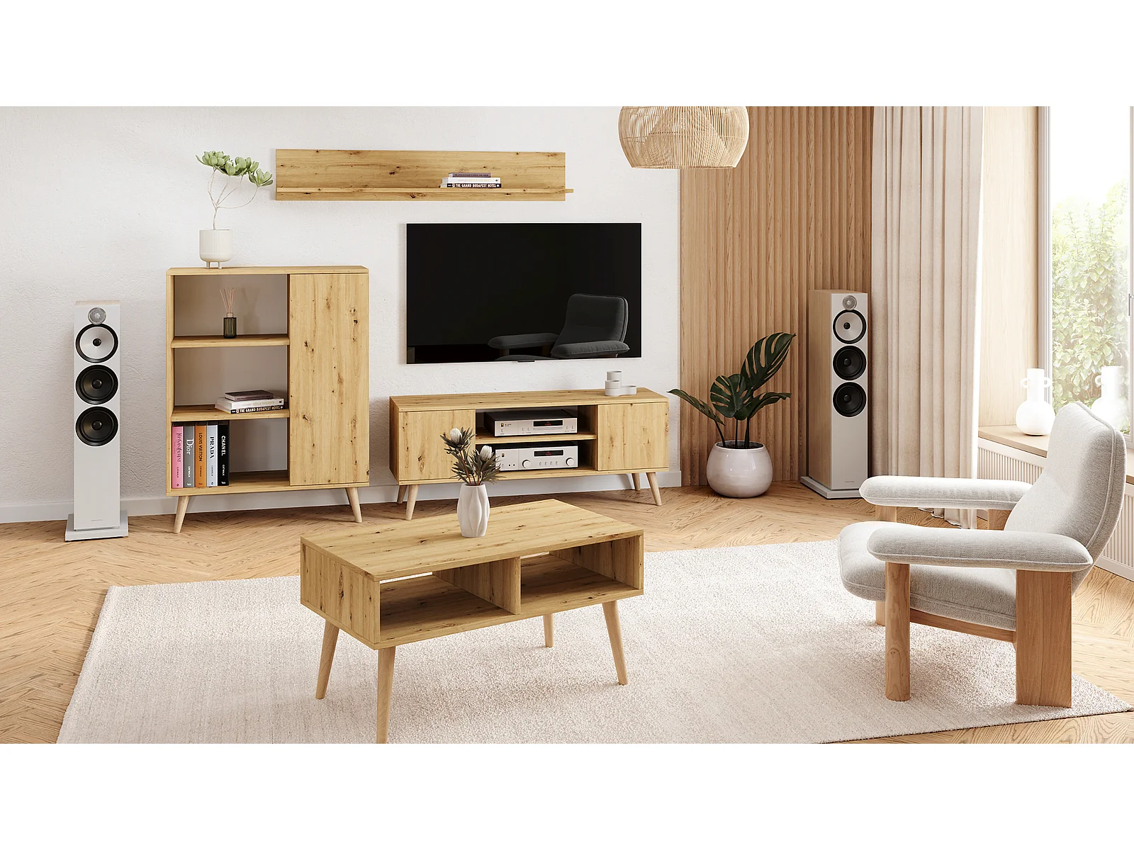 Mueble de TV 135 cm Roble Artesano – Estilo Escandinavo con Estante Central, Armarios con Cerradura y Patas de Madera, 135x50x40 cm
