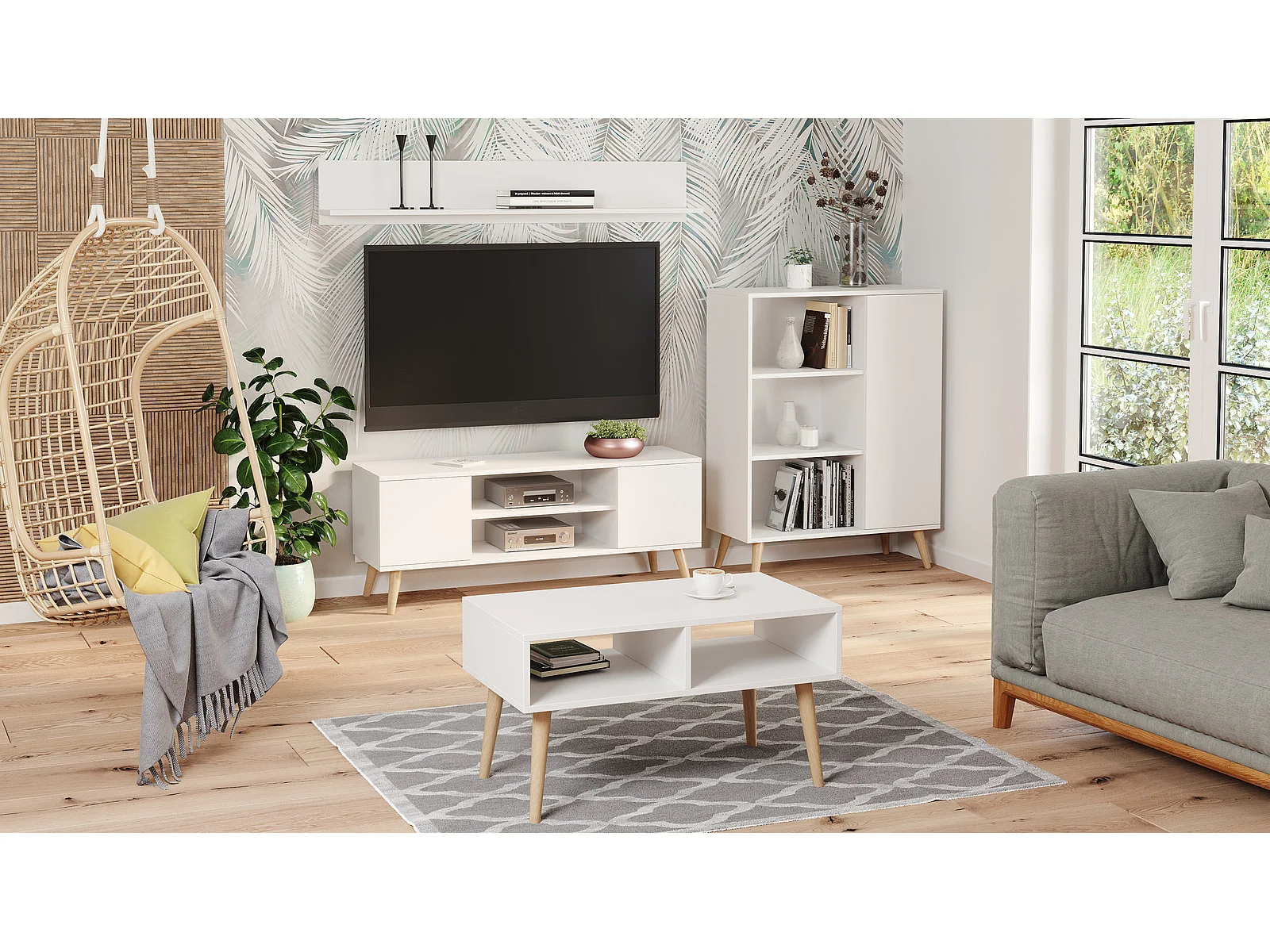 Mueble de TV 155 cm Color Blanco– Estilo Escandinavo con Estante Central y 2 Puertas, Armarios con Cerradura y Patas Madera, 155x40x50 Cm