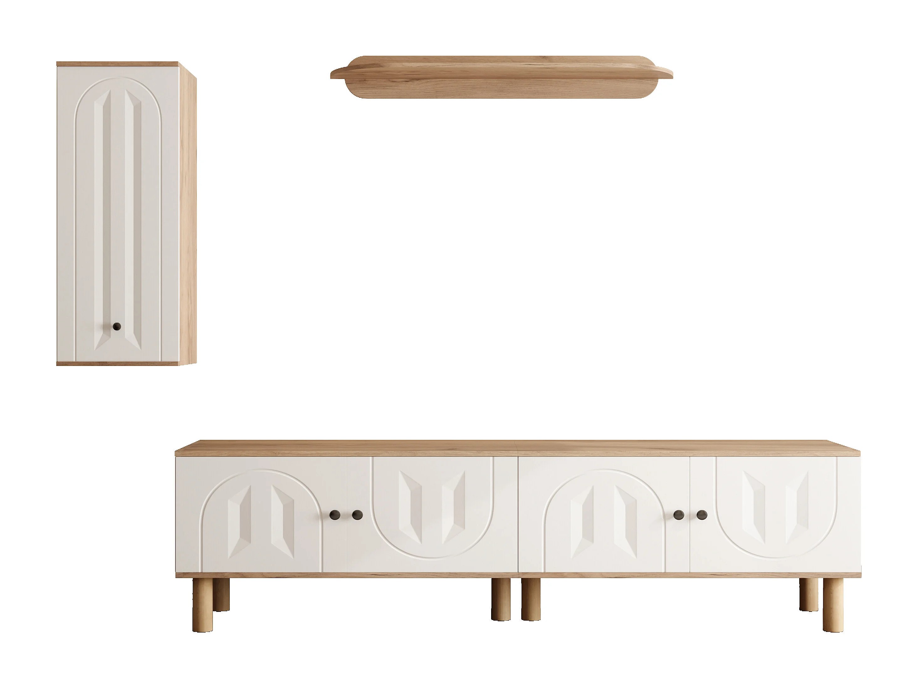 Mueble de TV, almacenaje y estantes de pared para salón, con 5 puertas, blanco y natural