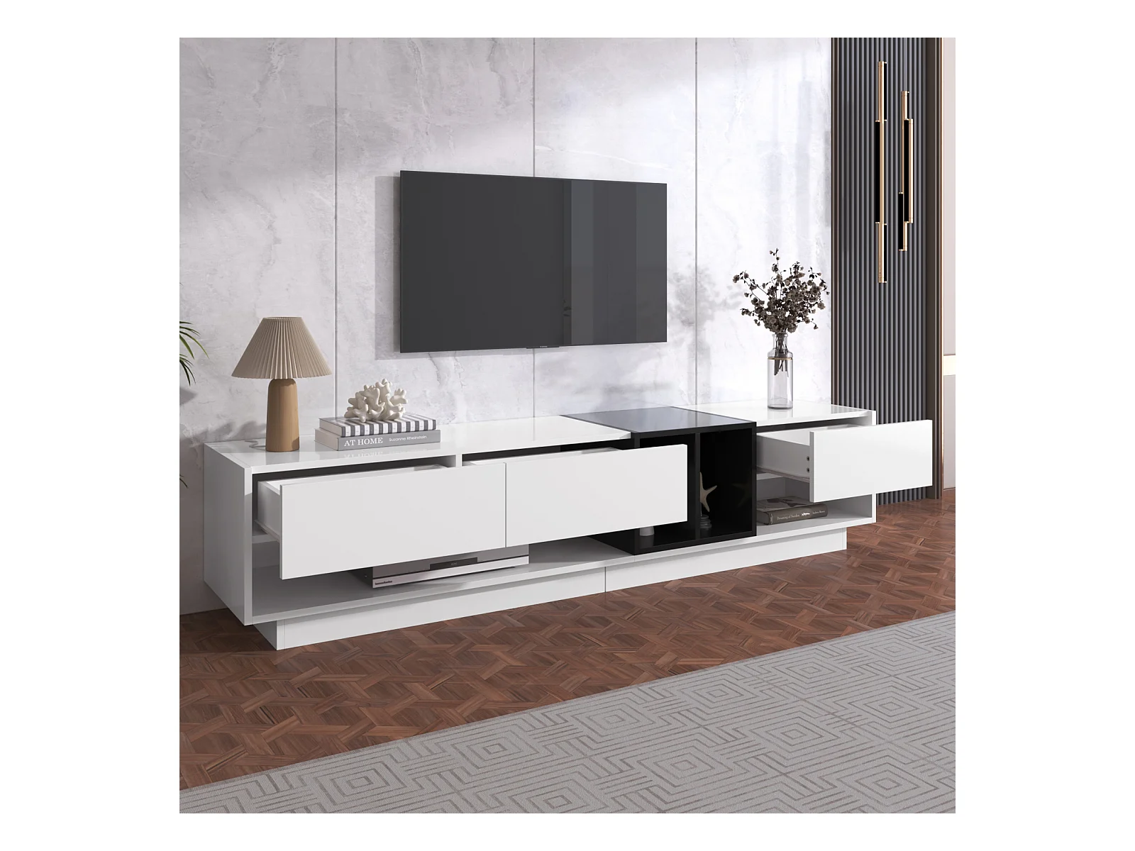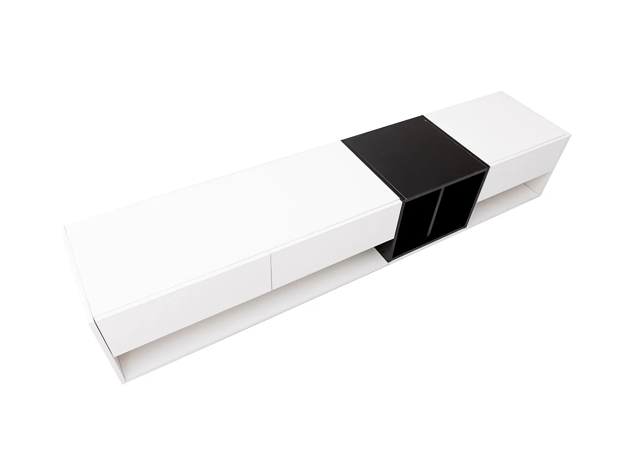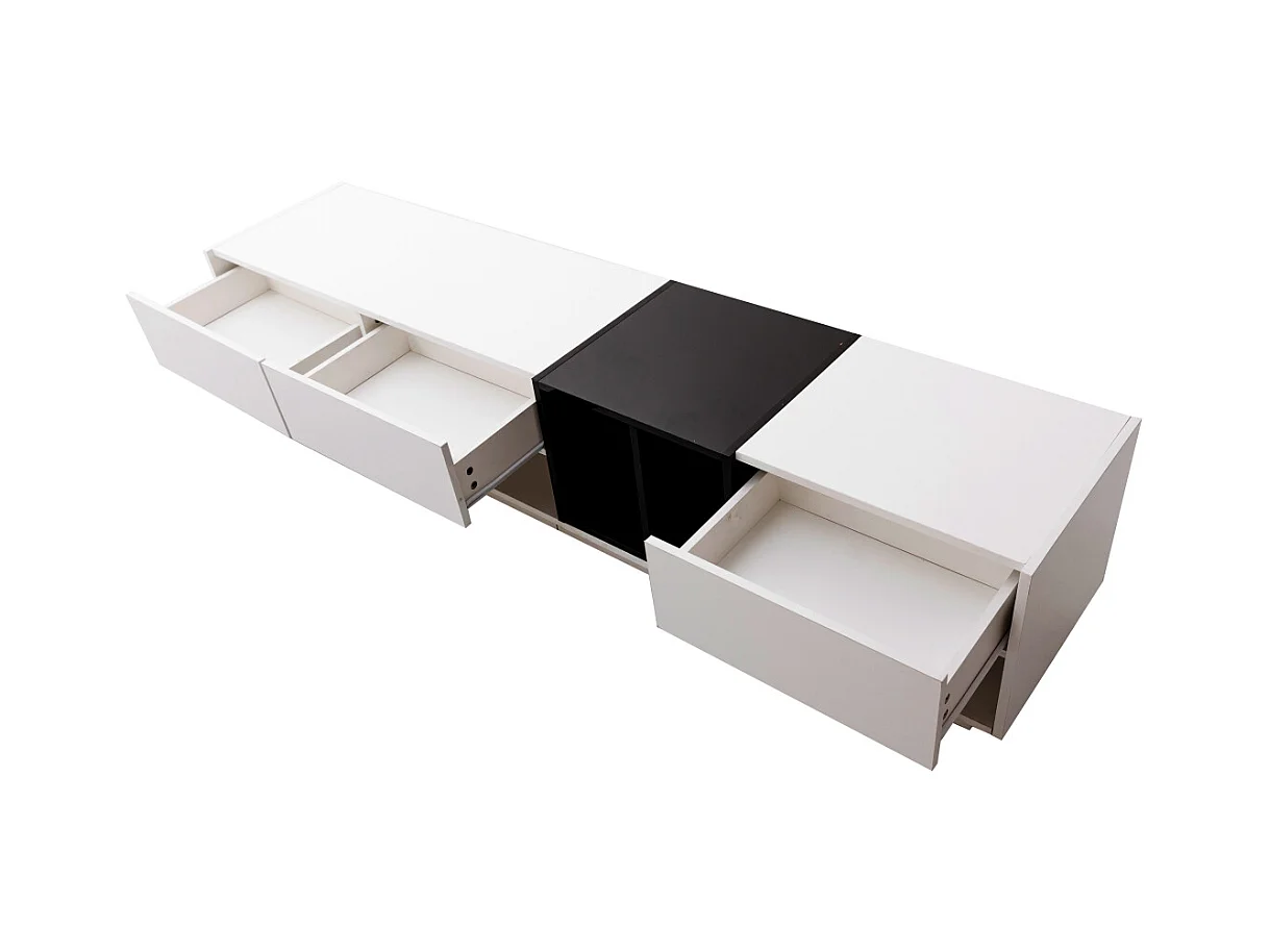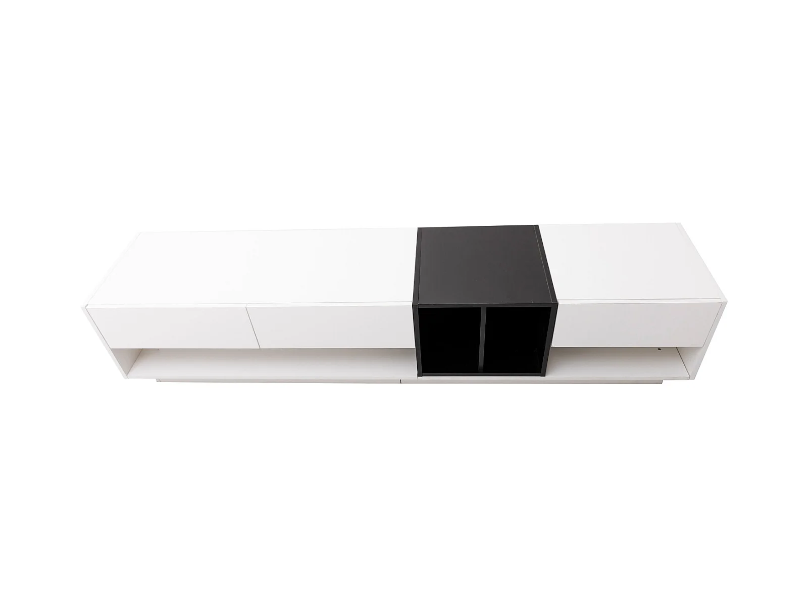 Mueble de TV con panel bajo y patas de bloques de color en blanco brillante y negro, con puertas y cajones.