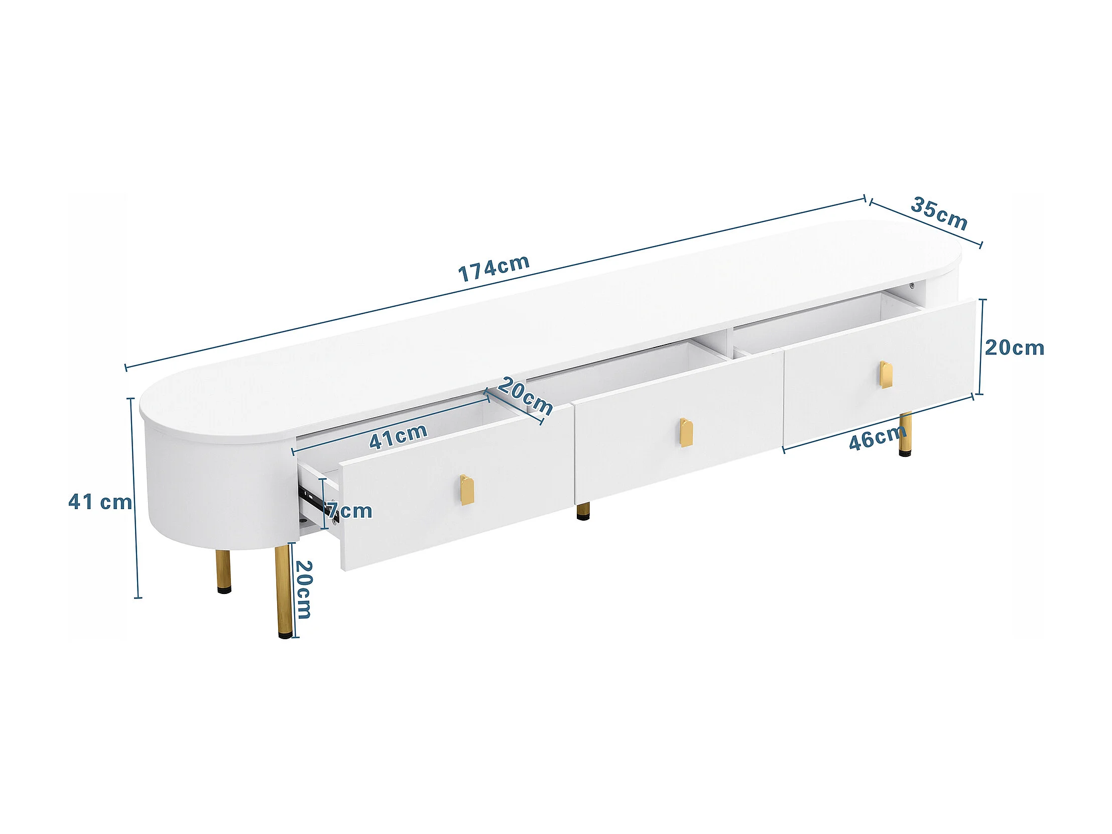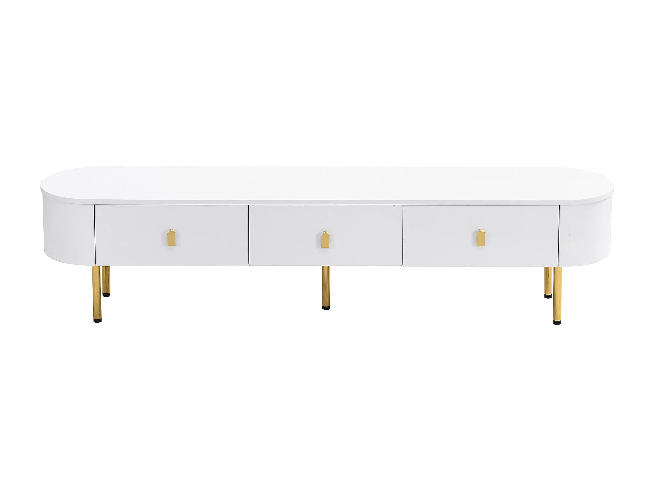 Mueble de TV blanco con 3 cajones, tablero ovalado y patas doradas.