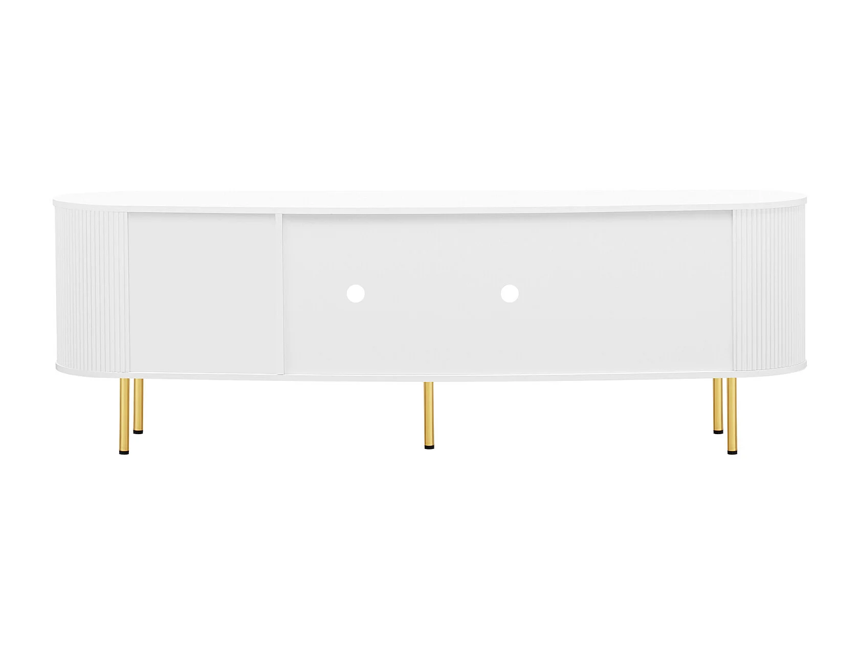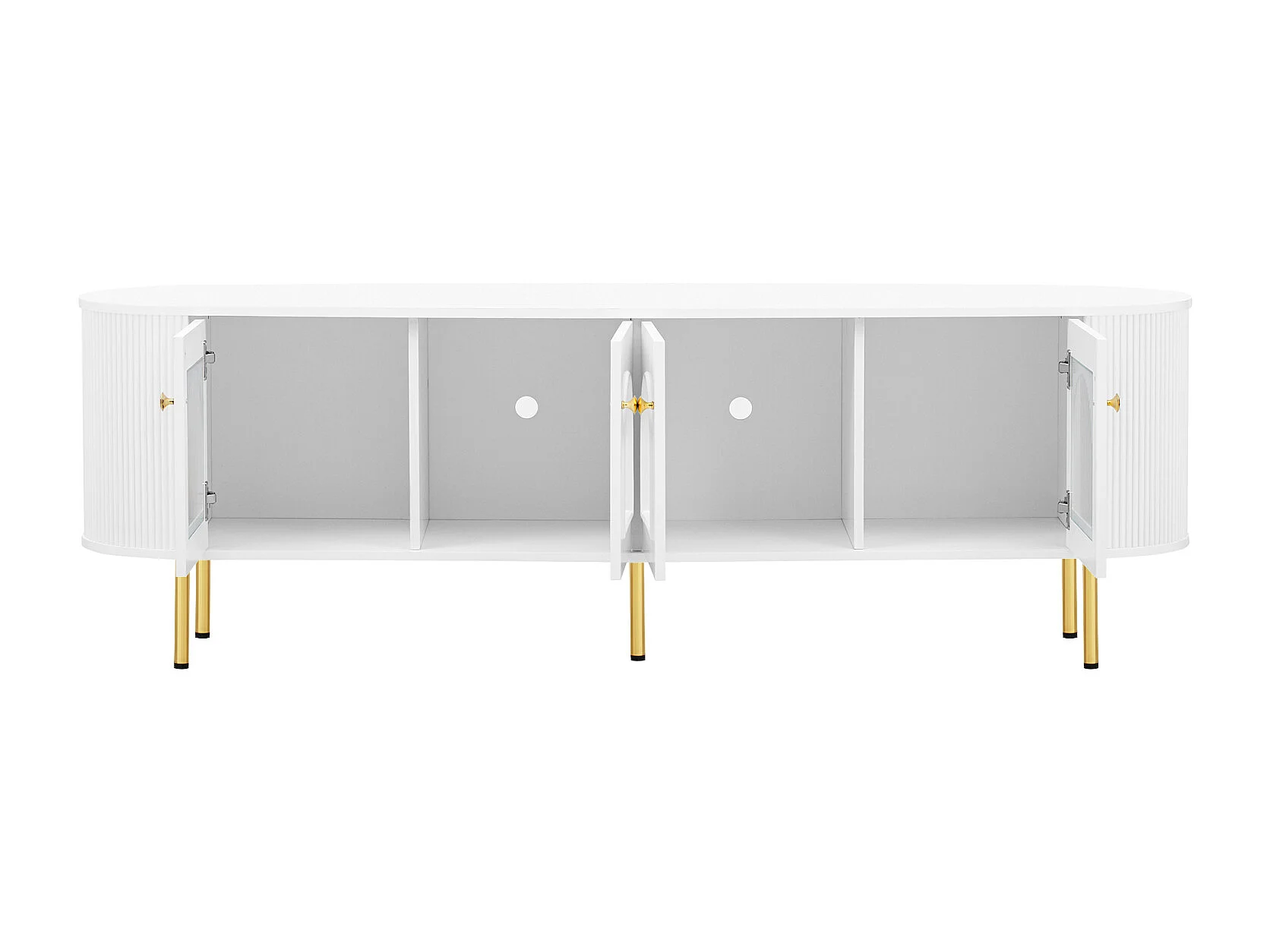 Mueble de TV blanco con 4 puertas de vidrio, manijas y patas doradas