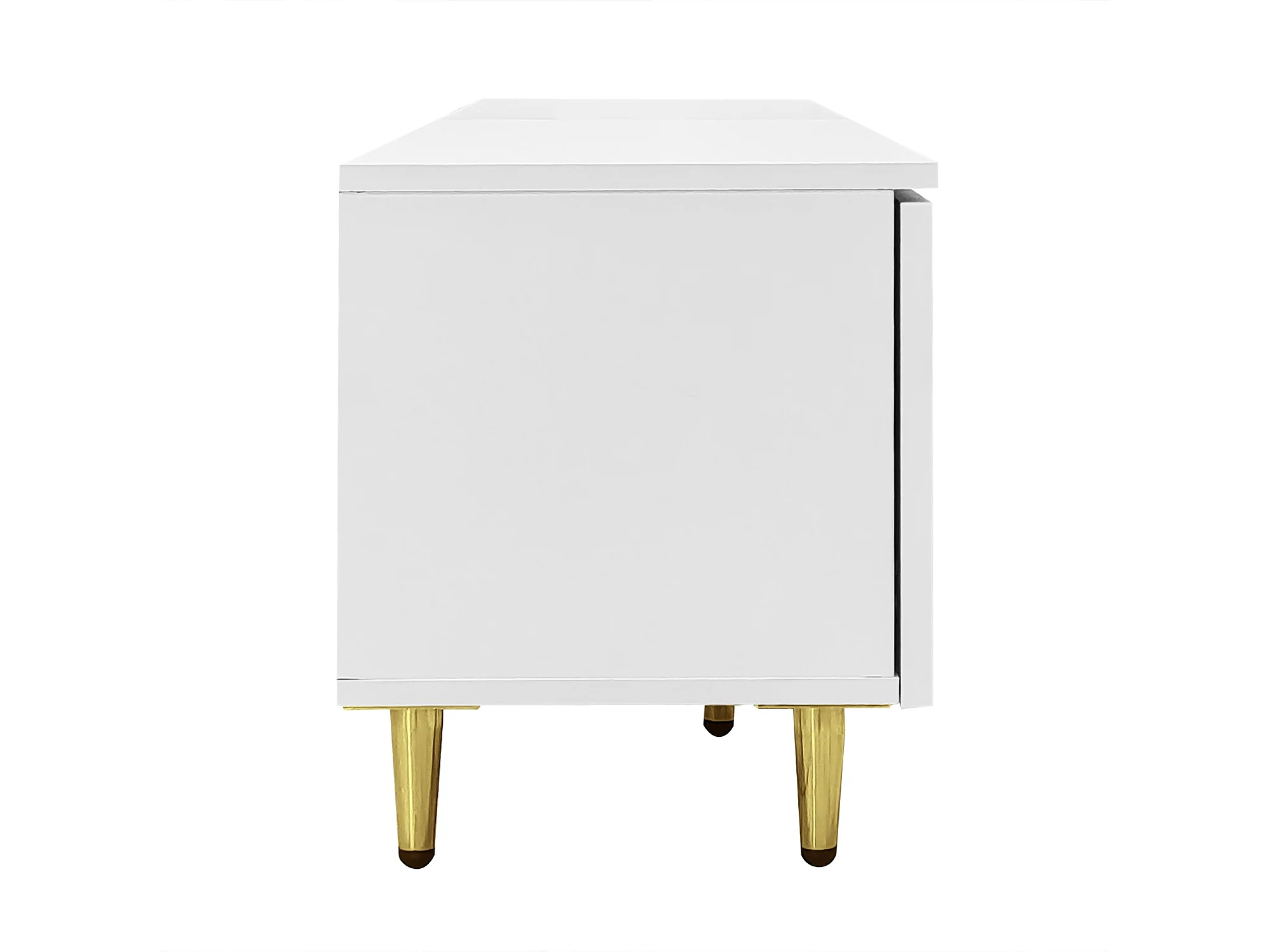 Mueble TV PB blanco y dorado de 170 cm con LED, puertas de cristal templado y cajones esculpidos