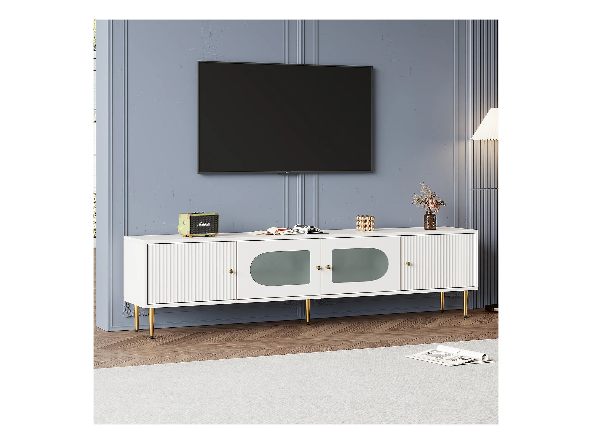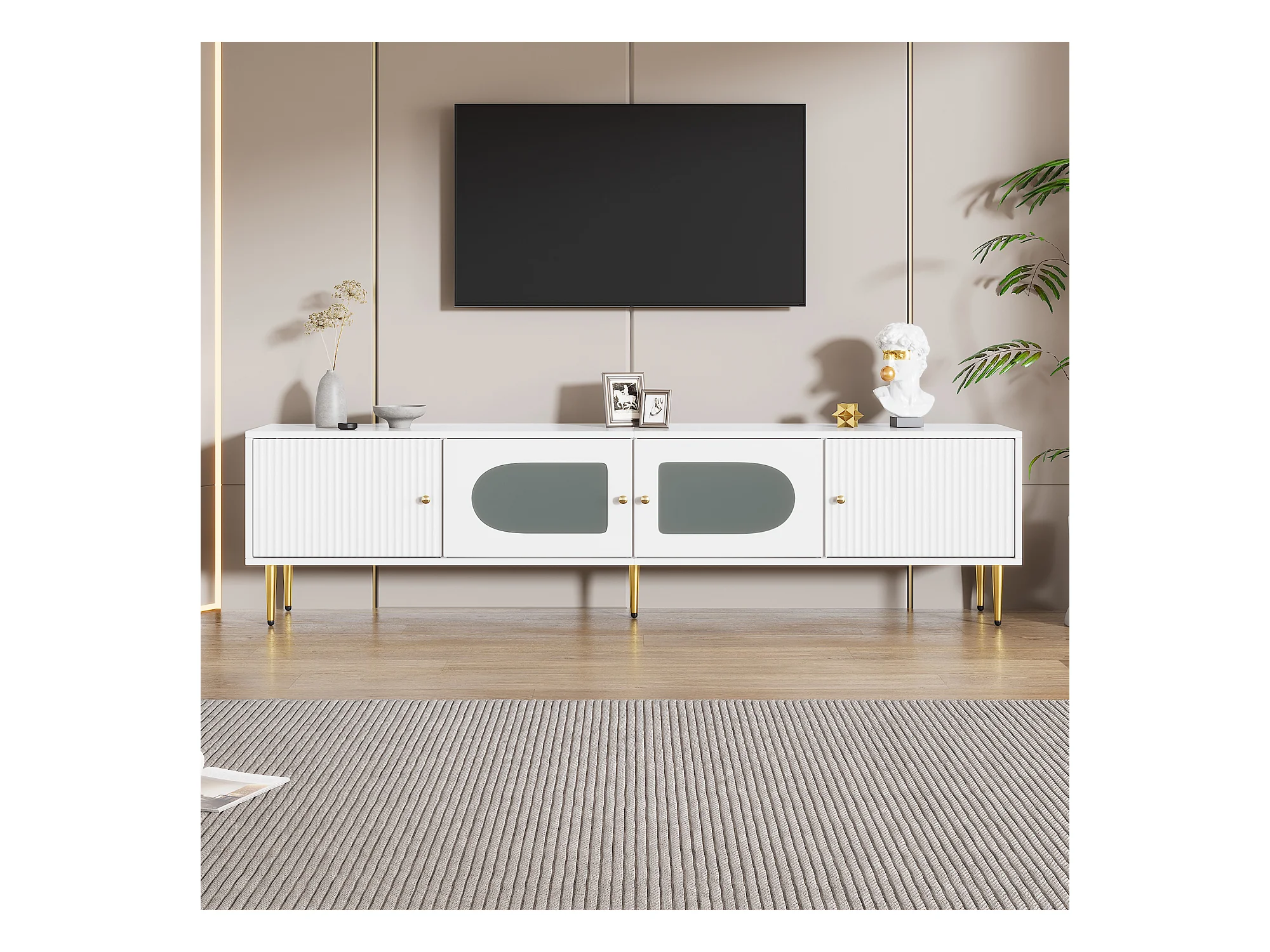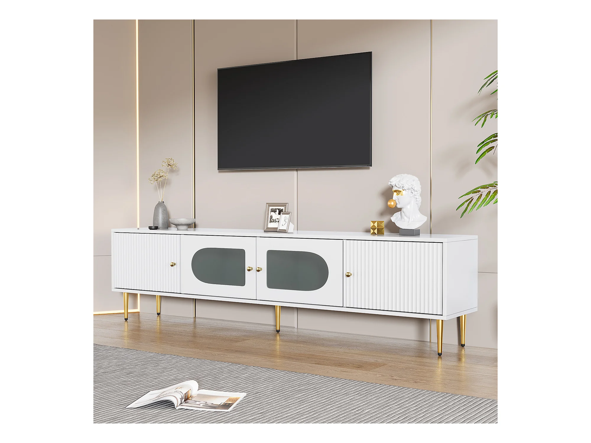 Mueble de TV blanco de 170 cm con patas doradas, 4 puertas, cristal curvo, moderno, para sala de estar.