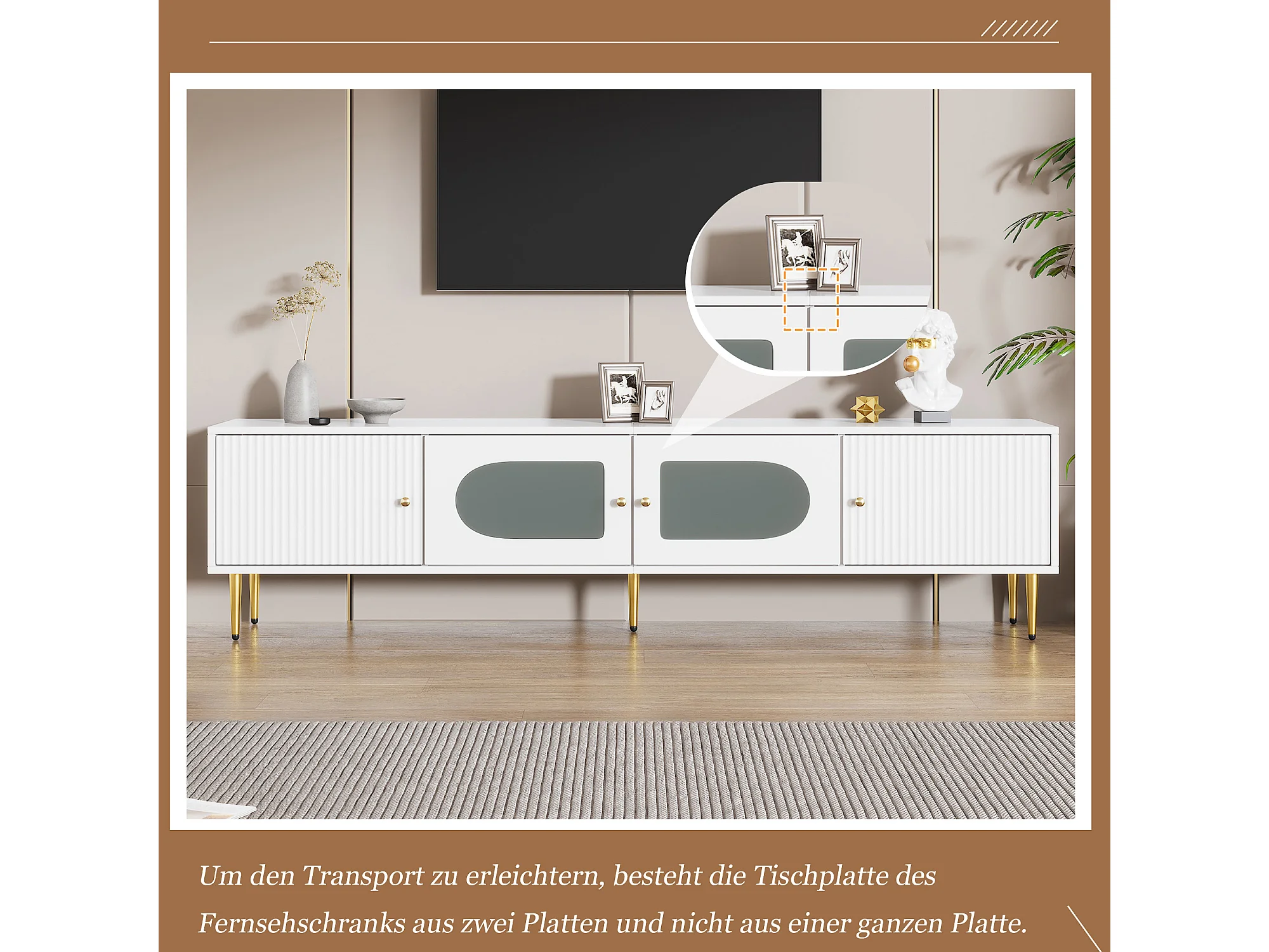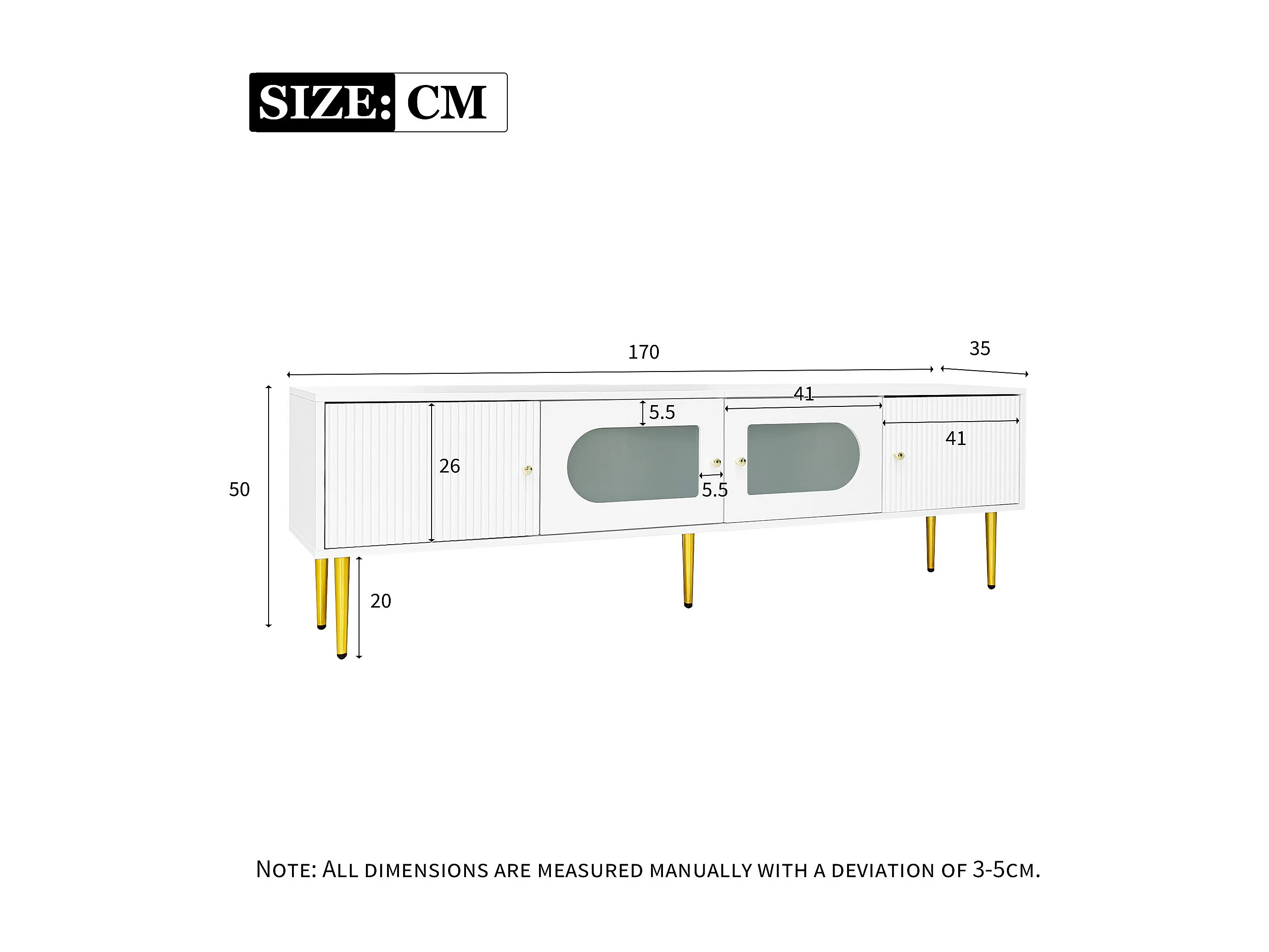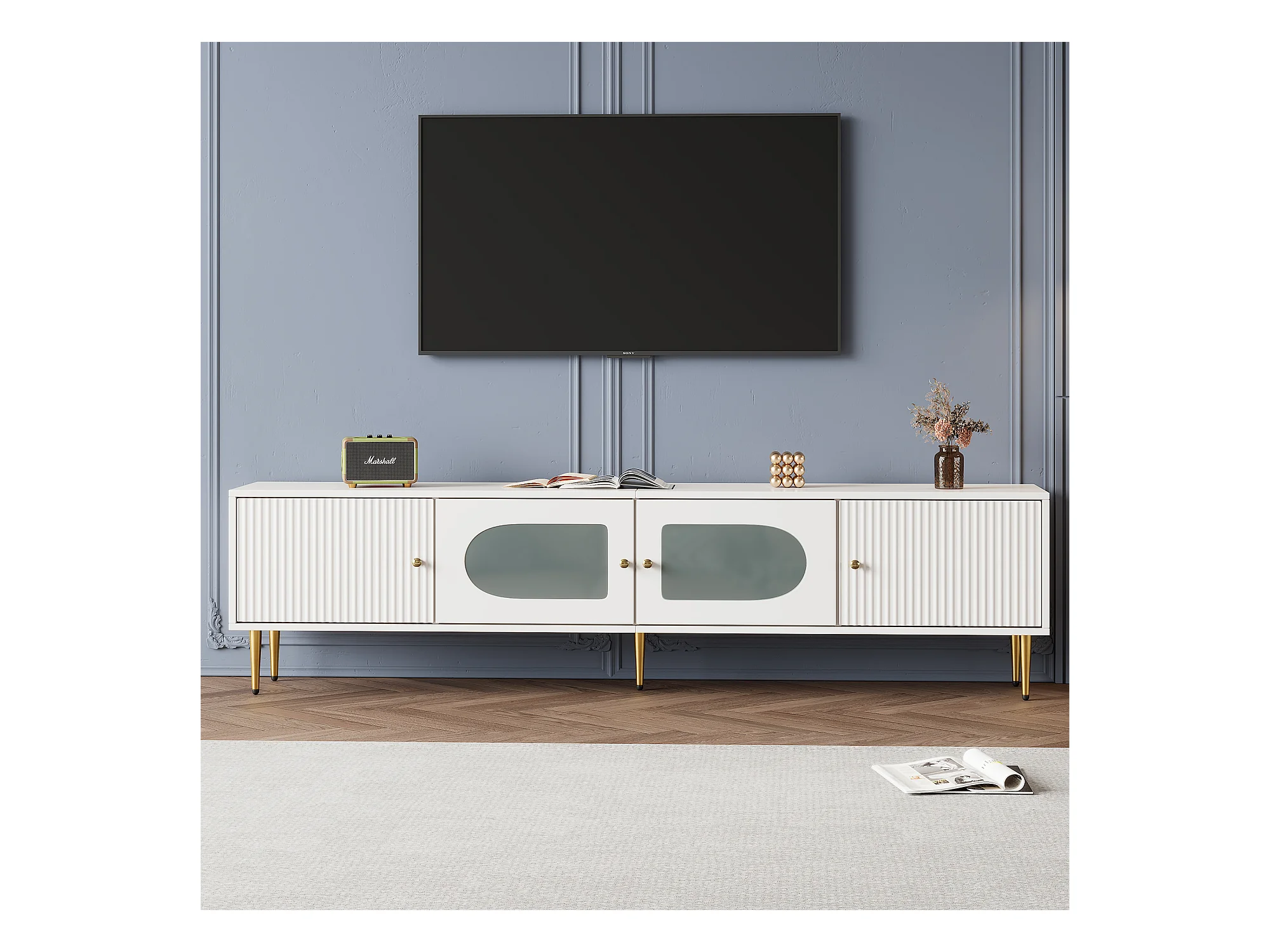 Mueble de TV blanco de 170 cm con patas doradas, 4 puertas, cristal curvo, moderno, para sala de estar.