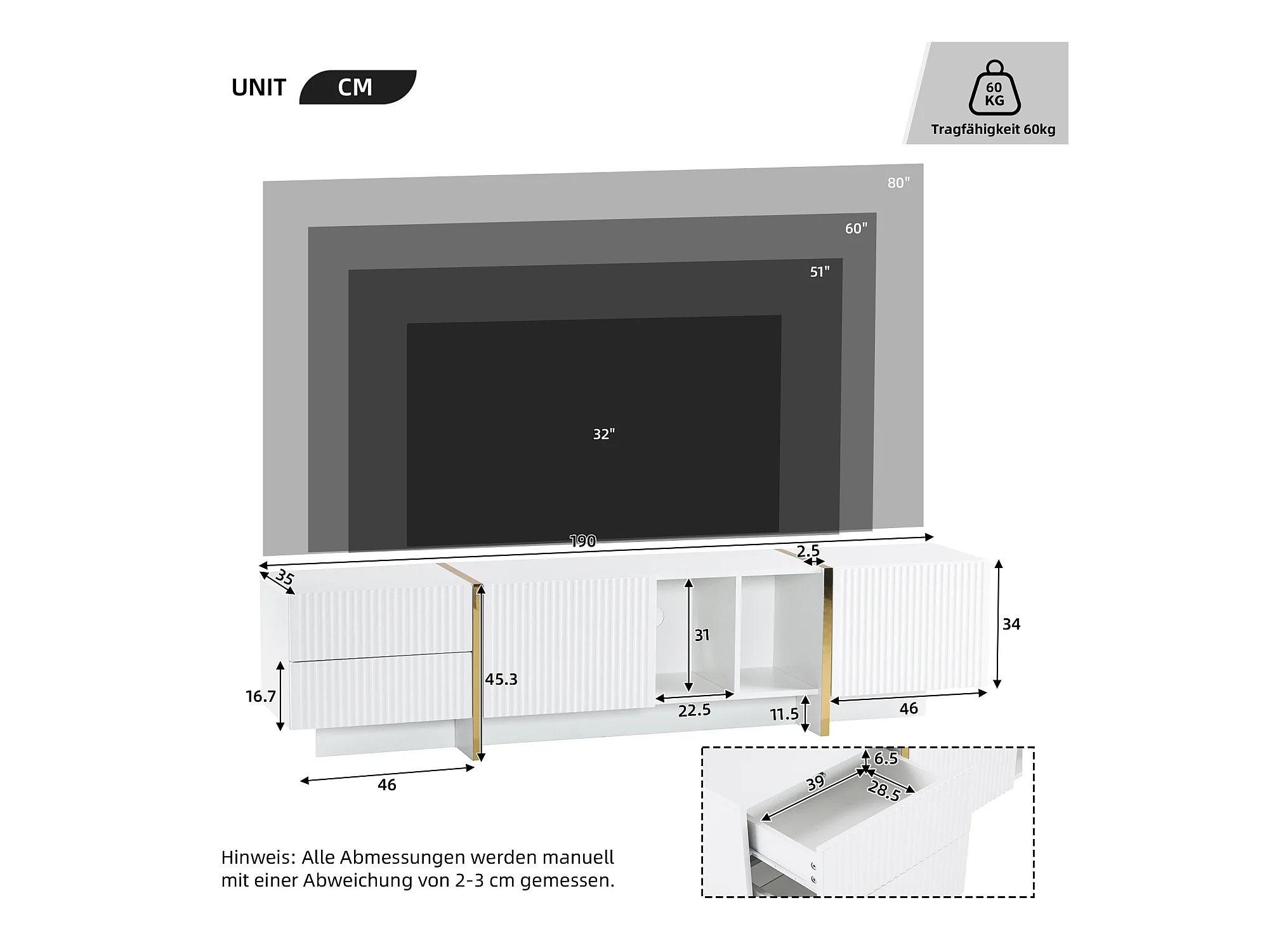 Mueble de TV blanco de 190 cm, diseño moderno, 2 puertas, 2 cajones, almacenamiento para TV de 80 pulgadas