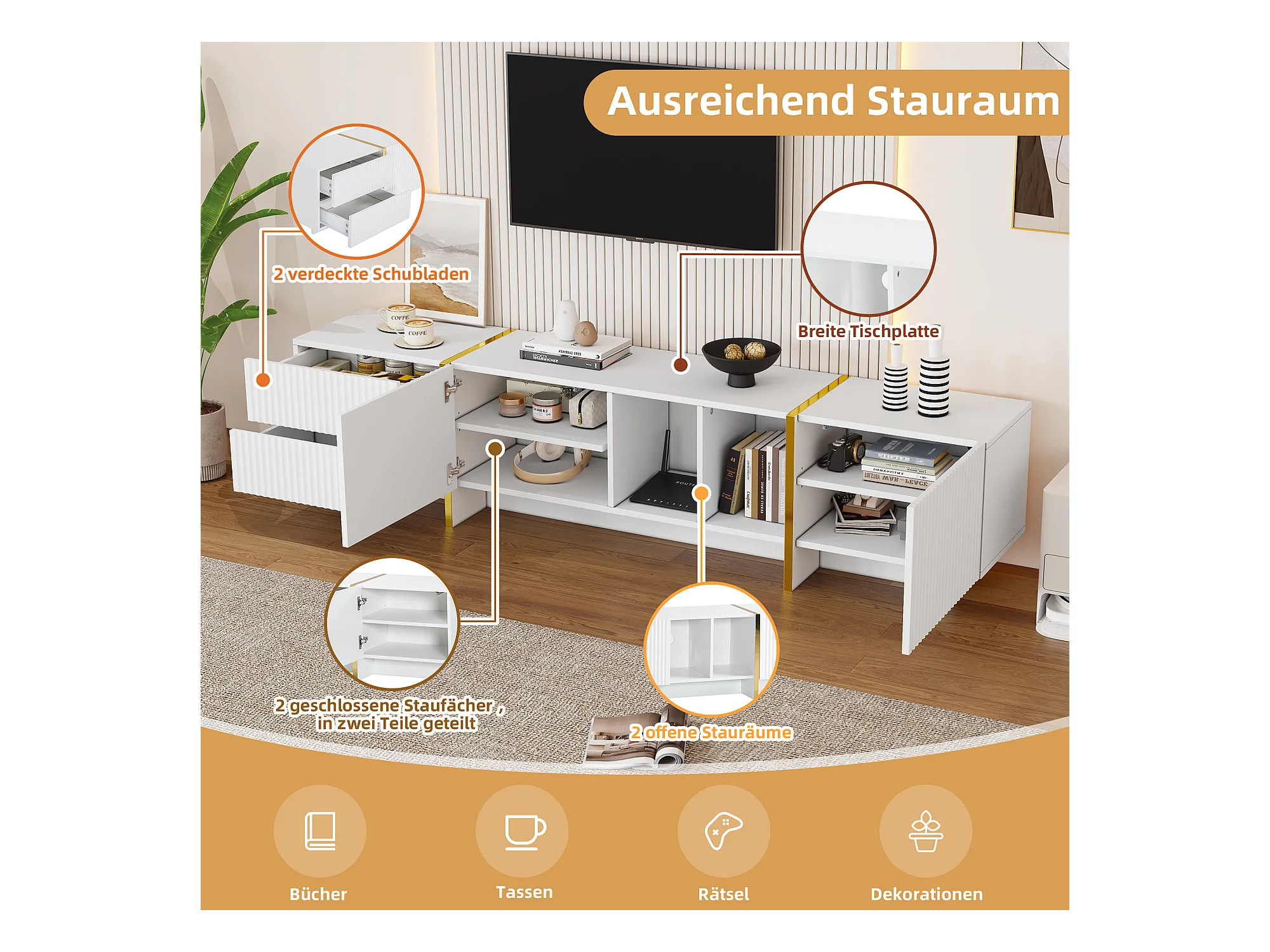 Mueble de TV blanco con múltiples espacios de almacenamiento, moderno vertical mate, líneas doradas, 190 x 35 x 45 cm, blanco