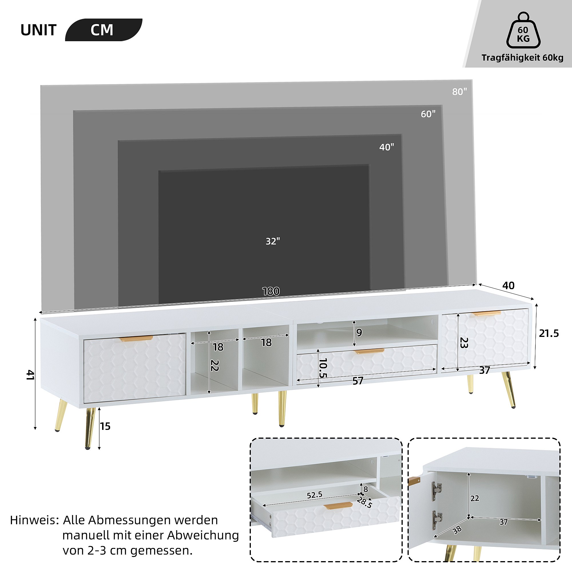 Mueble de TV blanco, diseño de panal mate, compartimento, puertas, cajón, capacidad de carga: 60 kg, 180 x 40 x 41 cm