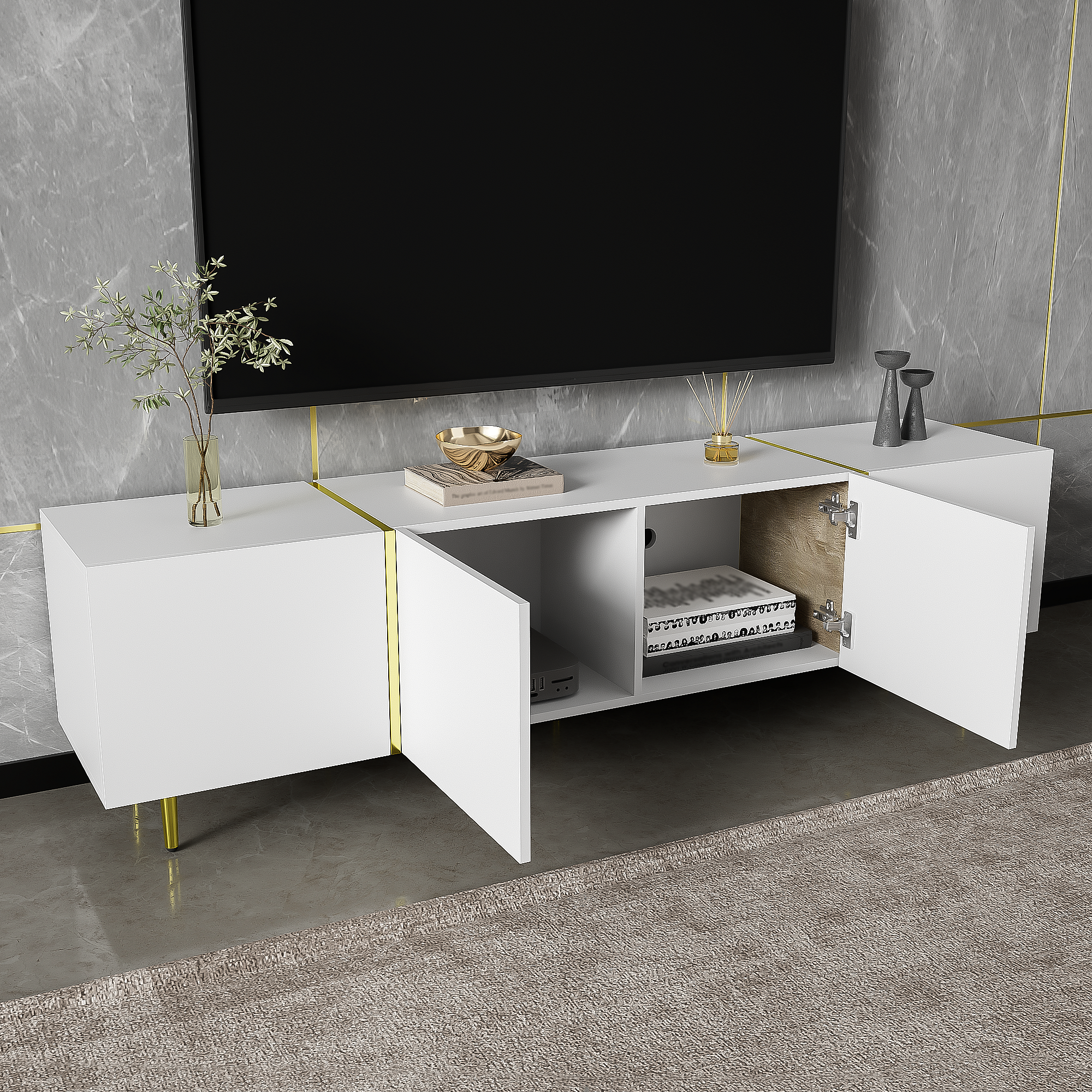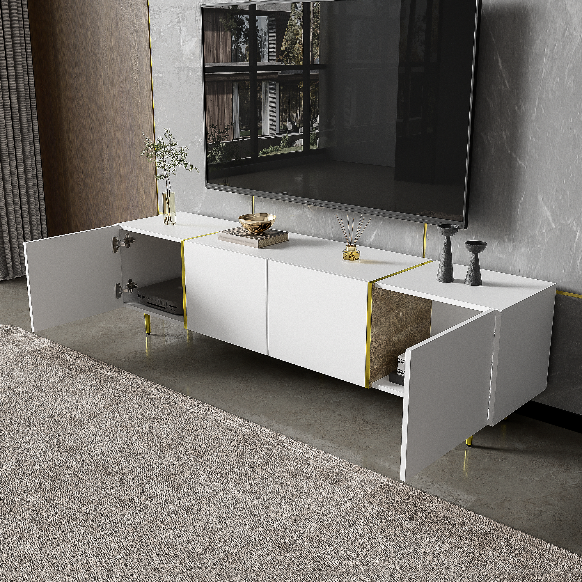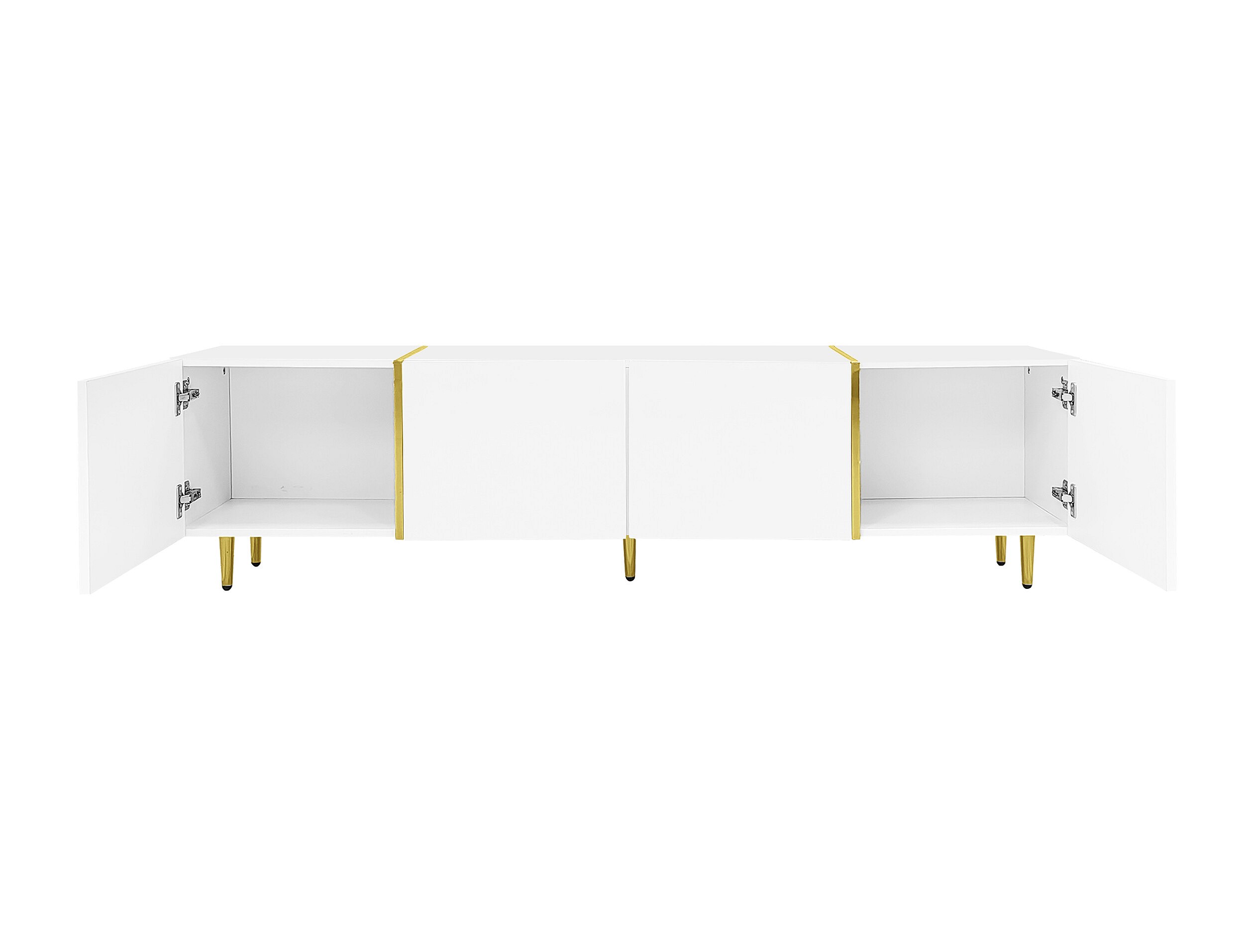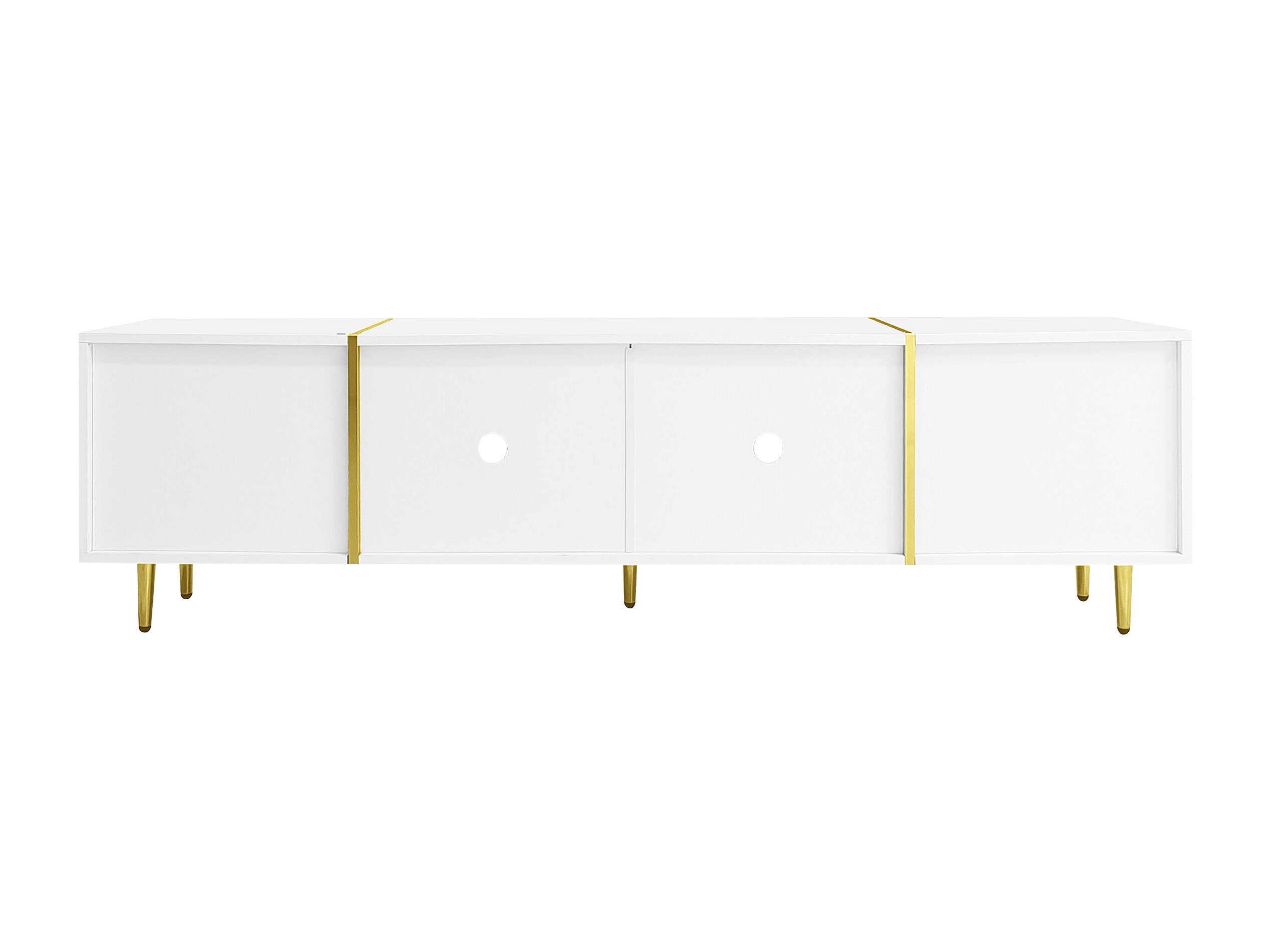 Mueble de TV blanco de 170 cm con patas doradas, 4 puertas, cristal curvo, moderno, para sala de estar.