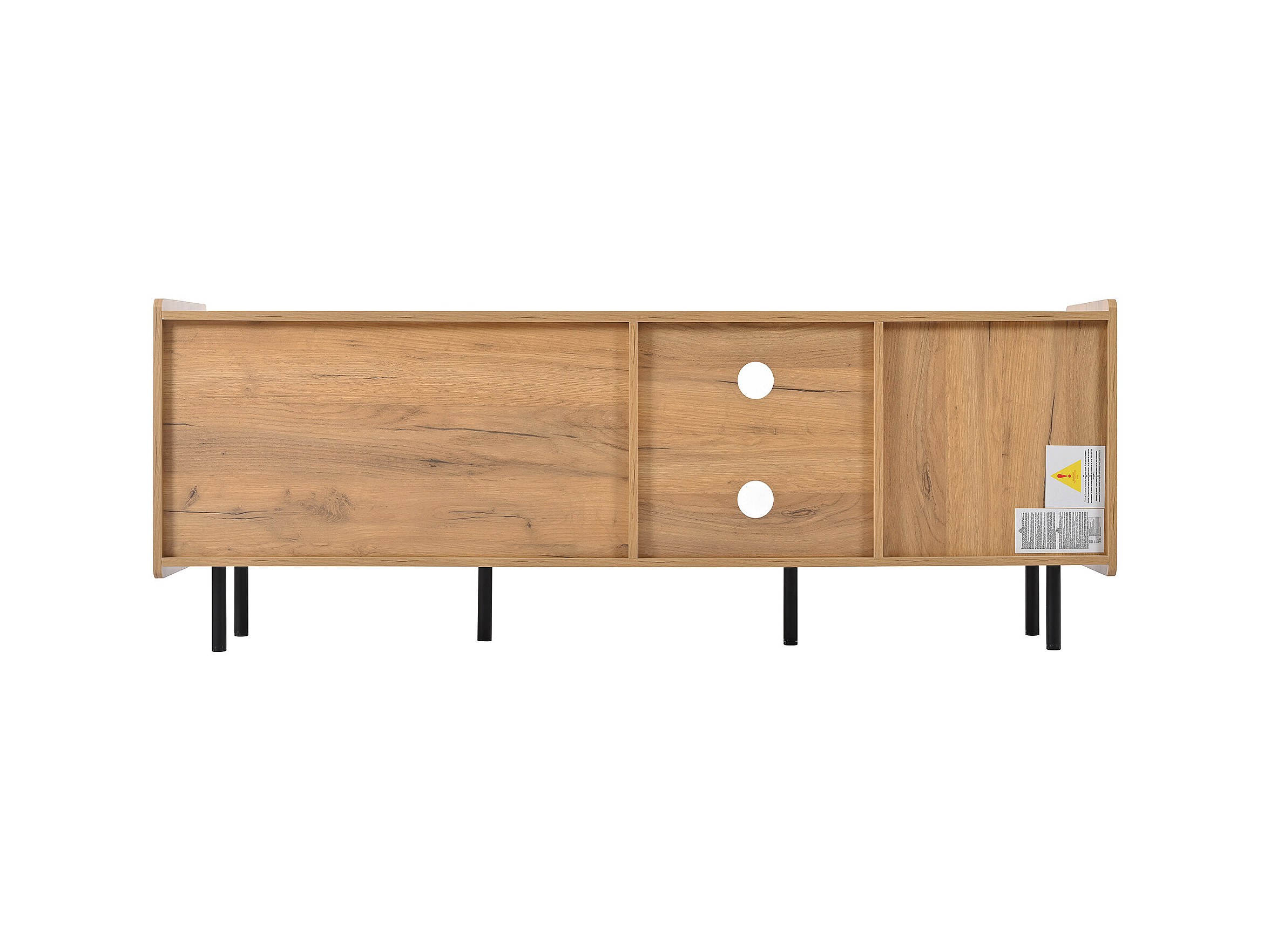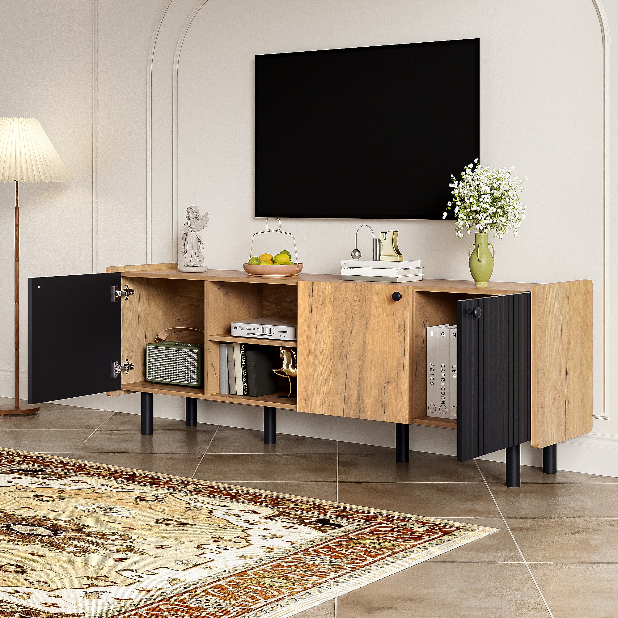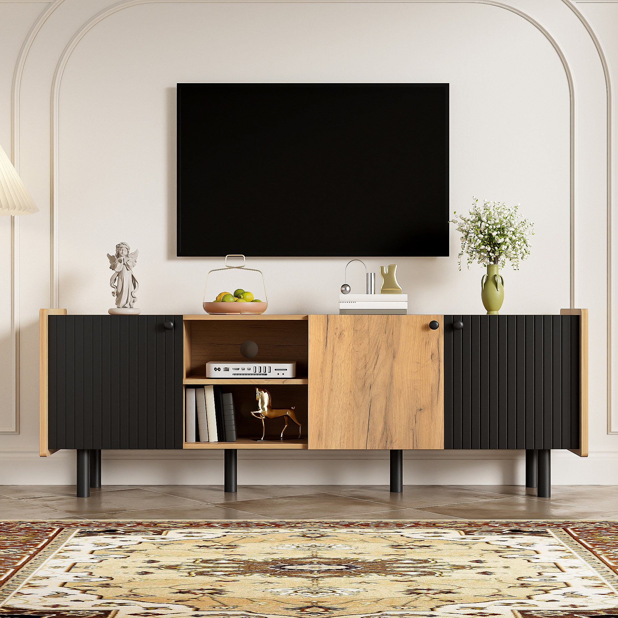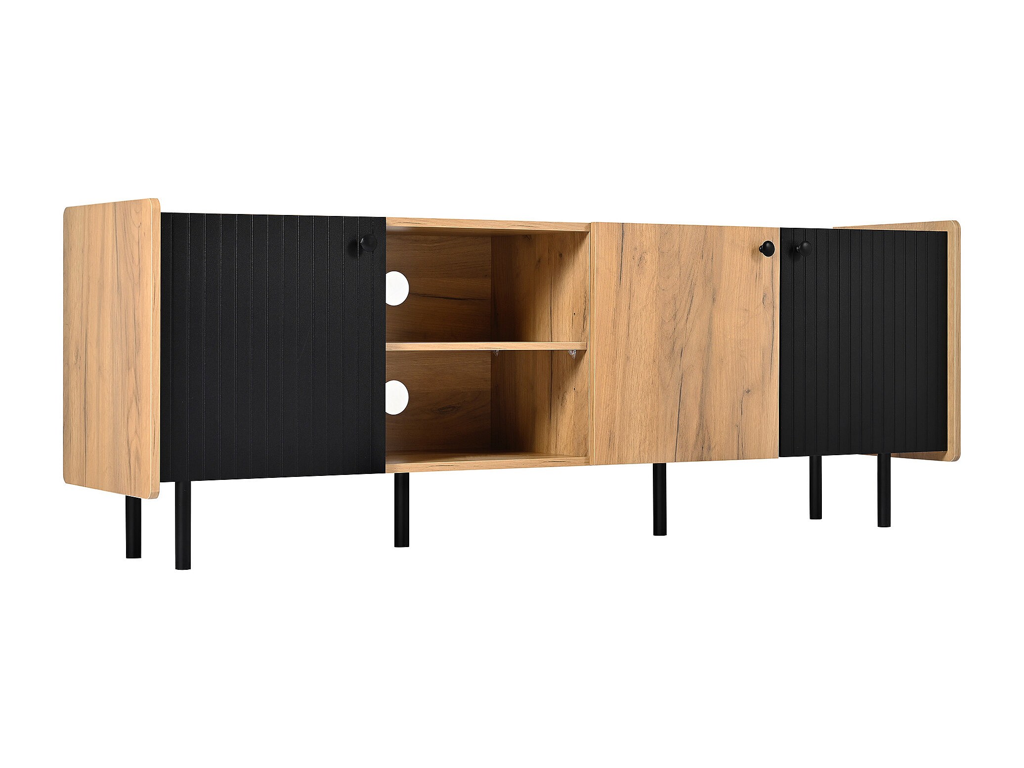 Mueble de TV, color negro y madera, con 3 puertas, 2 compartimentos abiertos, 160 cm de largo