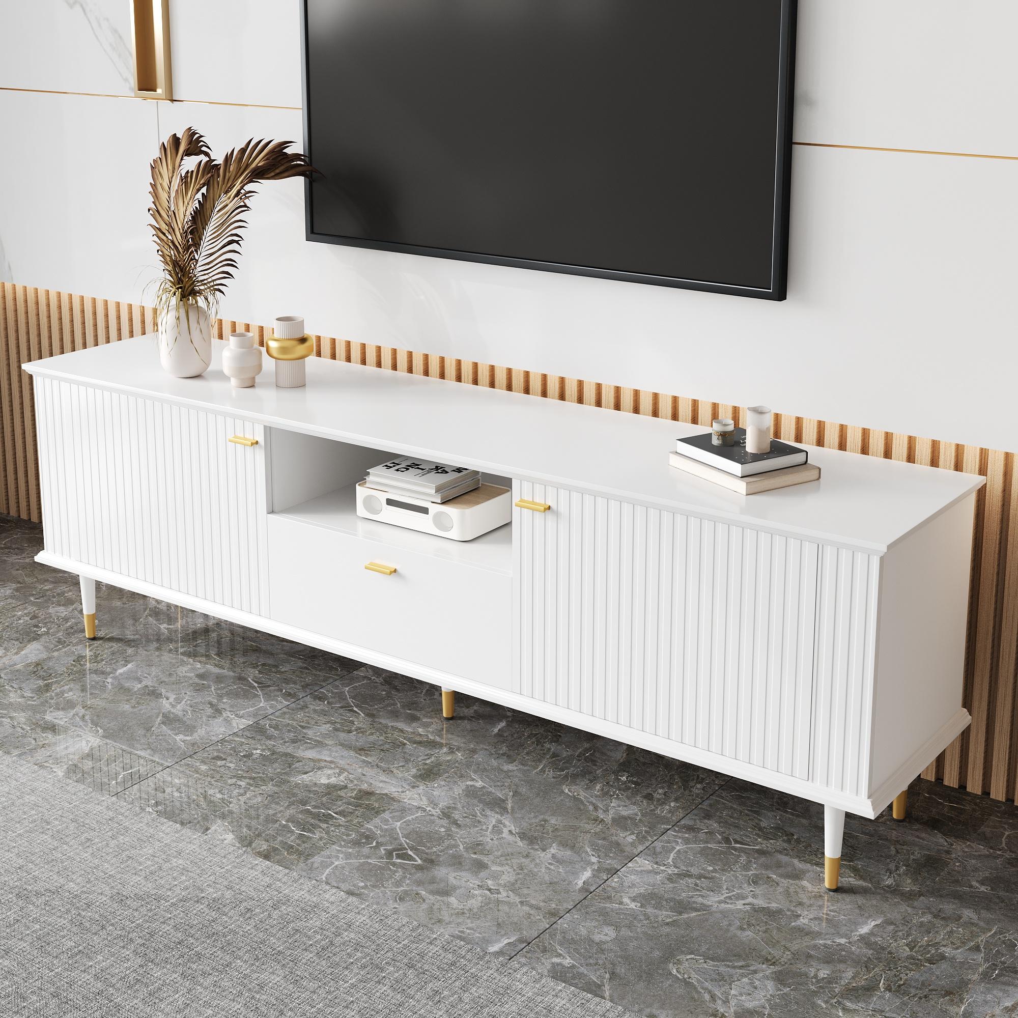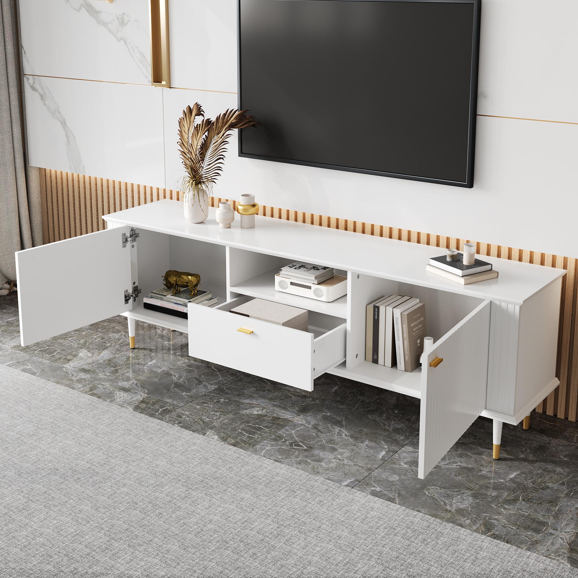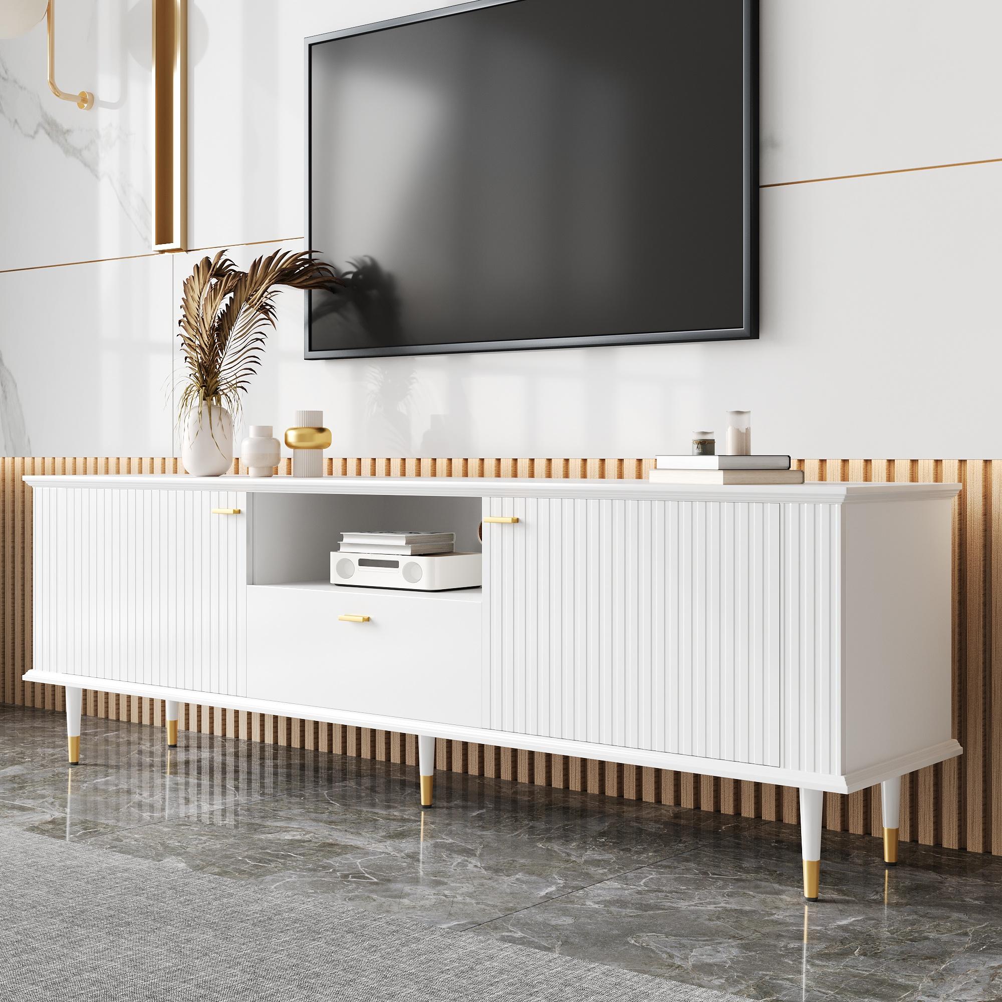 Mueble de TV con 3 puertas, cajones y estantes regulables, patas doradas, MDF, blanco (170x36x55 cm)