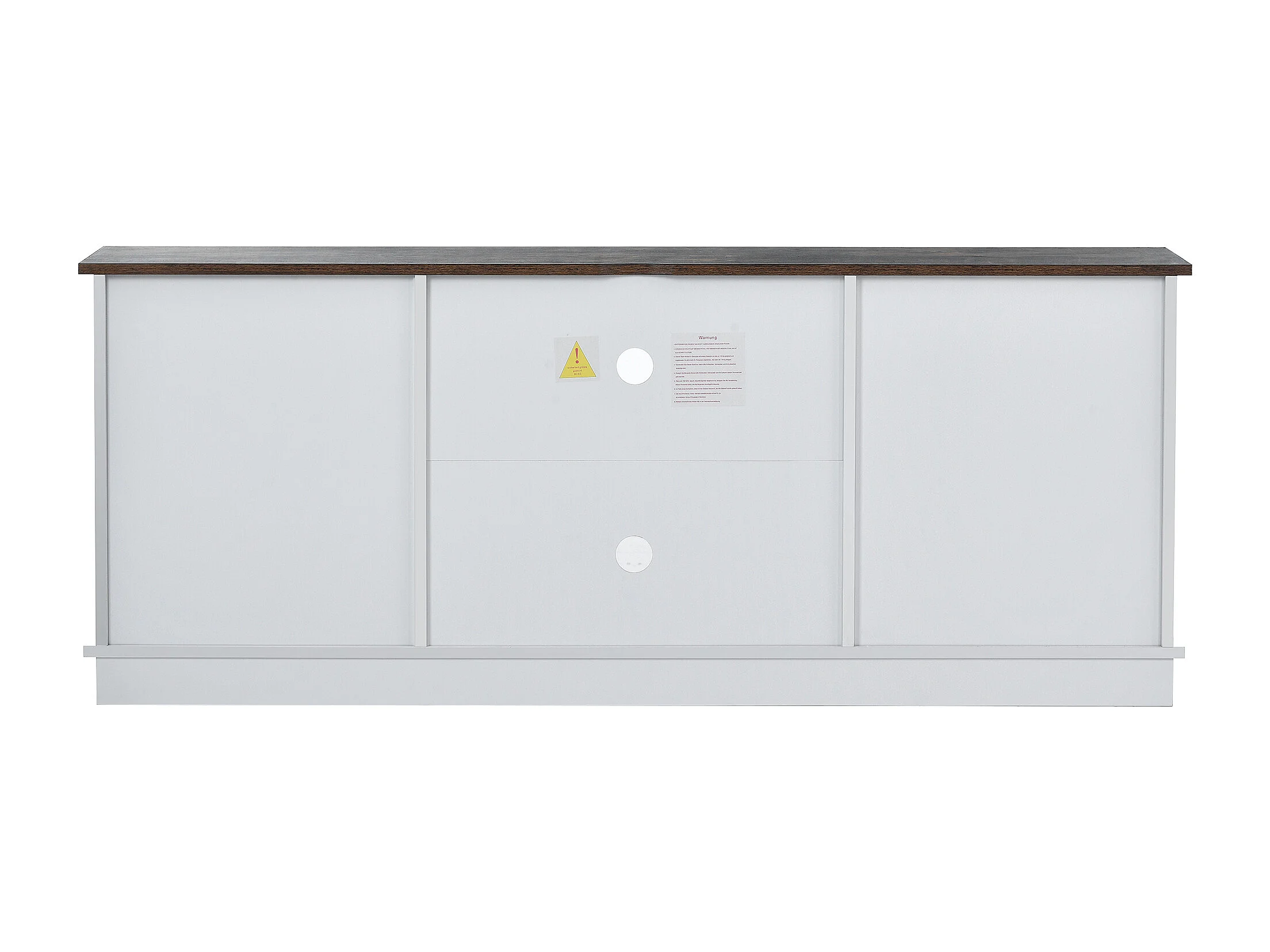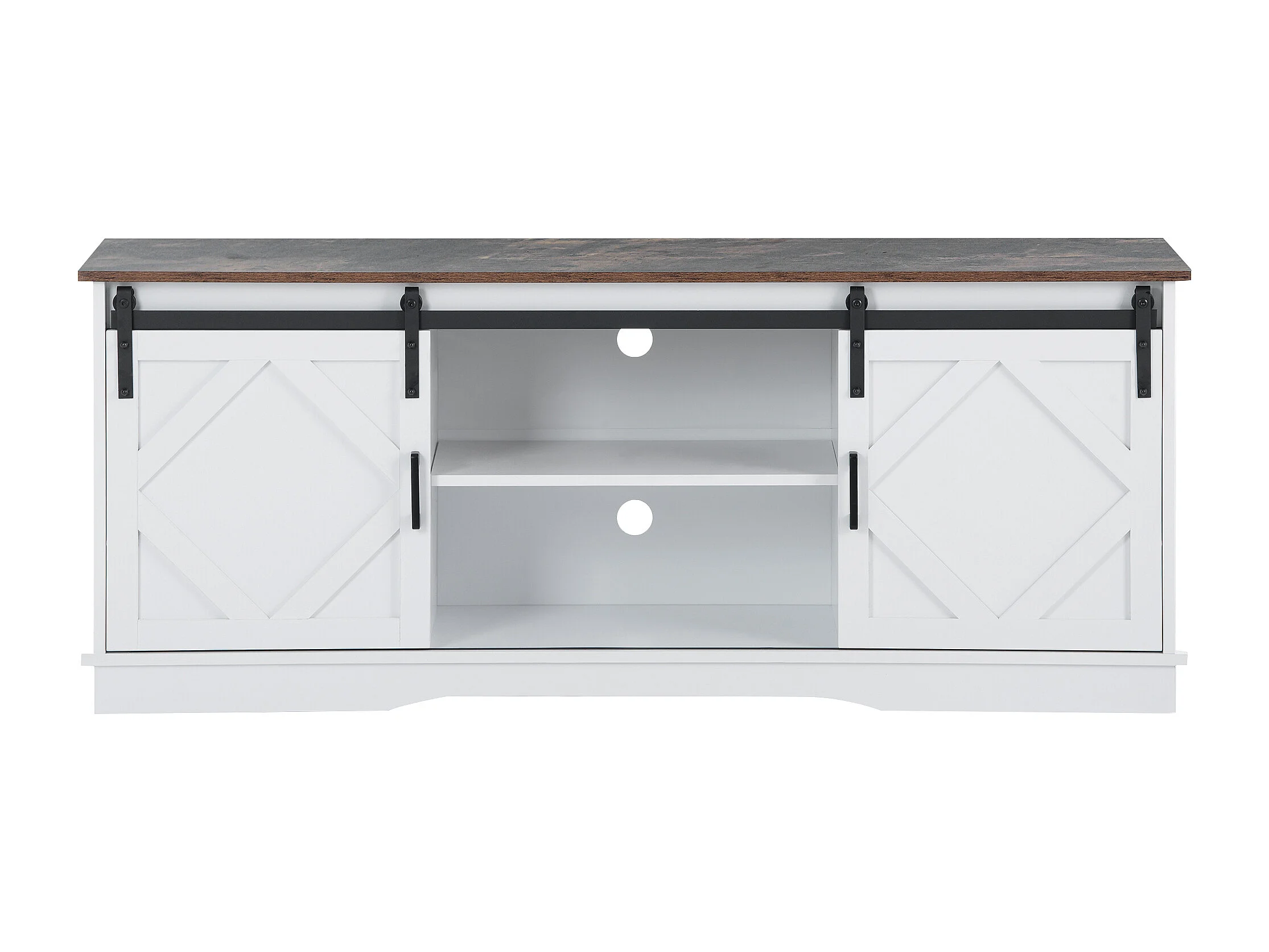 Mueble de TV con 2 cajones y 2 puertas correderas, puerta a rayas, blanco y madera