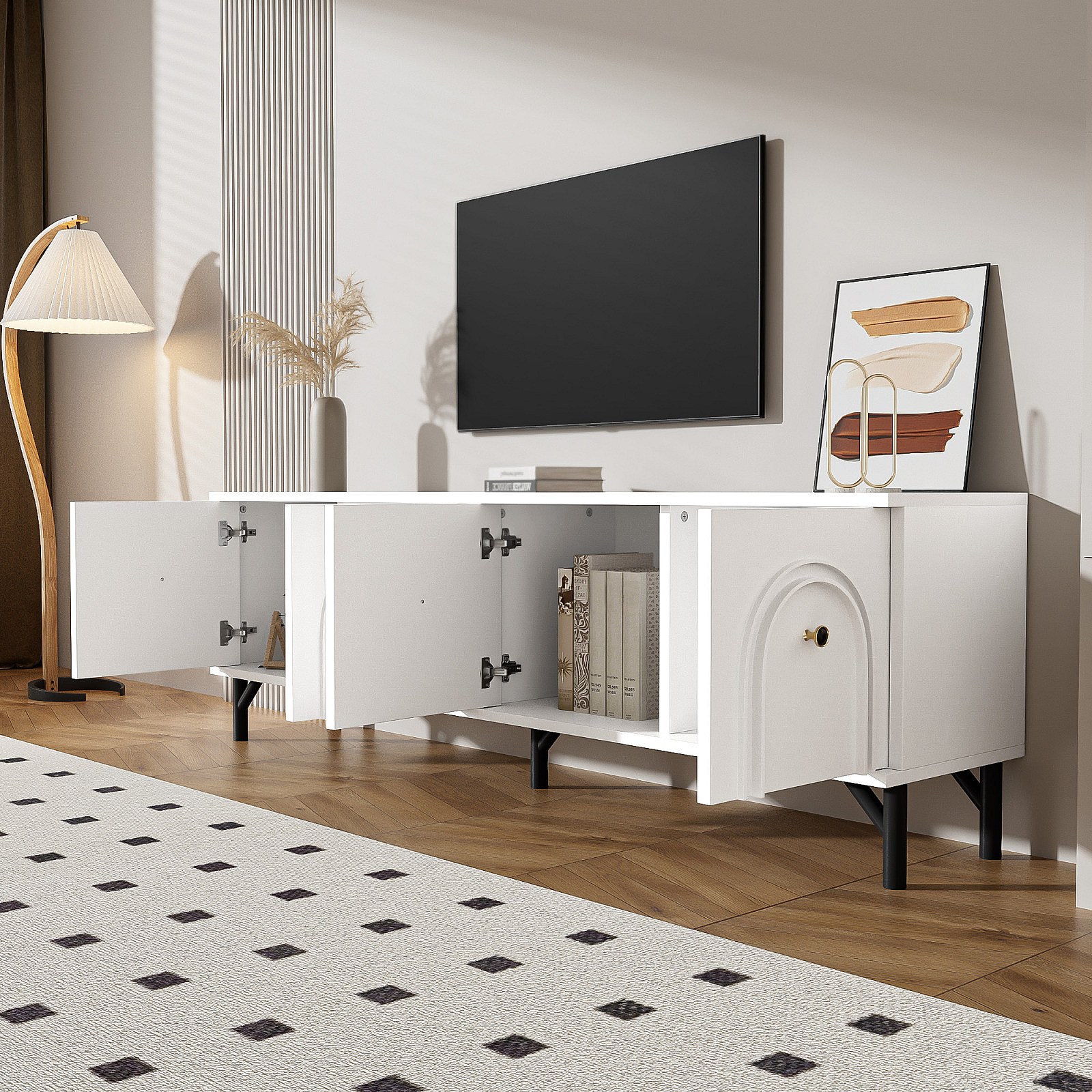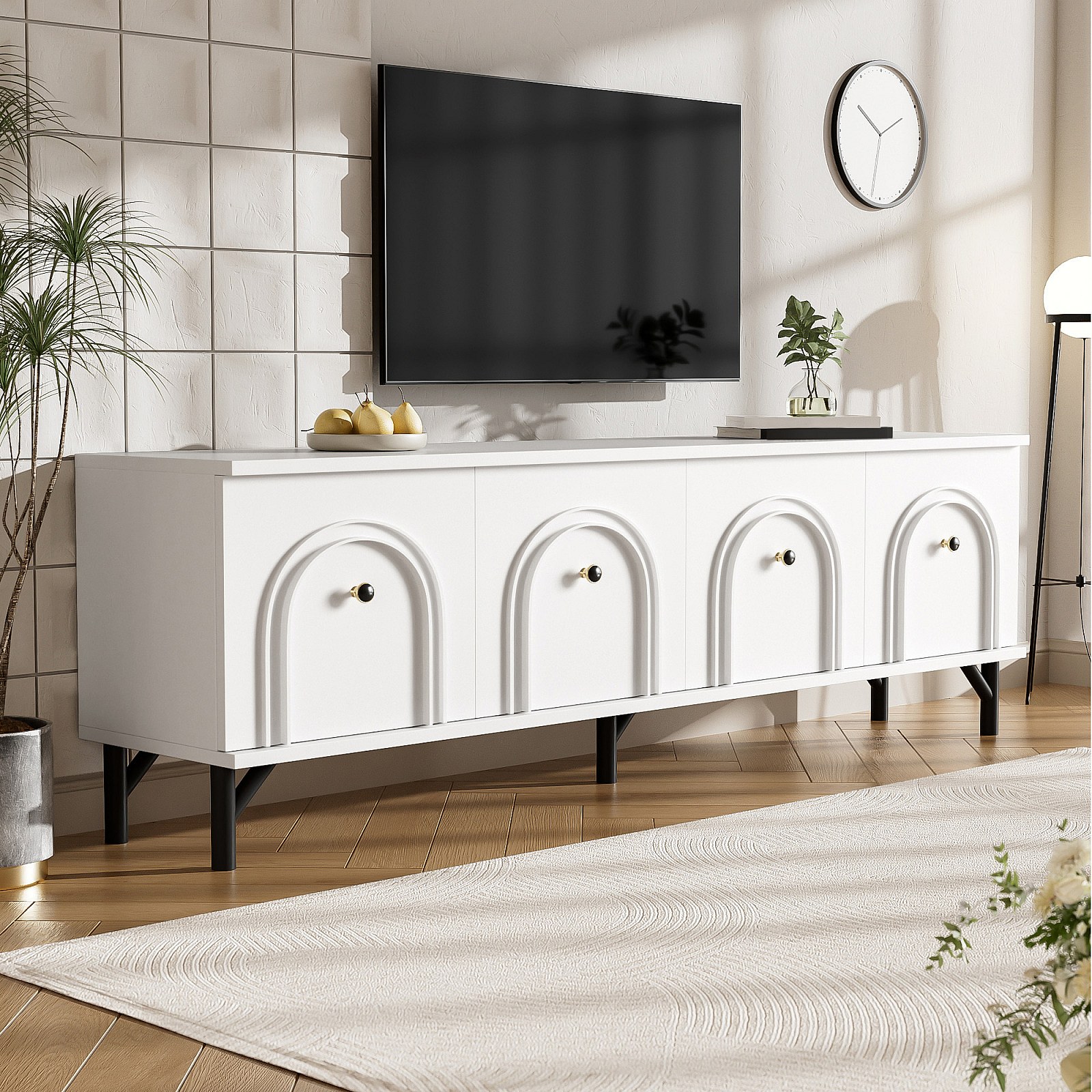 Soporte de TV blanco de 160 cm, diseño minimalista, 4 patas para TV de 65 pulgadas, sala de estar