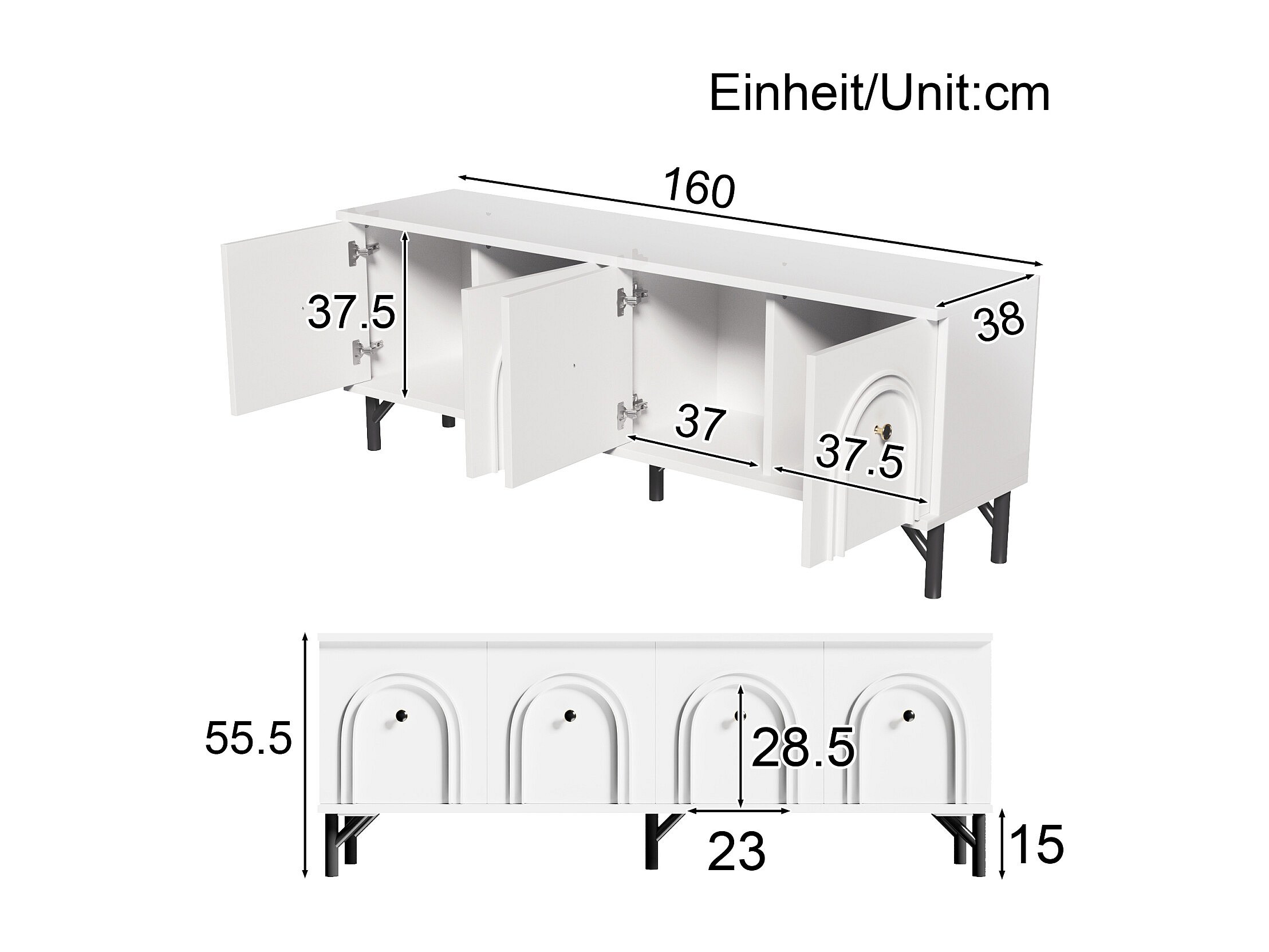 Mueble de TV con 4 puertas, mueble de almacenaje con 5 patas, blanco, 160 x 38 x 55,5 cm