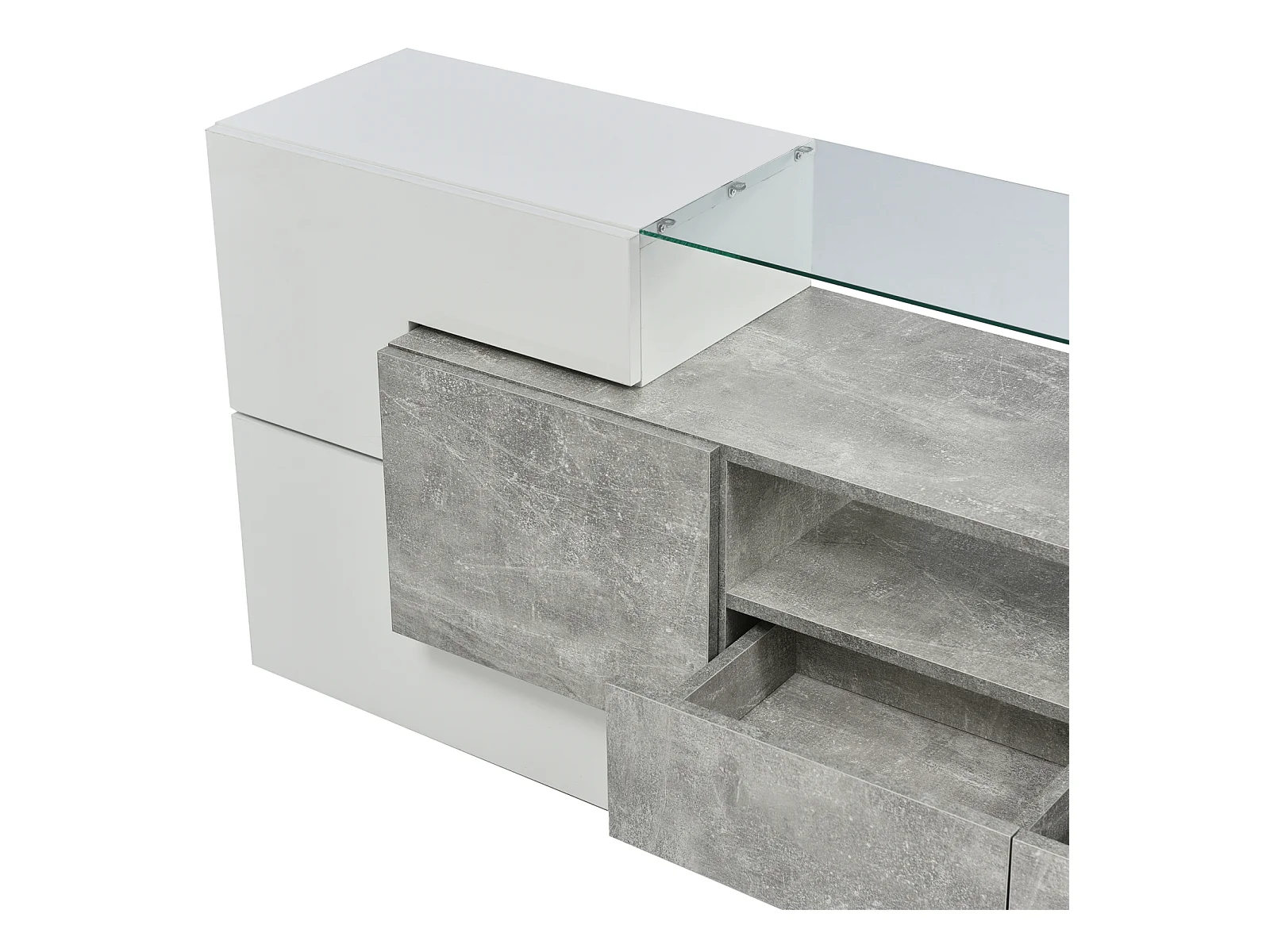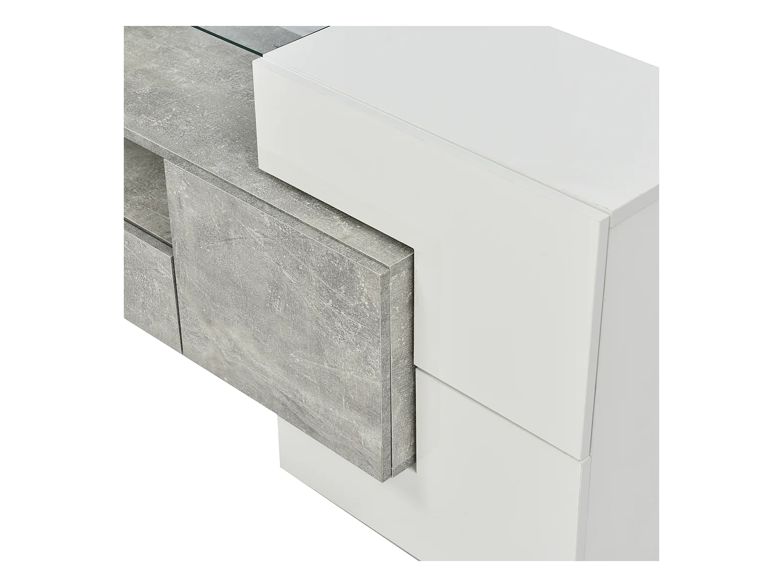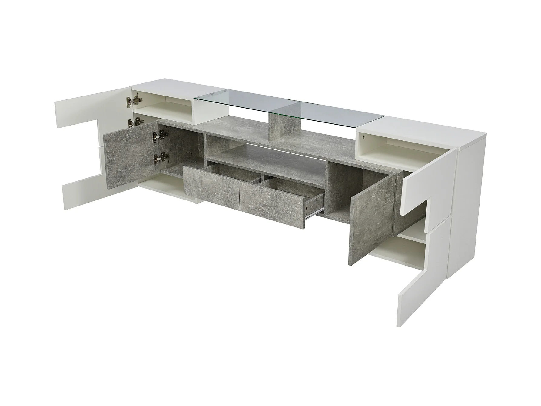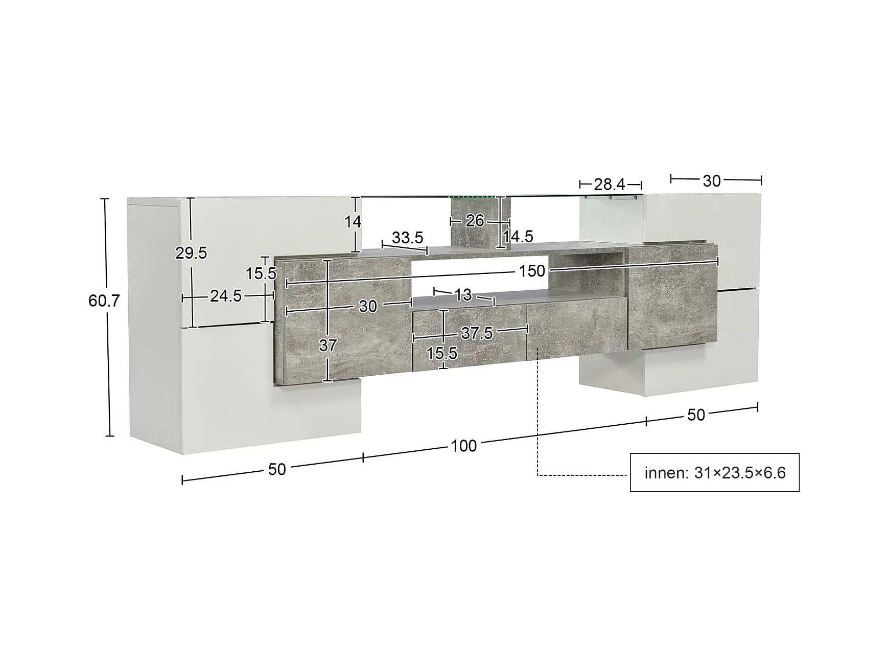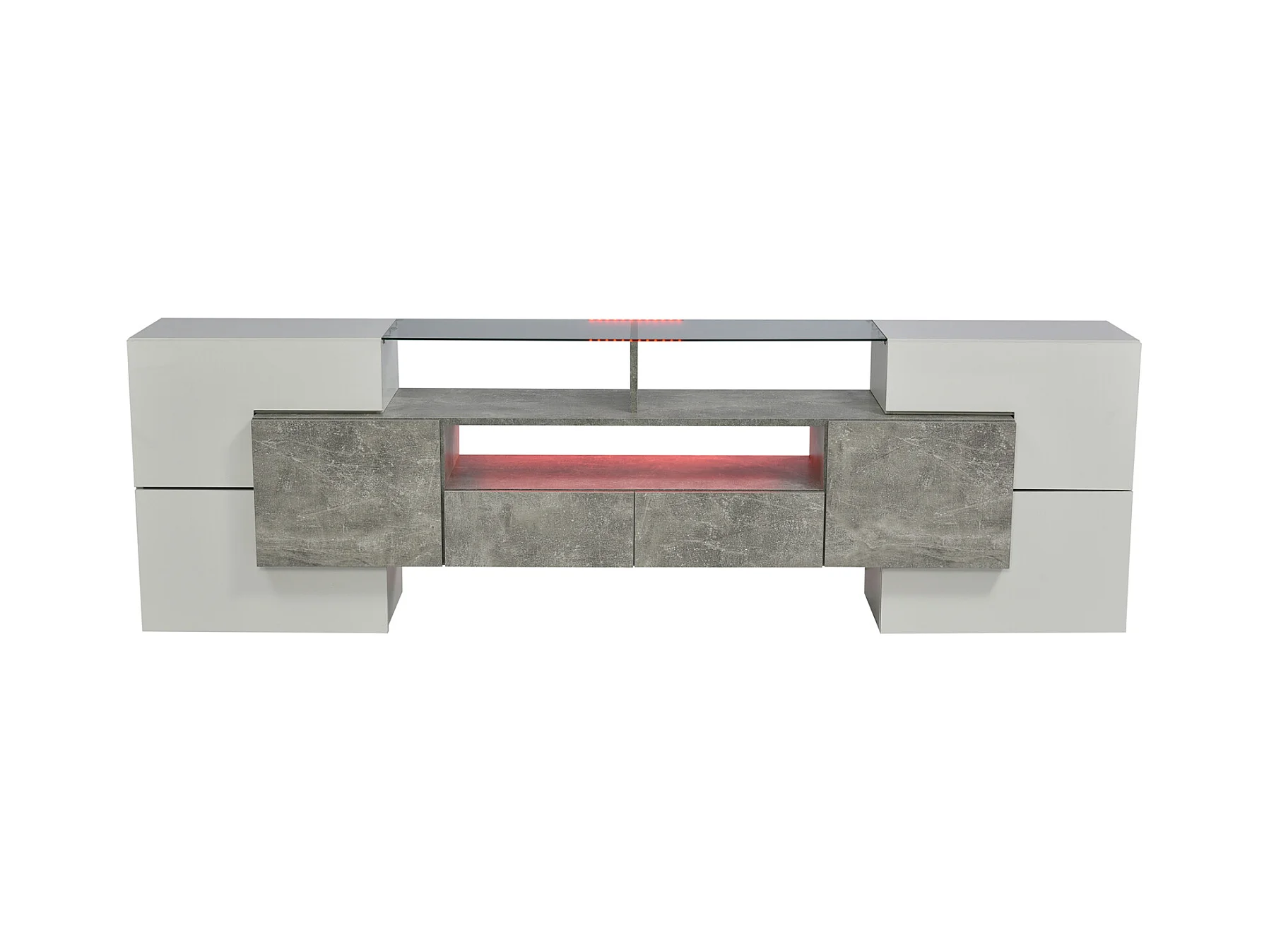 Mueble de TV con almacenaje, 6 puertas y 2 cajones, moderno mueble de TV con luz LED, gris y blanco