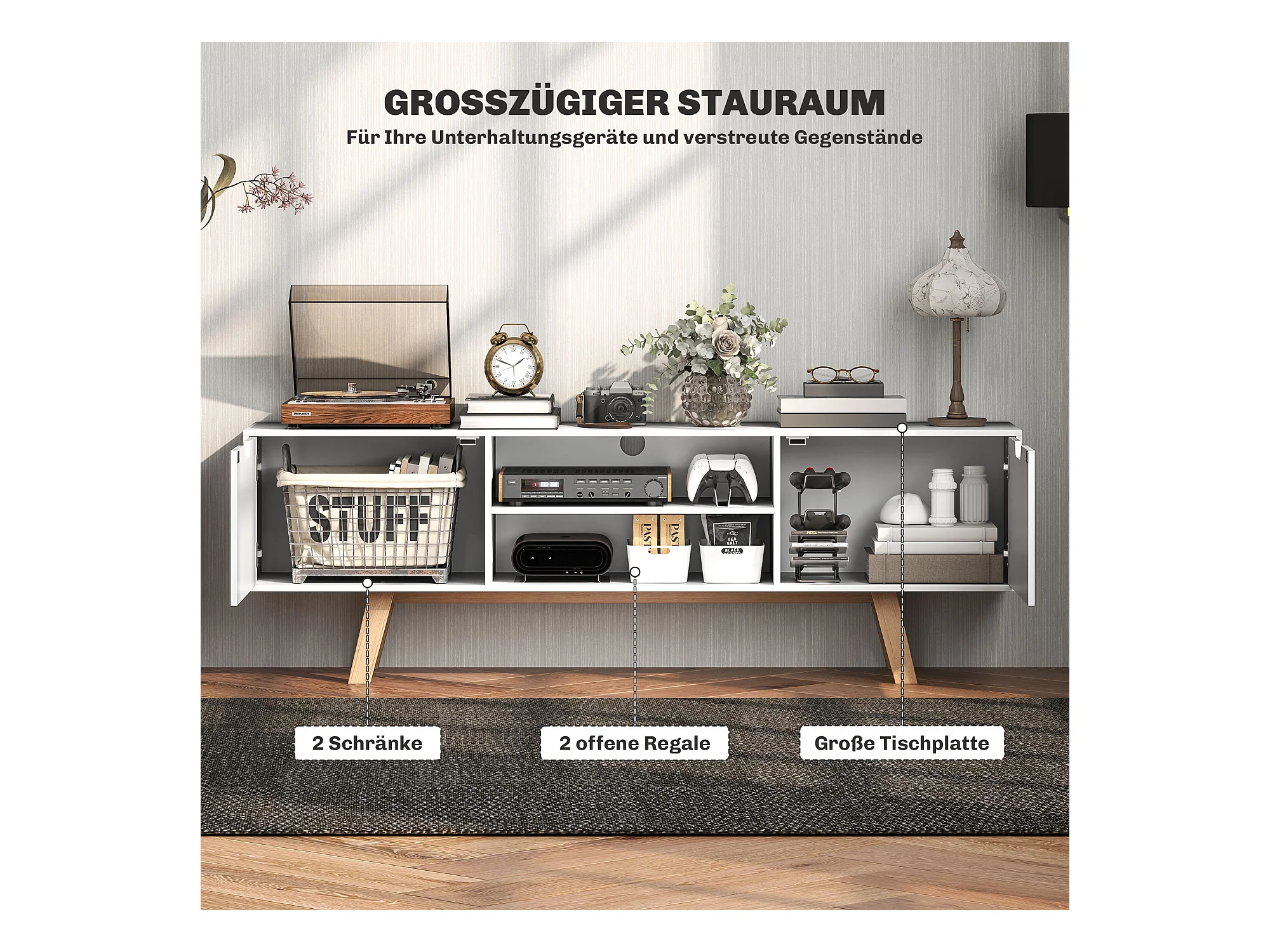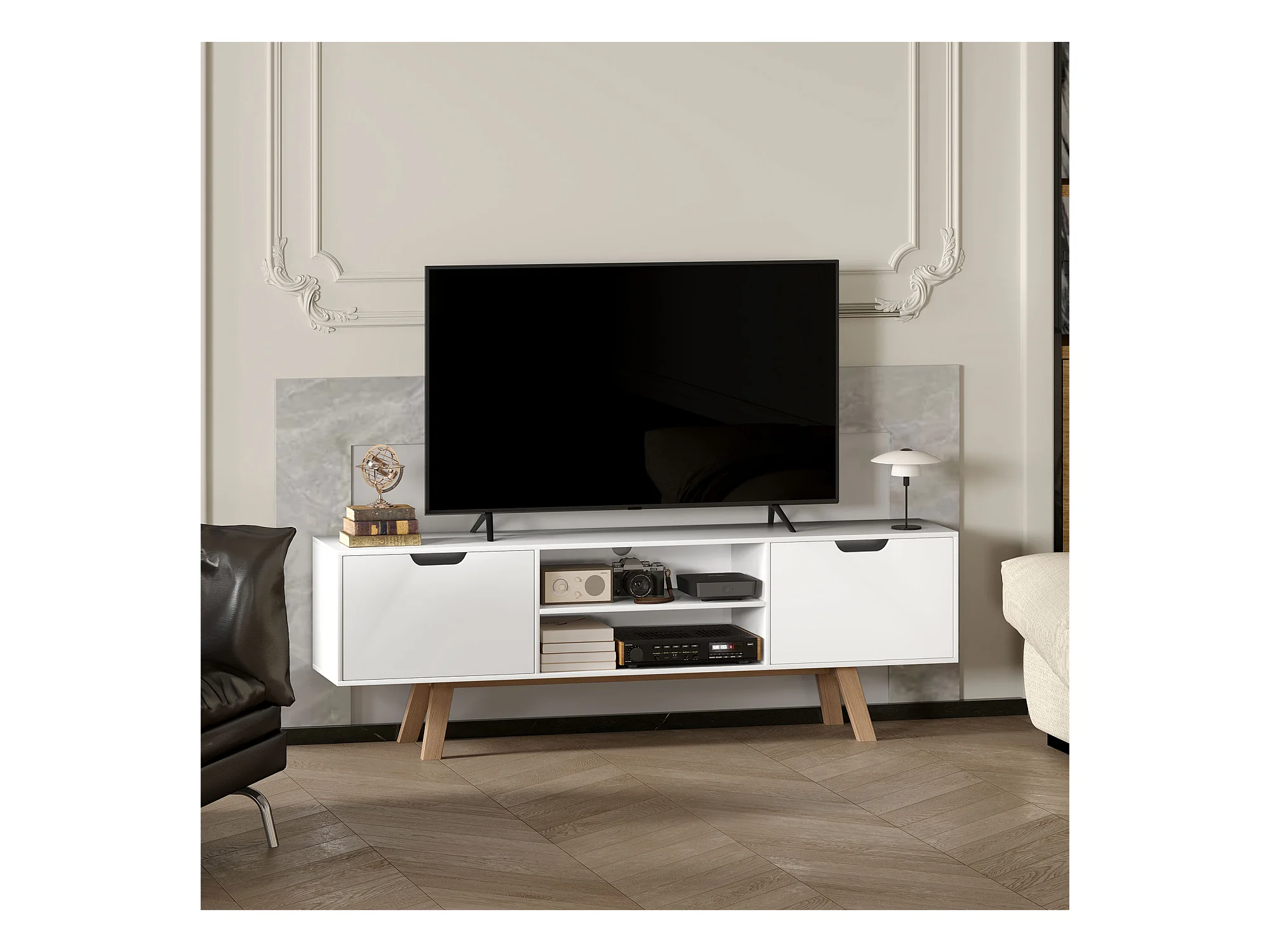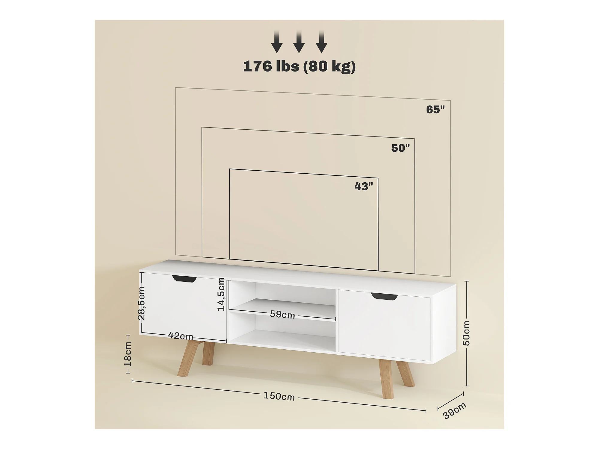 Mueble de TV con base de madera, moderno, escandinavo, 2 puertas, 2 nichos, color blanco, 150 x 39 x 50 cm