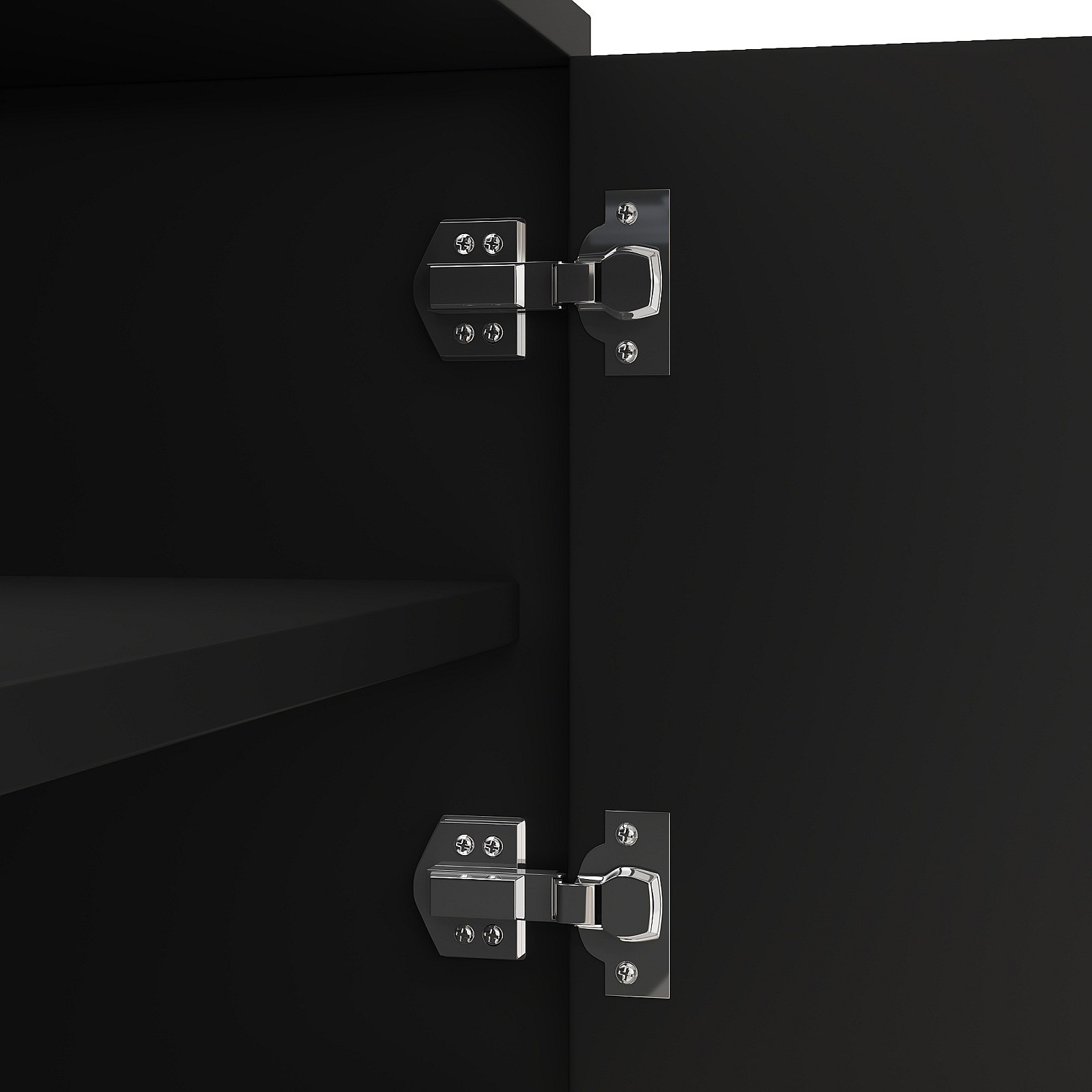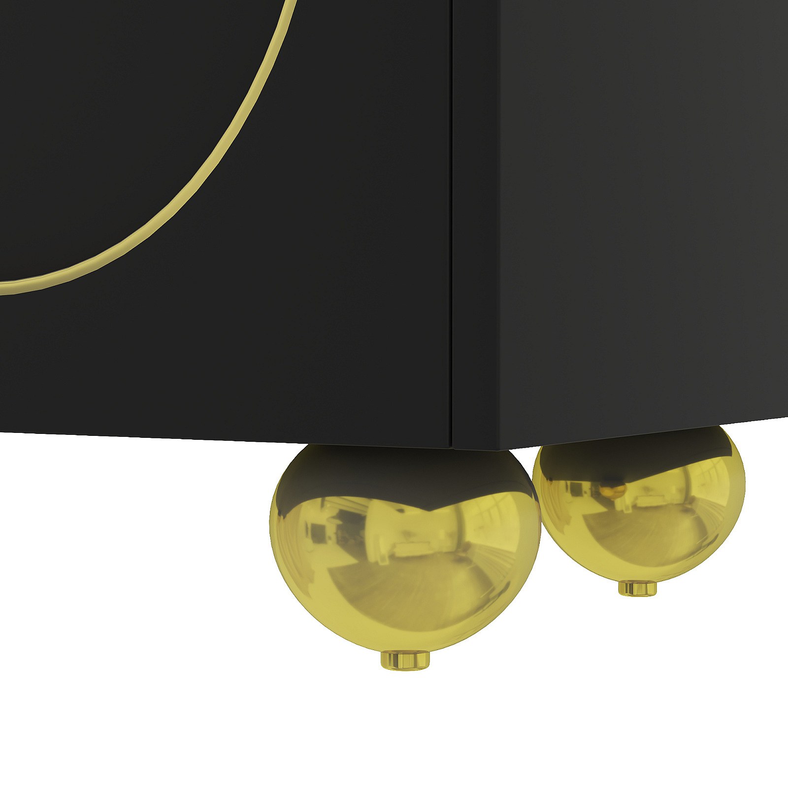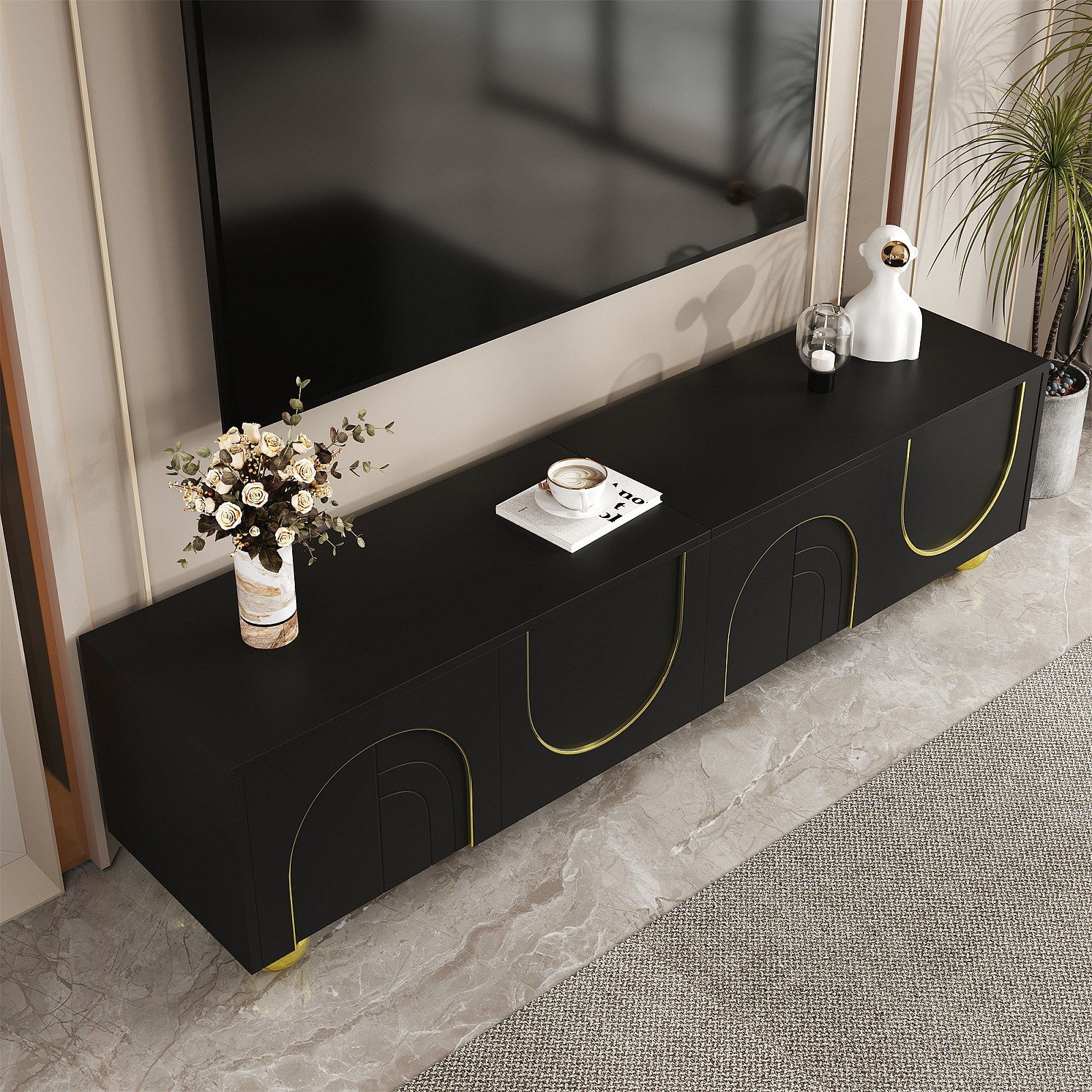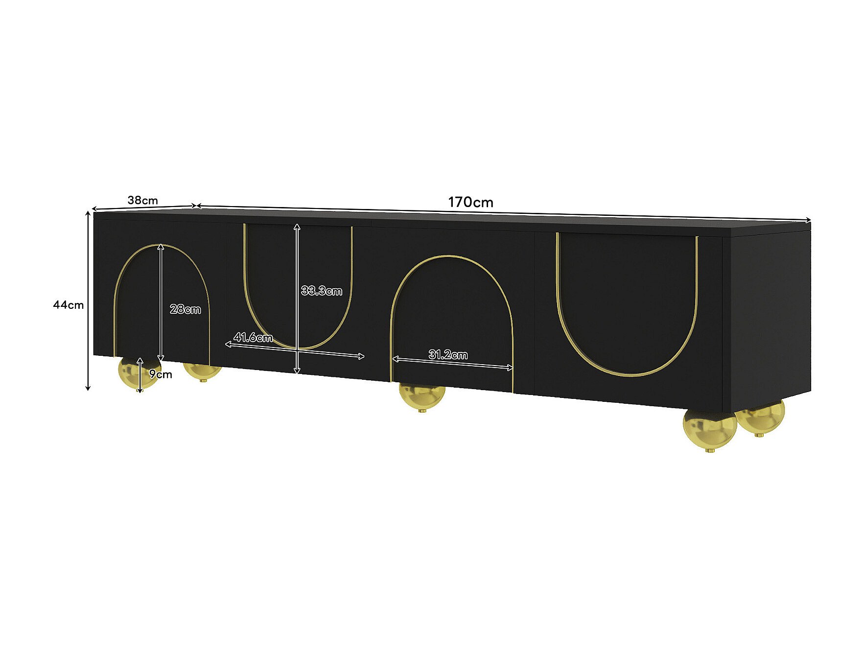 Mueble TV de MDF negro y dorado de 170 cm, 4 puertas con estantes y patas redondas para salón