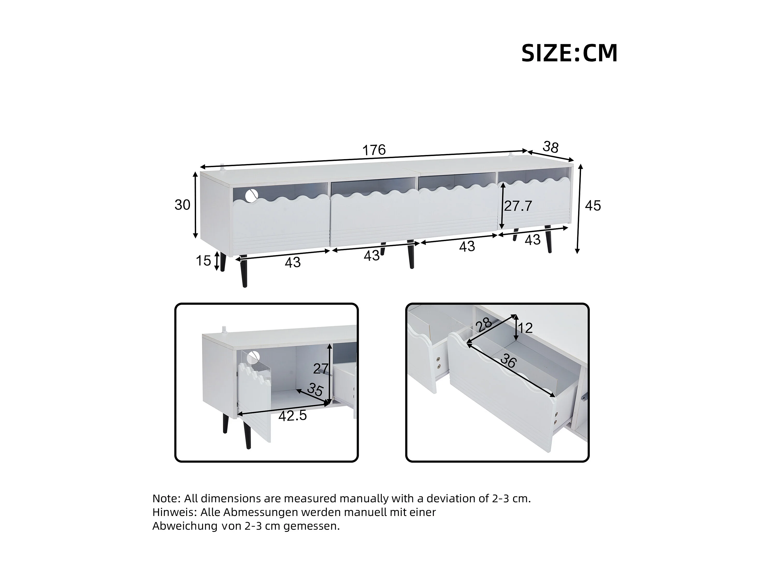 Mueble de TV moderno con aspecto de madera de 178 cm: diseño minimalista, gran capacidad de almacenamiento, 4 cajones, blanco