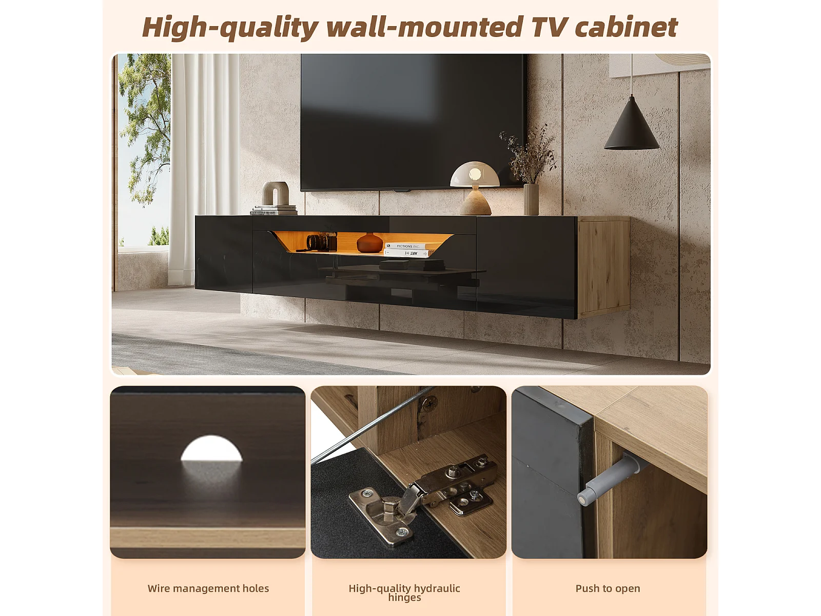 Mueble de TV bajo con LED, con 3 compartimentos, para colgar o colocar en el suelo, para salón, 180 x 30 x 30 cm, negro brillante