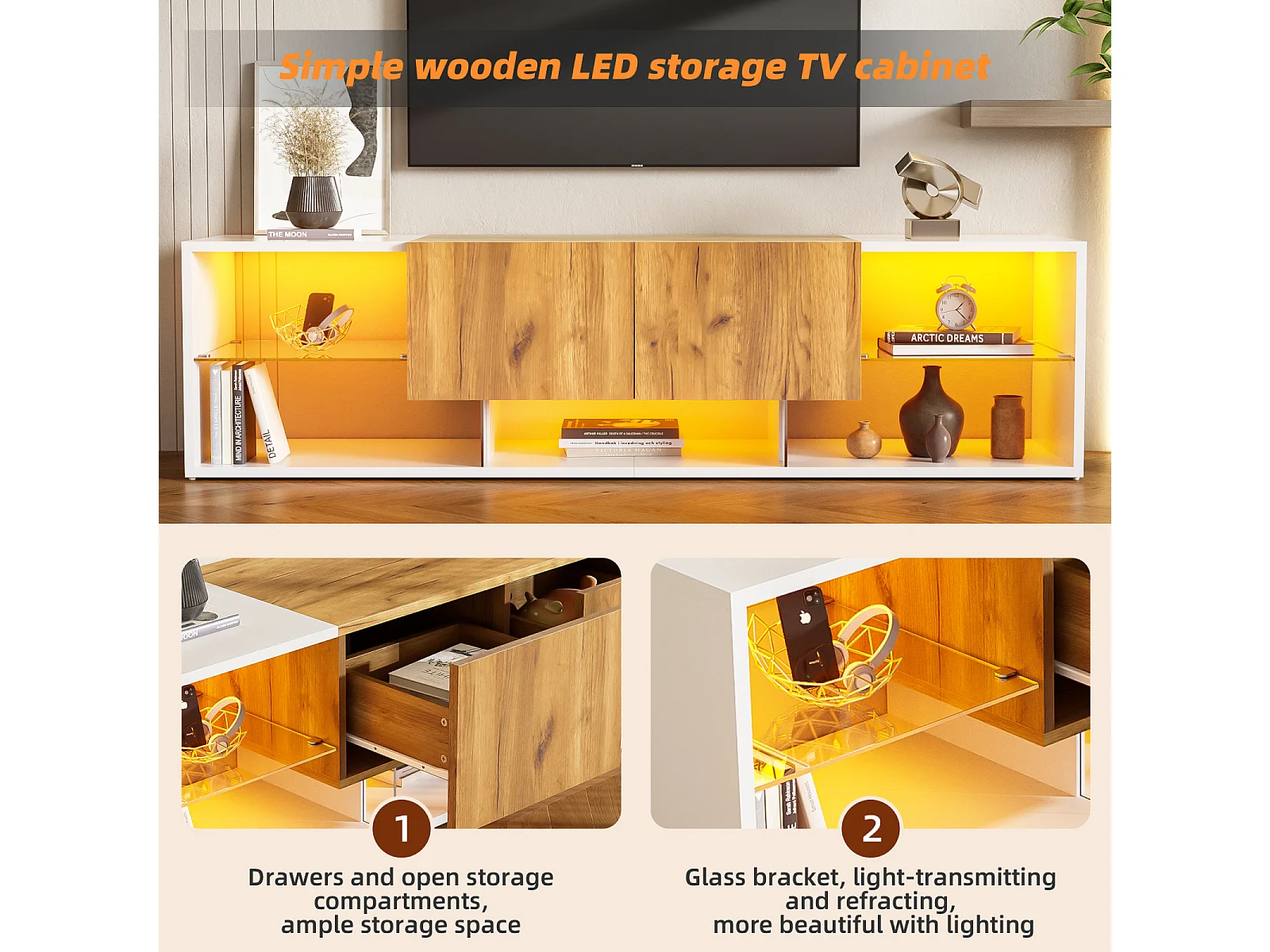 Mueble de TV de 197 cm con LED, 3 puertas y estantes de cristal, mueble de TV largo para salón, color blanco