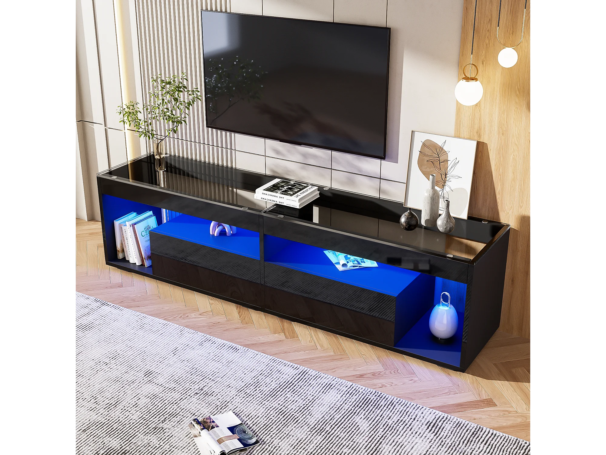 Mueble de TV con LED - Negro brillante - Mueble de TV con 2 cajones - Tapa de cristal - para salón
