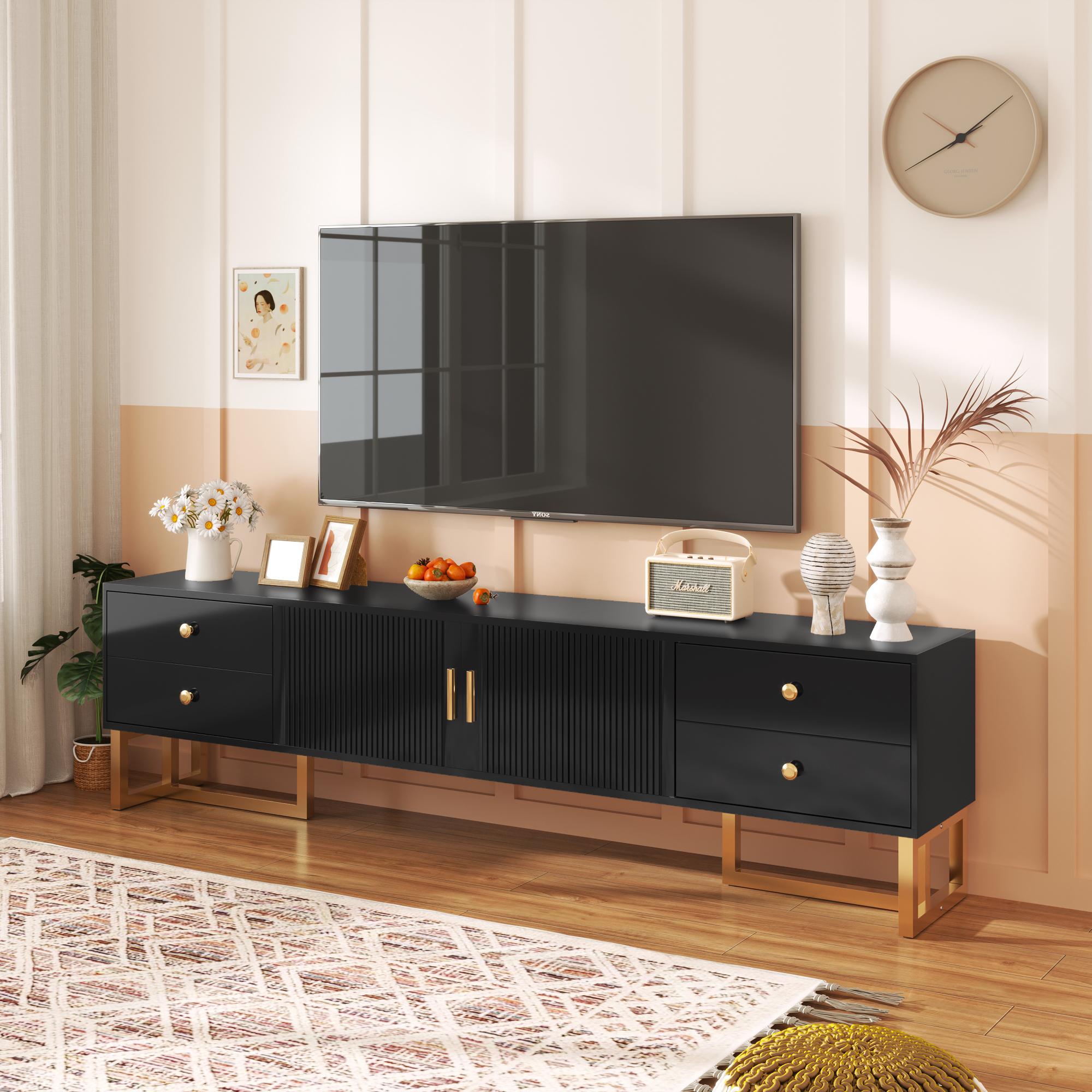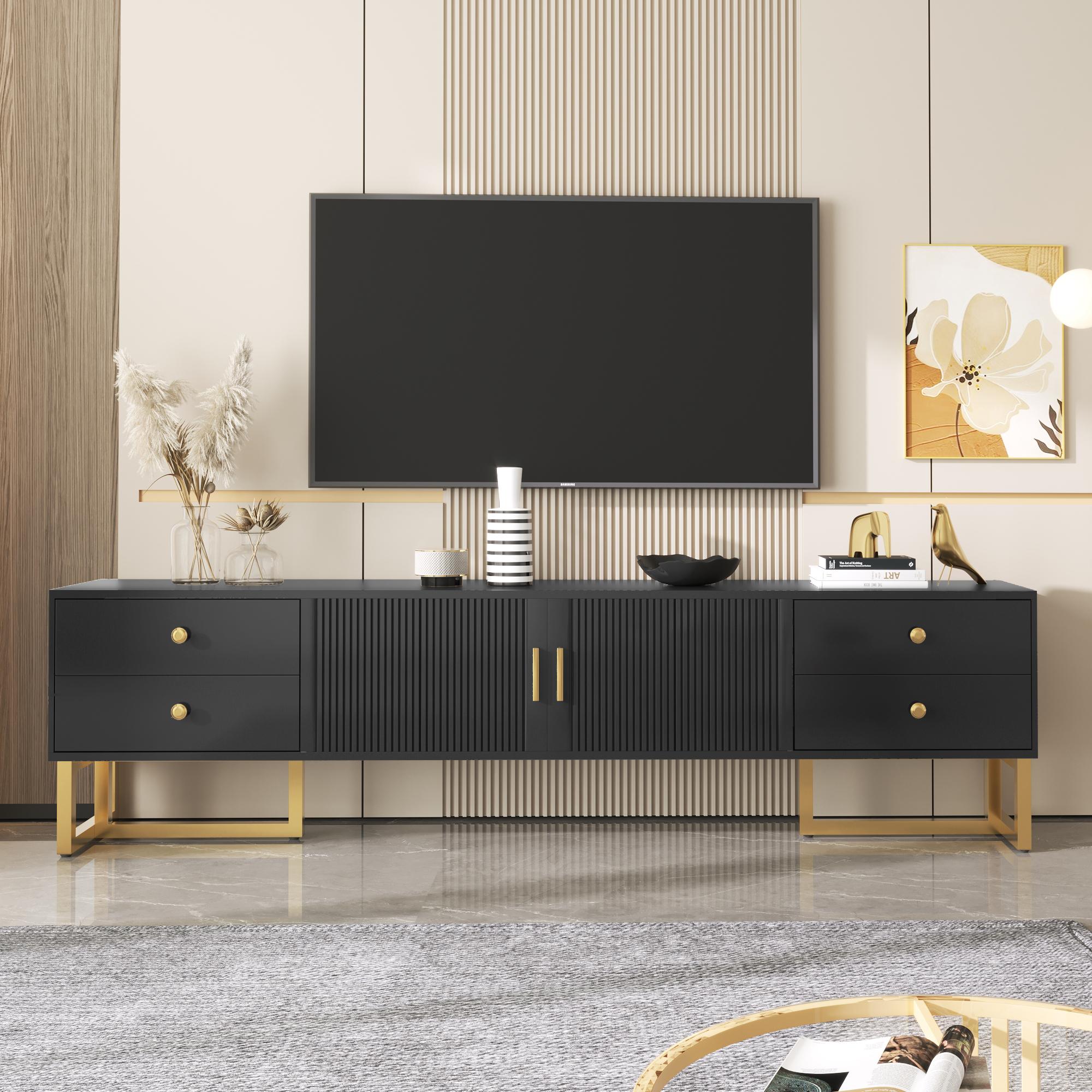 Mueble de TV bajo con 2 cajones y 2 puertas, espacio de almacenamiento con patas y borde dorados, mueble de TV negro