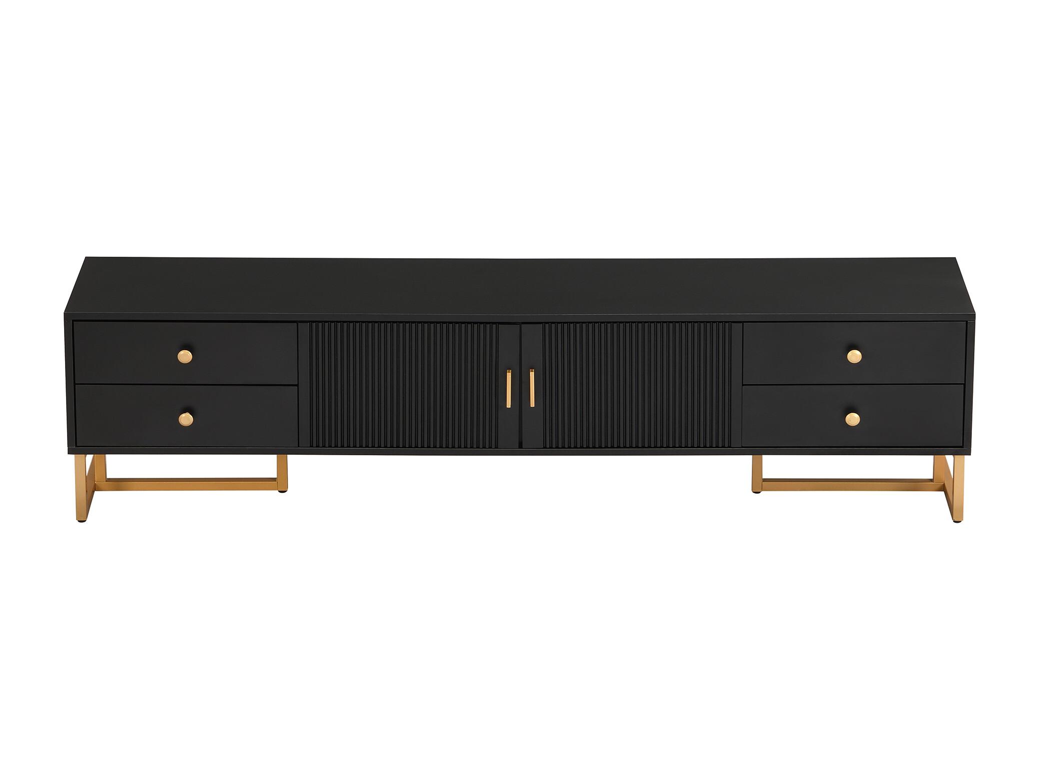 Mueble TV bajo de 175 cm de largo con 4 cajones y puertas, mueble TV con patas de metal dorado, Color Negro