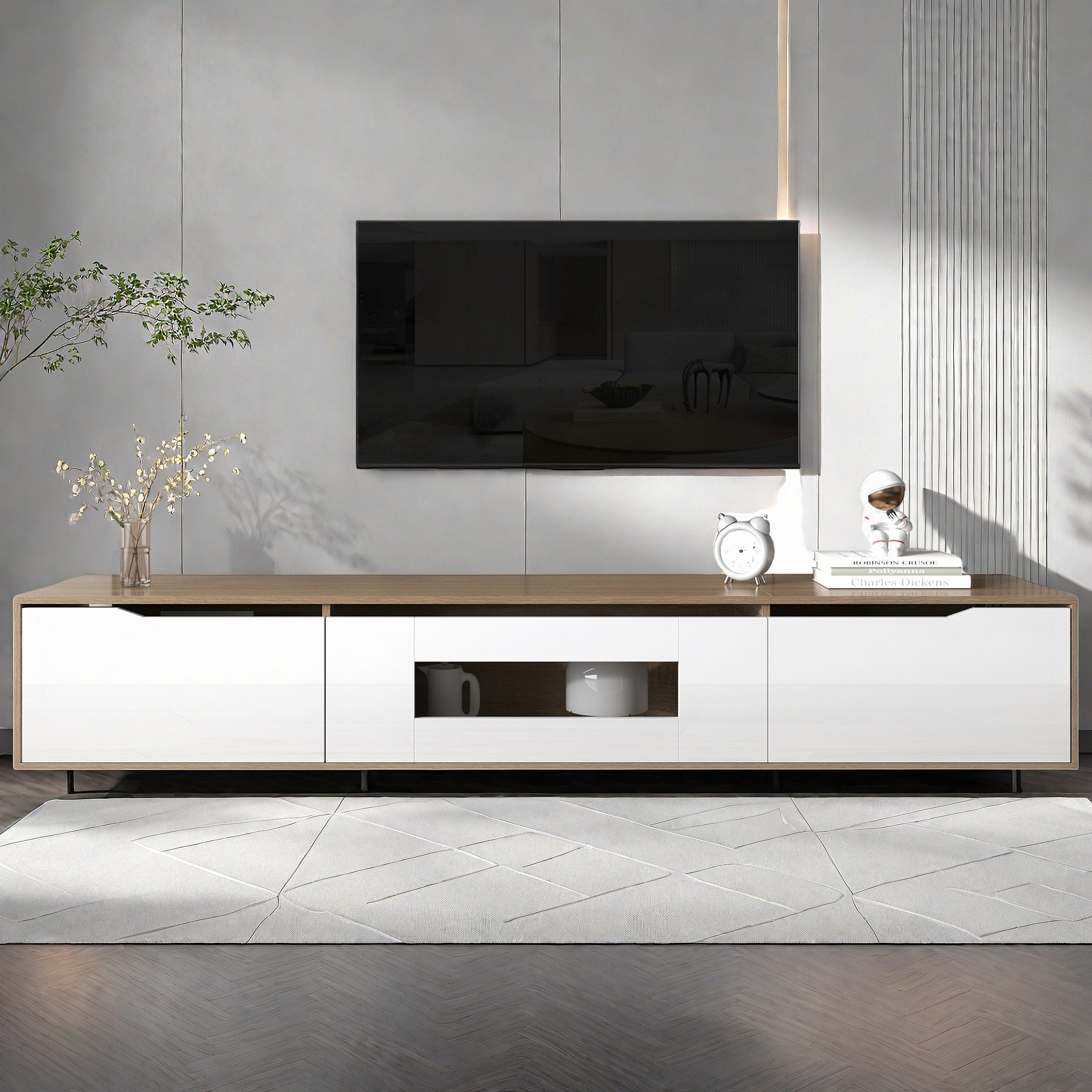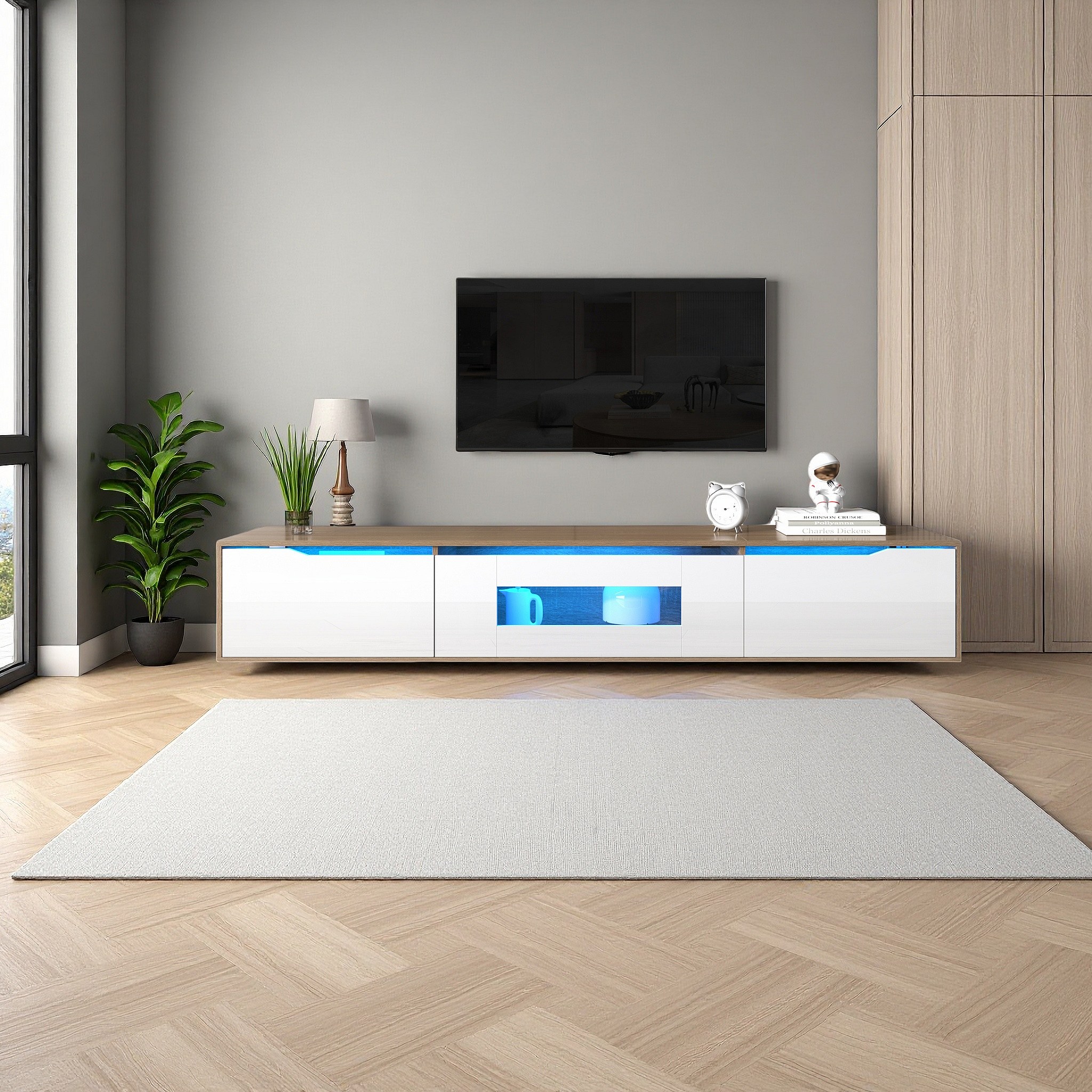 Mueble de TV de alto brillo, a juego: blanco brillante y madera, con iluminación LED que cambia de color.