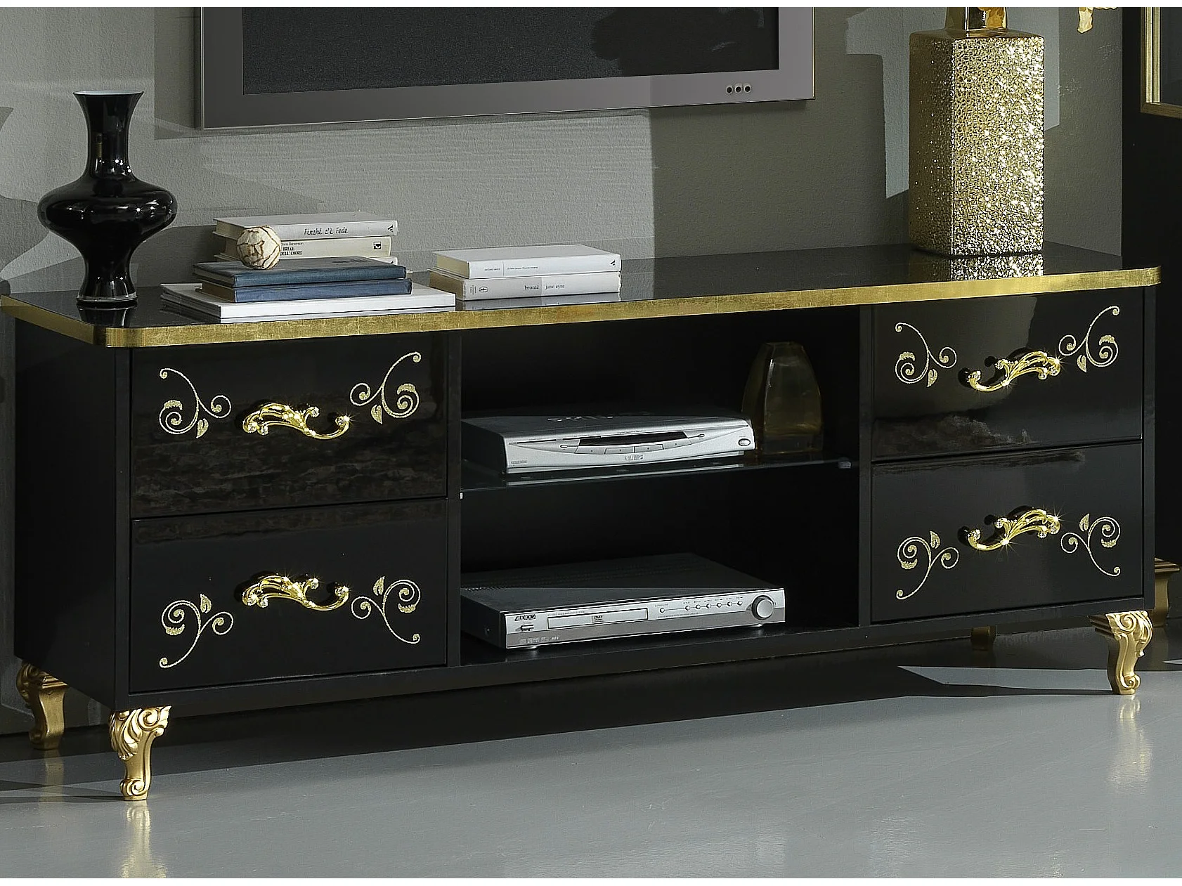 Mueble de TV de diseño Jade de 160 cm en madera barnizada en negro brillante y dorado