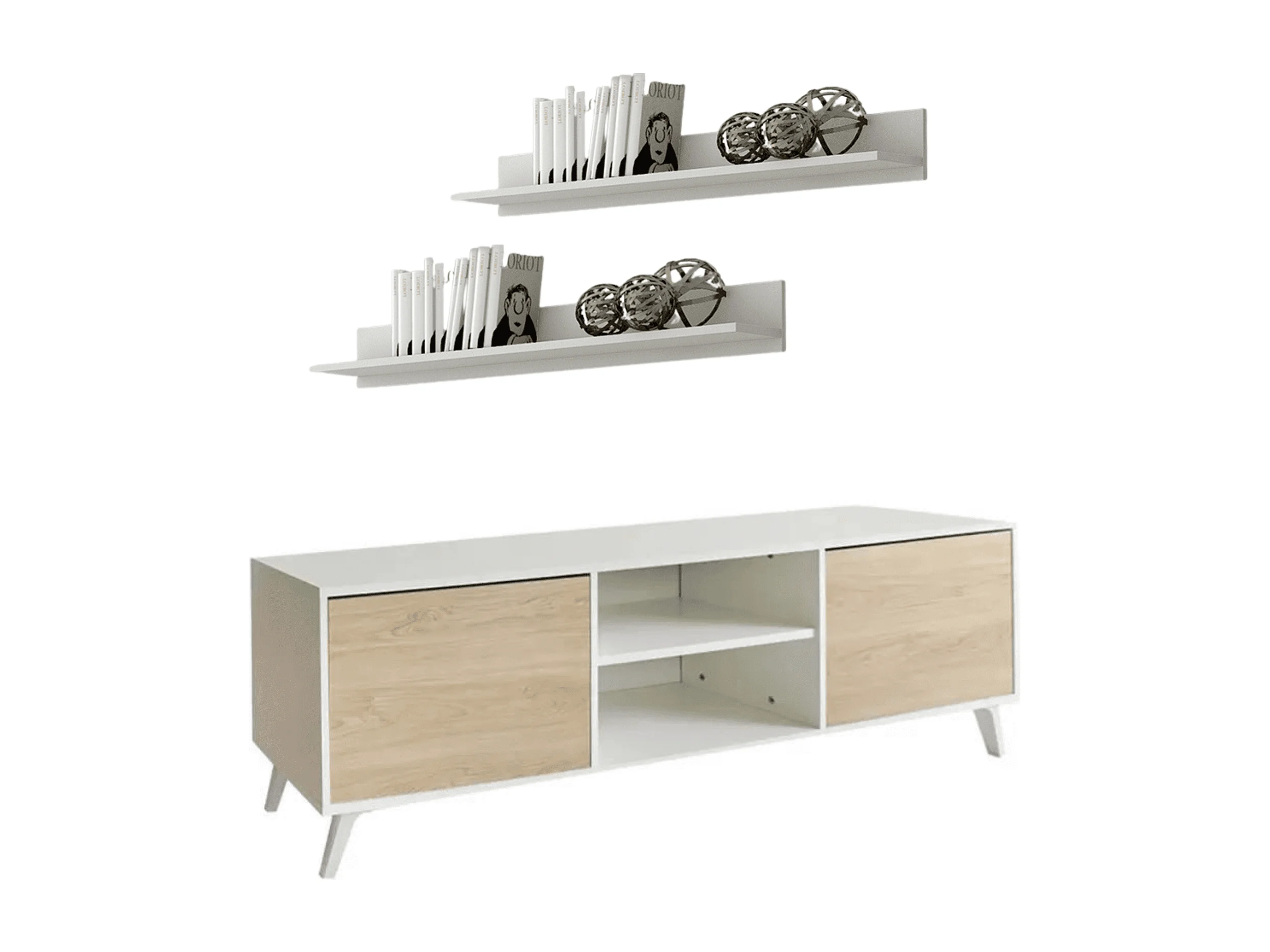 Mueble de TV de Diseño Nórdico + 2 Estantes, 2 Compartimentos de Almacenamiento y 2 Puertas,Cambrian-Blanco, 49cm(Alto) x 180cm (Ancho) x 40cm (Fondo)