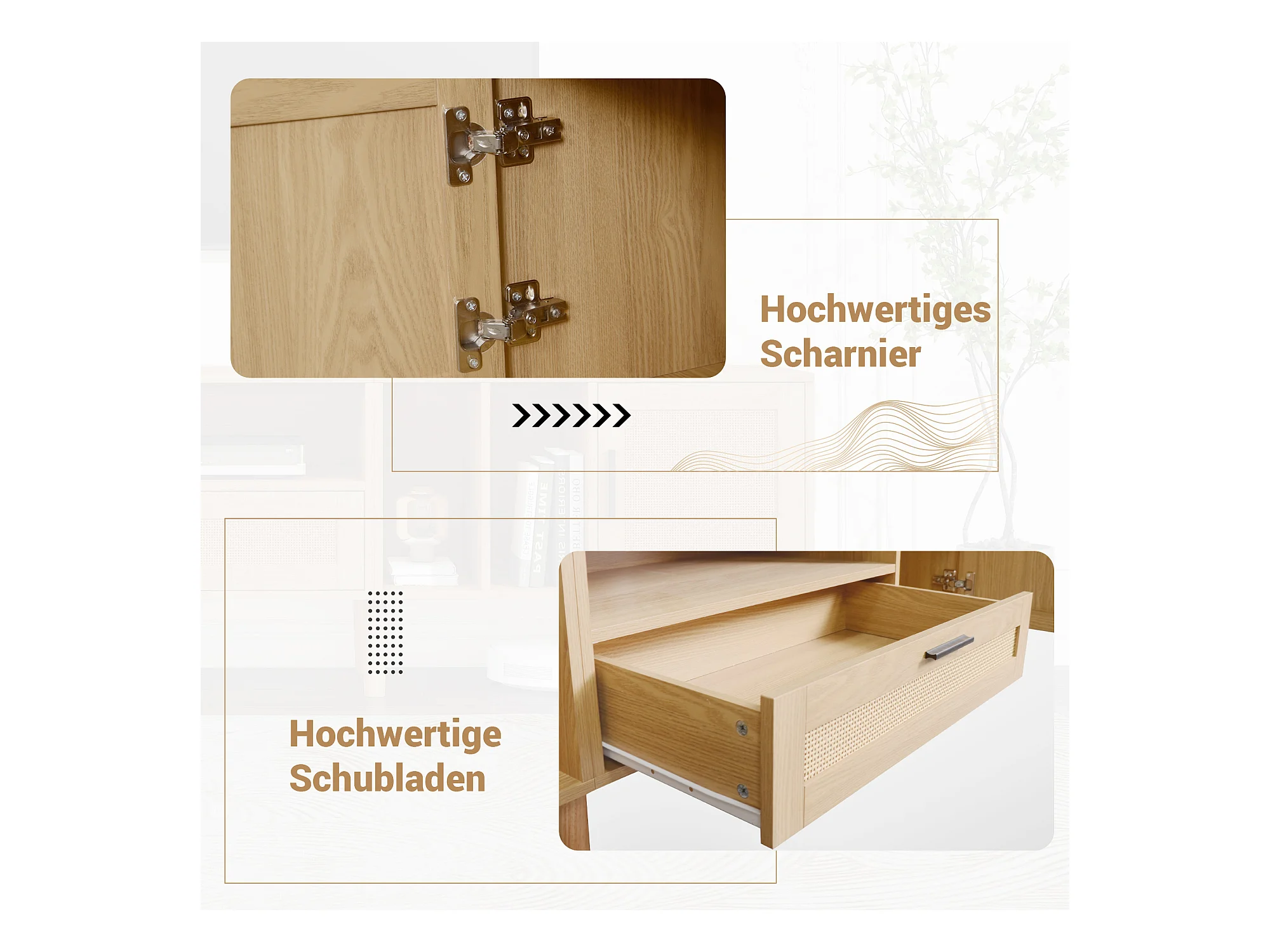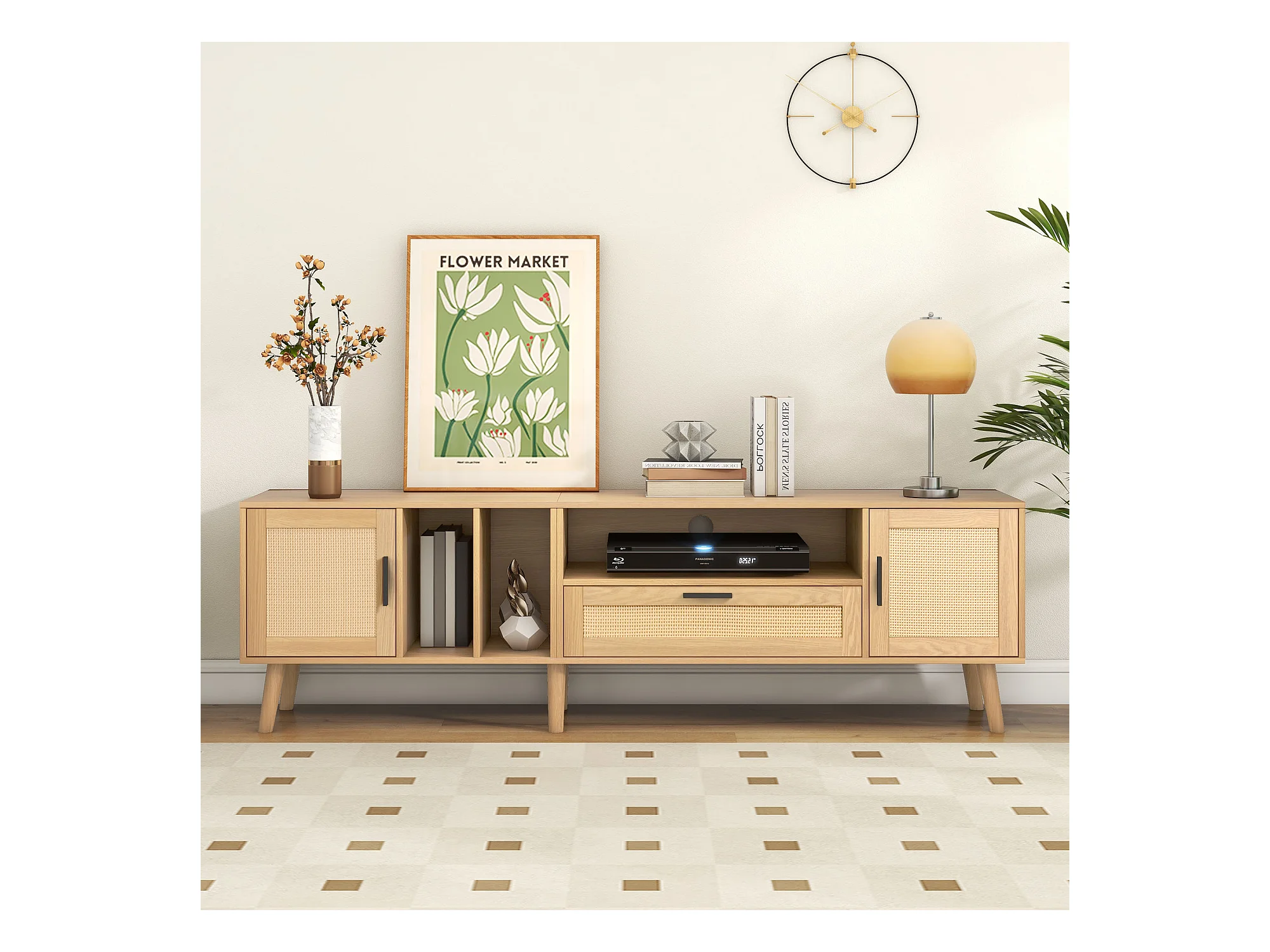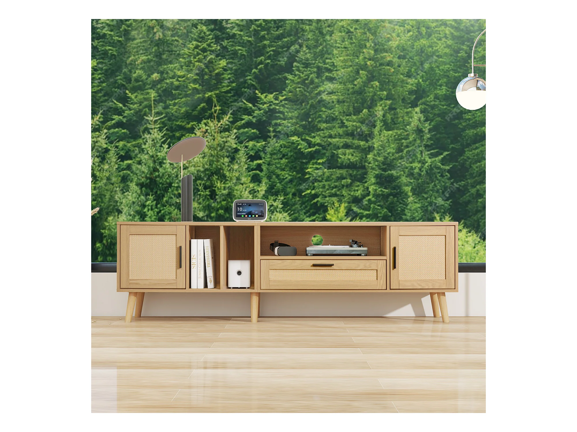 Mueble de TV de estilo natural de 180 cm con puertas de ratán para sala de estar con TV de 80 pulgadas