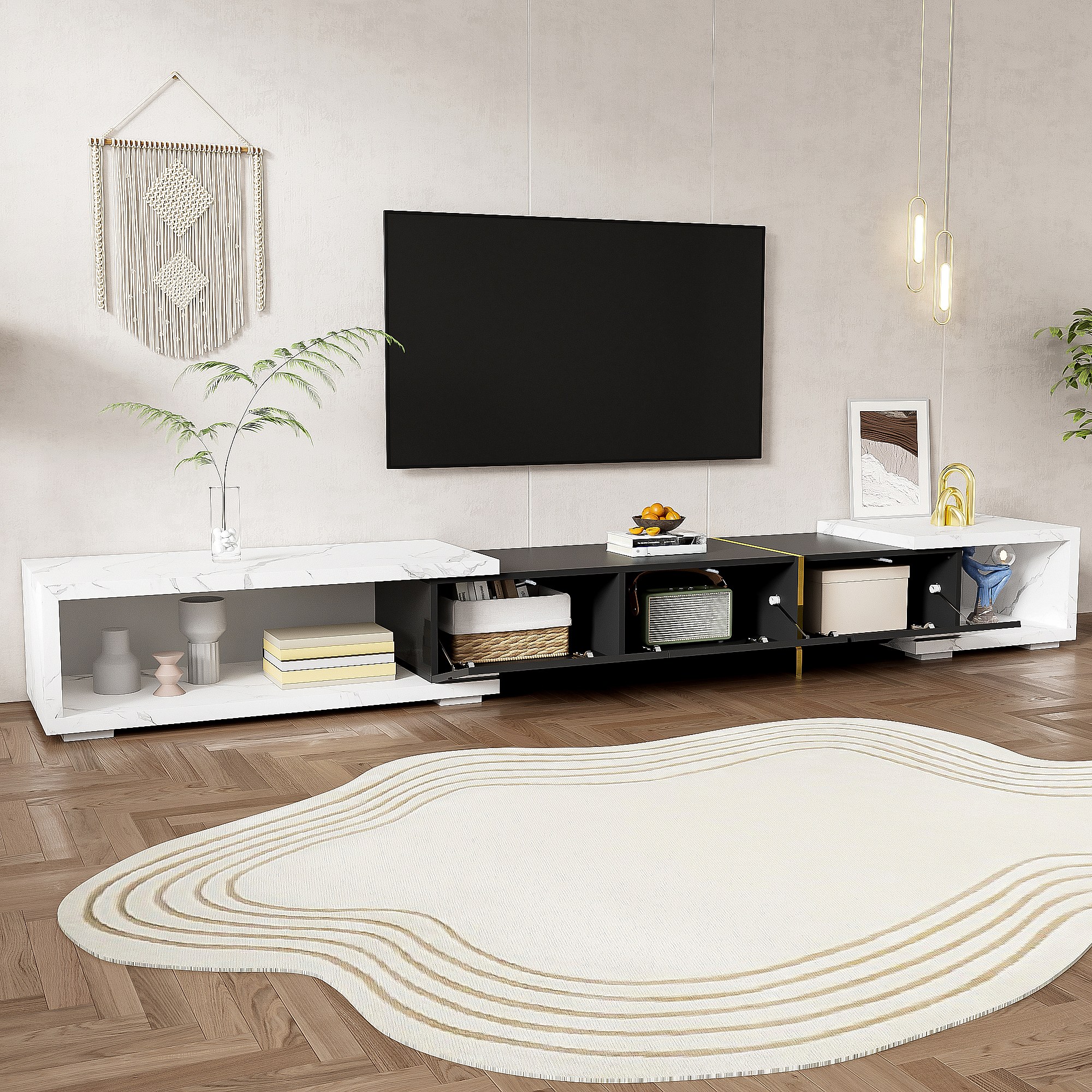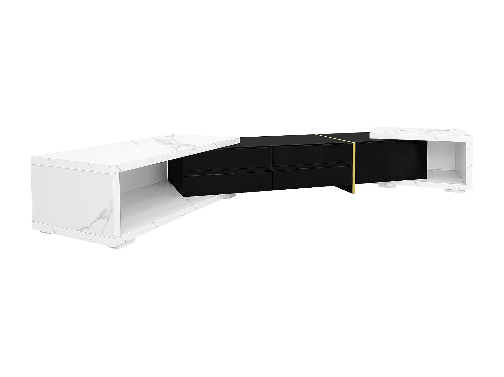 Mueble de TV de longitud variable (140-260 cm), función giratoria, aspecto mármol, color negro