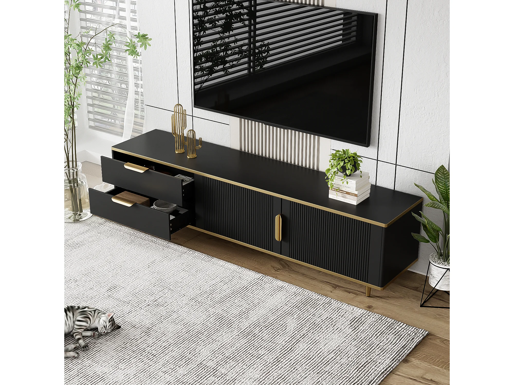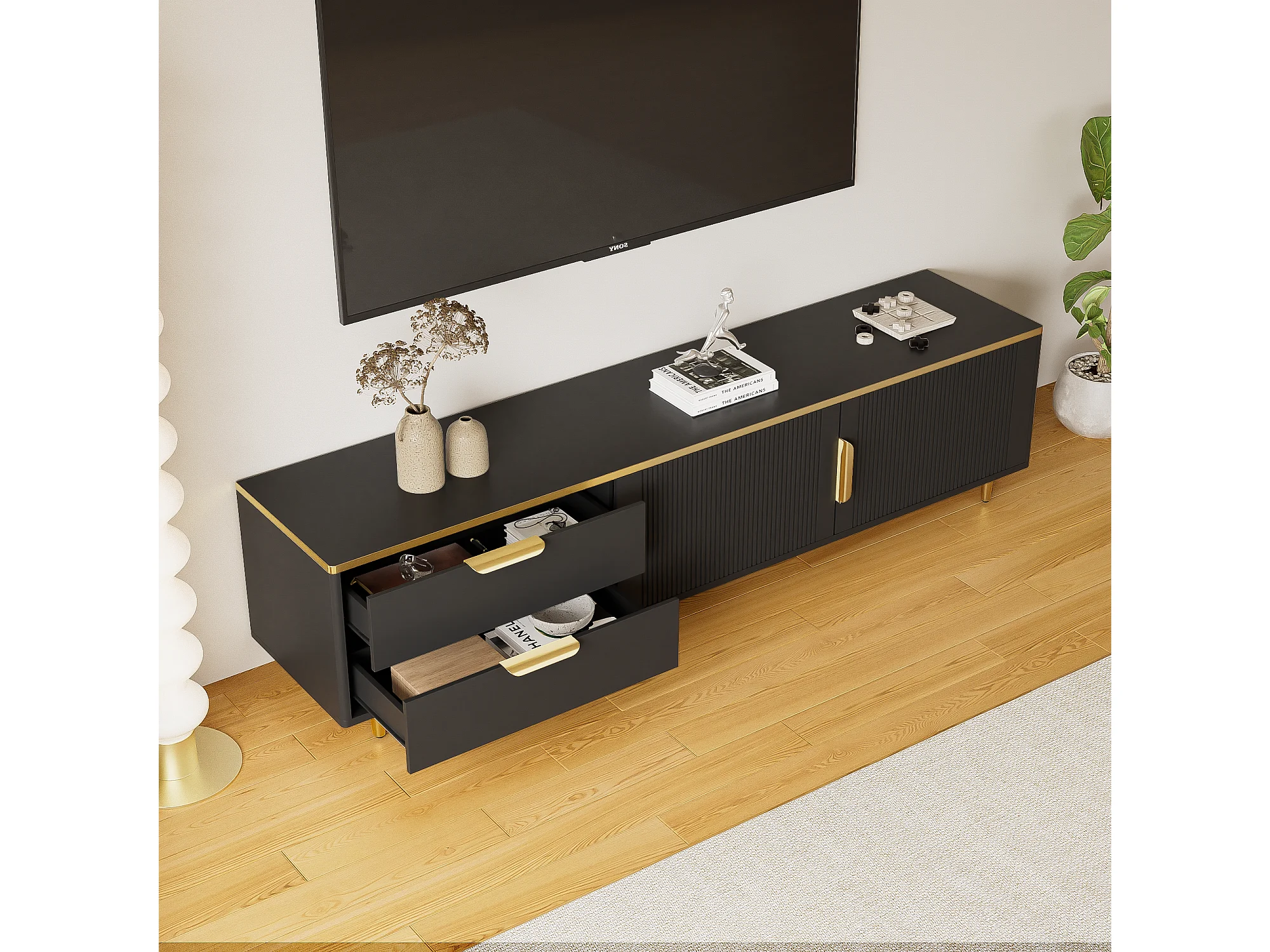 Mueble de TV moderno con textura tallada, tiradores y patas dorados, estructura de mármol, negro y dorado.