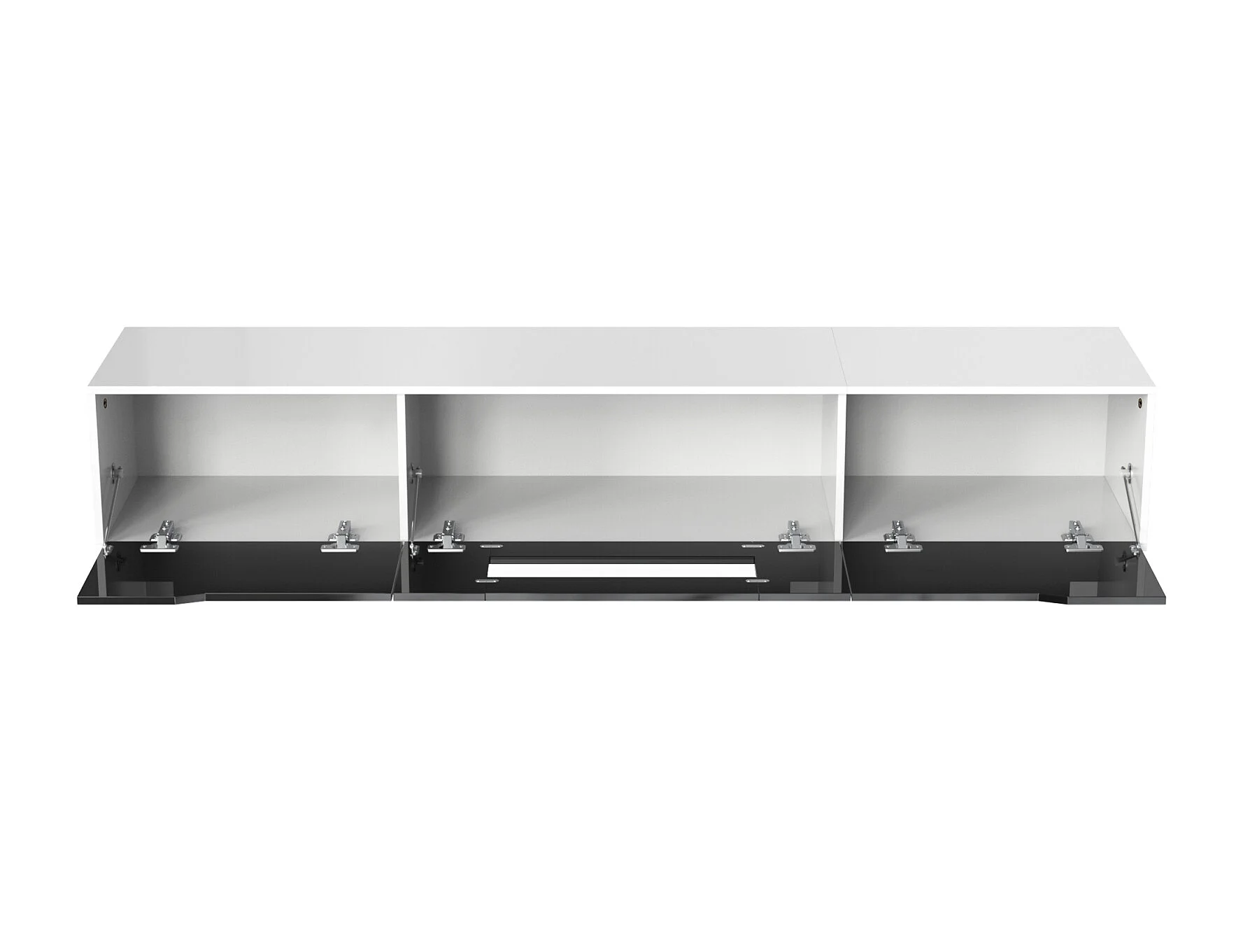 Mueble de TV negro brillante de 197 cm con iluminación LED. Mueble bajo con estante de cristal y 3 puertas.