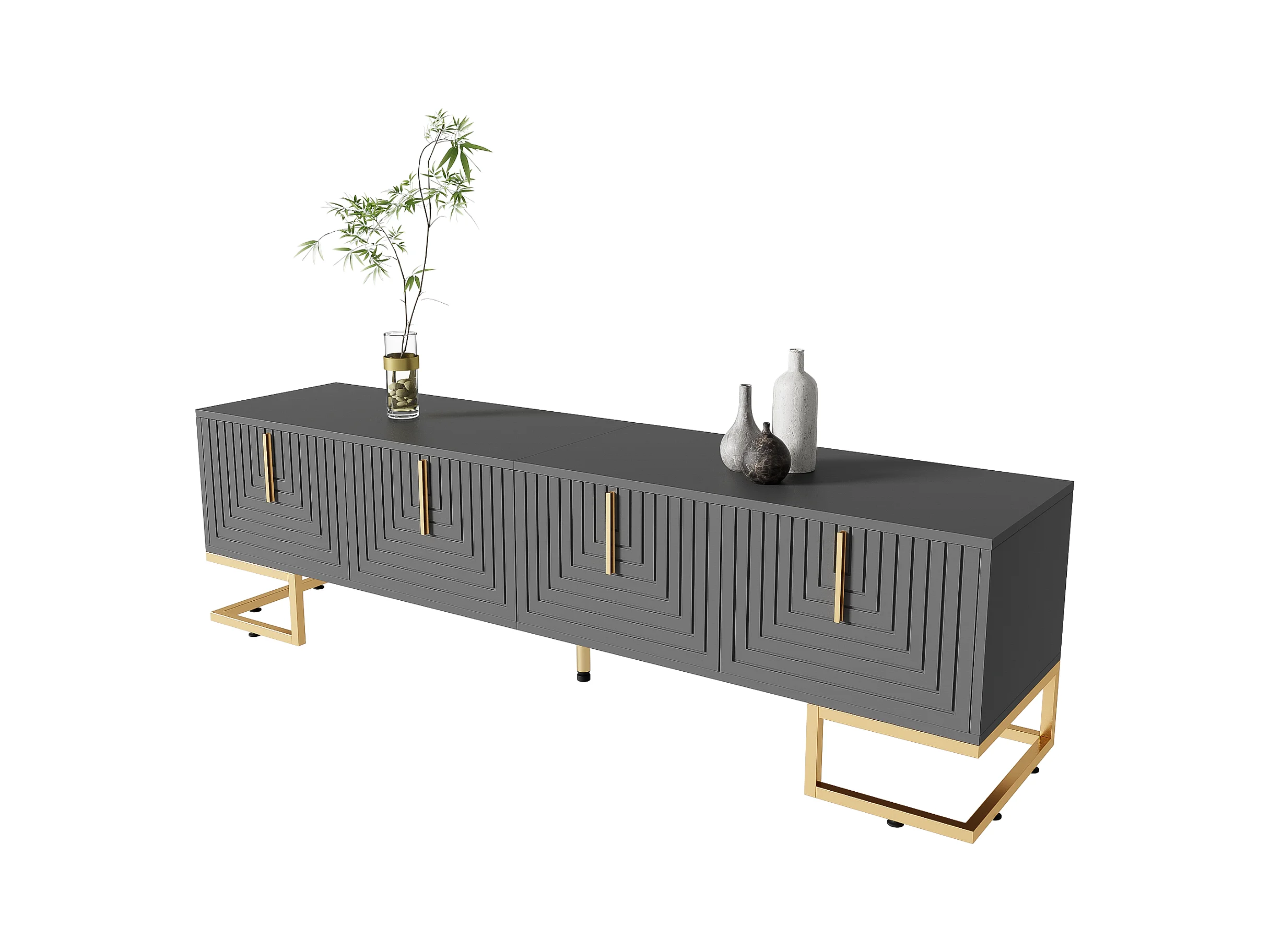 Mueble de TV, diseño con puertas texturizadas, 1 cajón, 3 puertas, patas doradas, MDF, gris y madera (170x40x45,5cm)