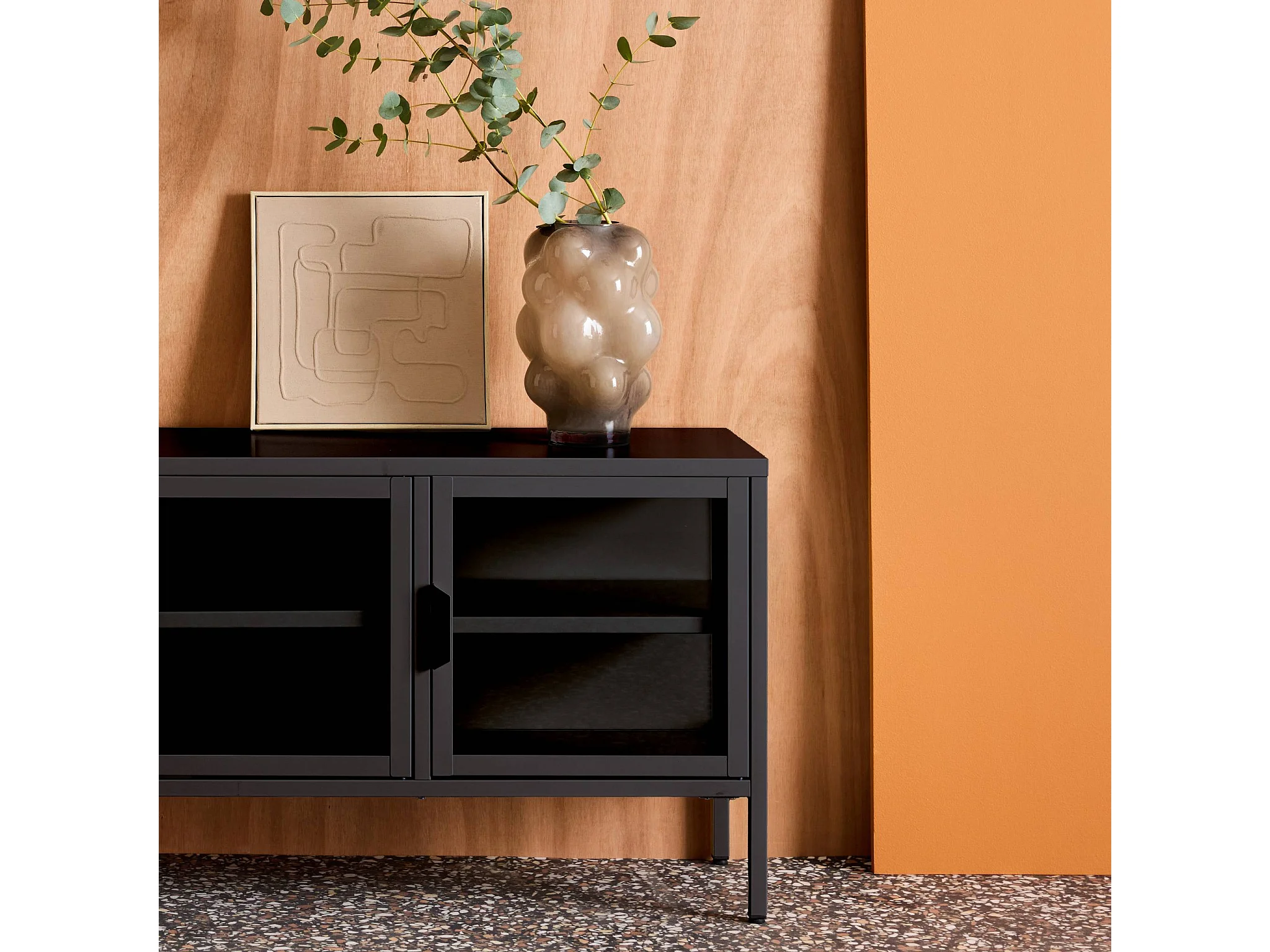Mueble de tv industrial de metal y vidrio templado con 3 puertas,