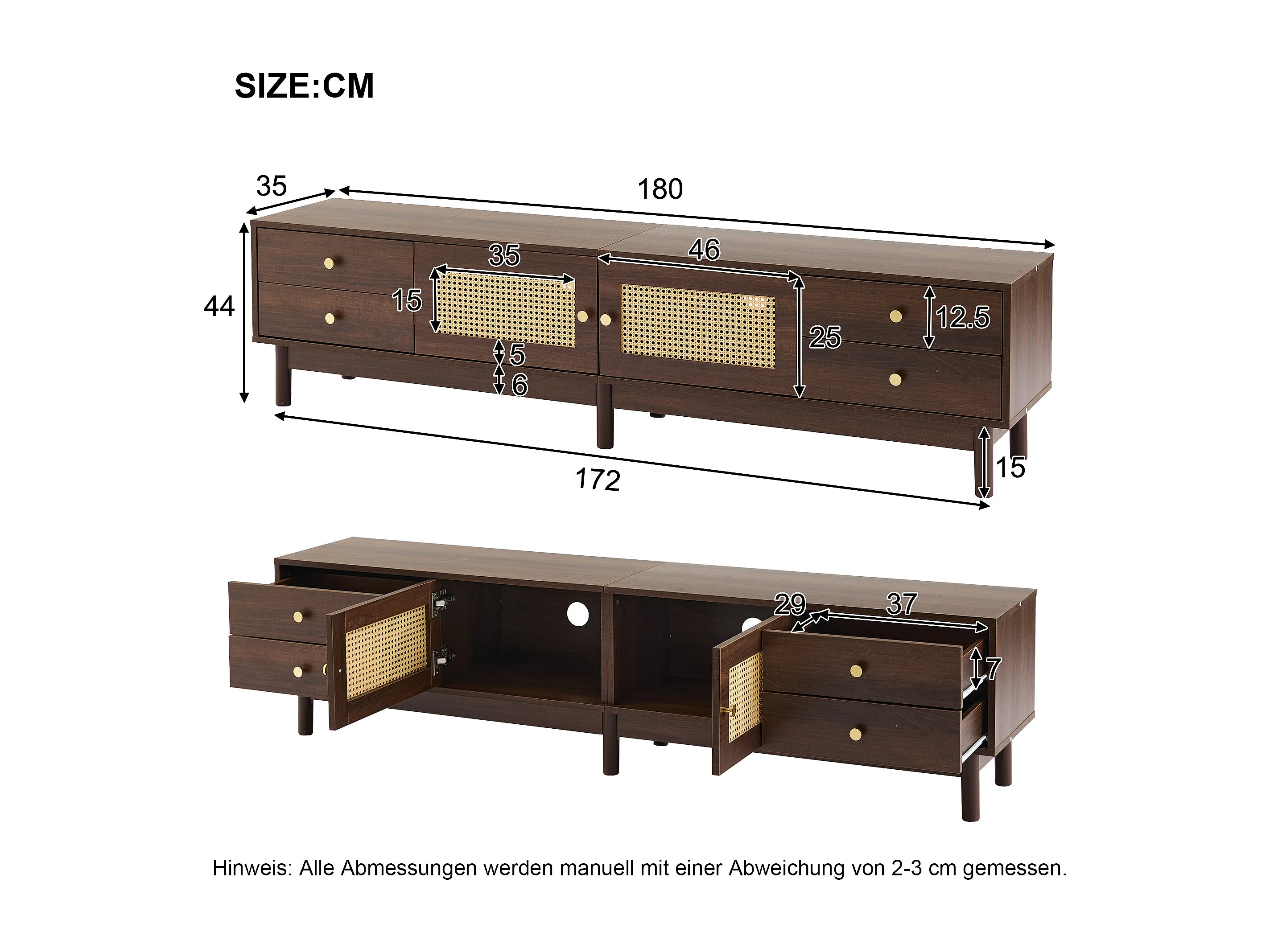 Mueble de TV de 180 cm de largo en madera oscura con dos puertas de ratán y cuatro cajones.