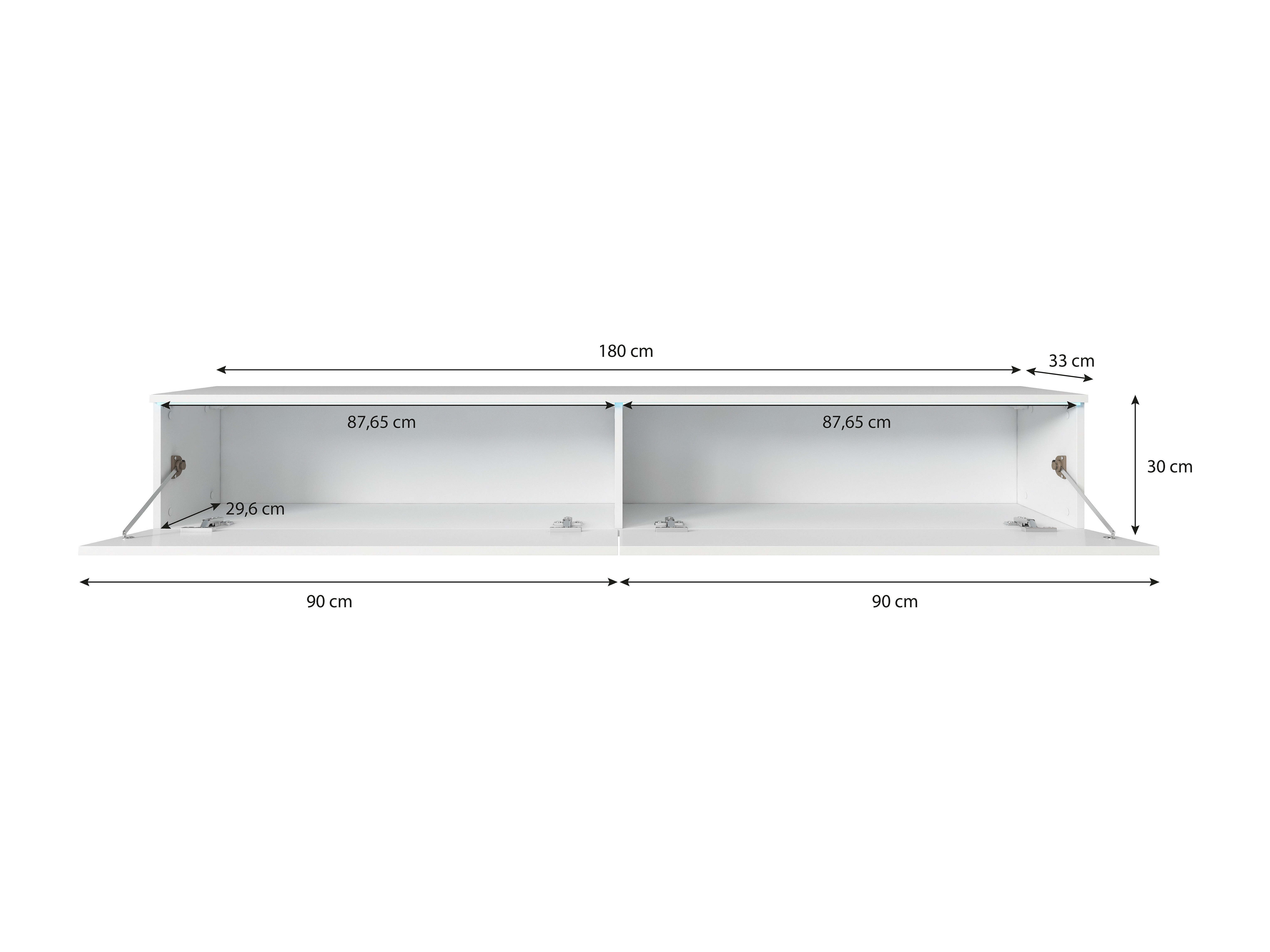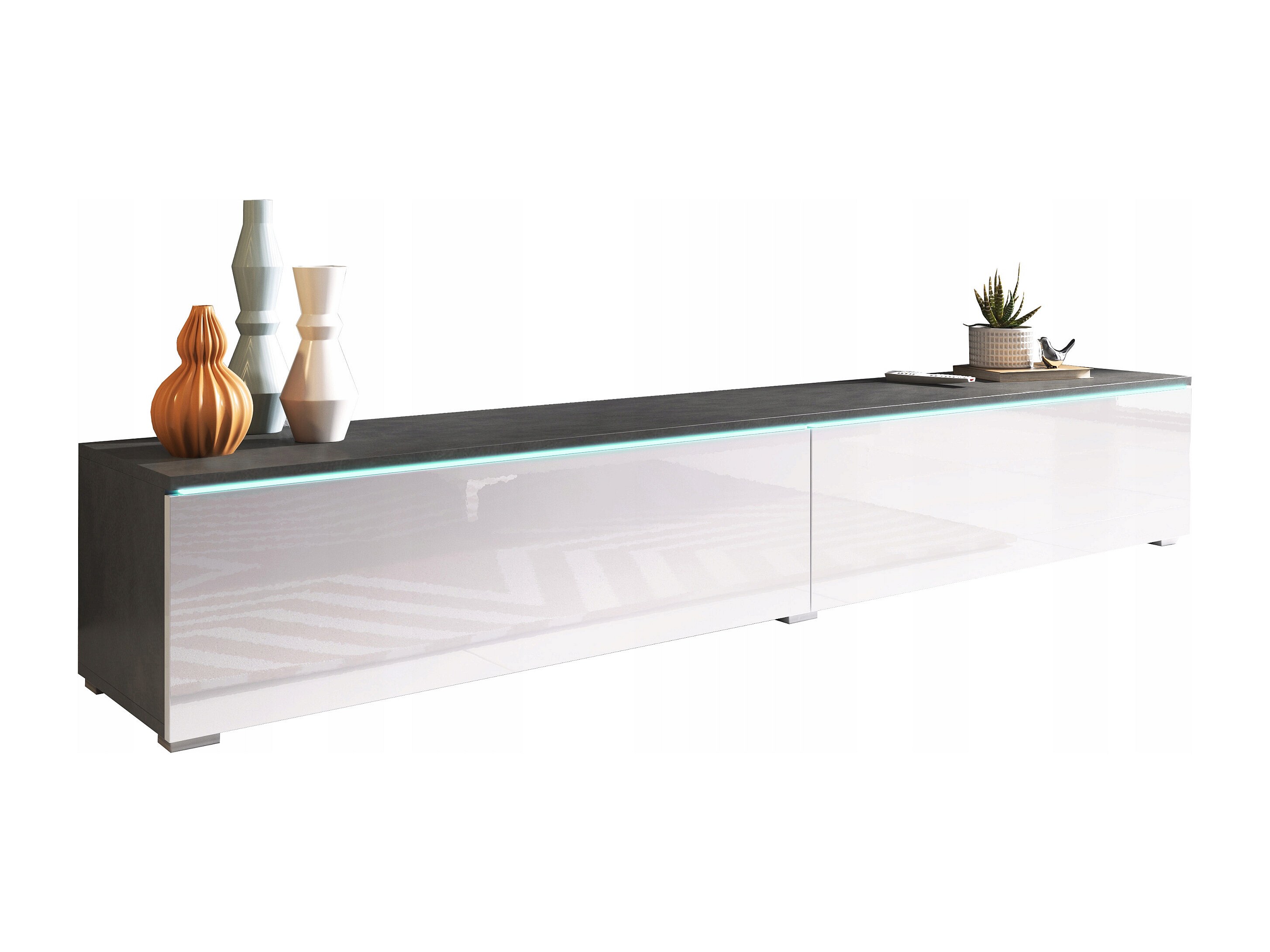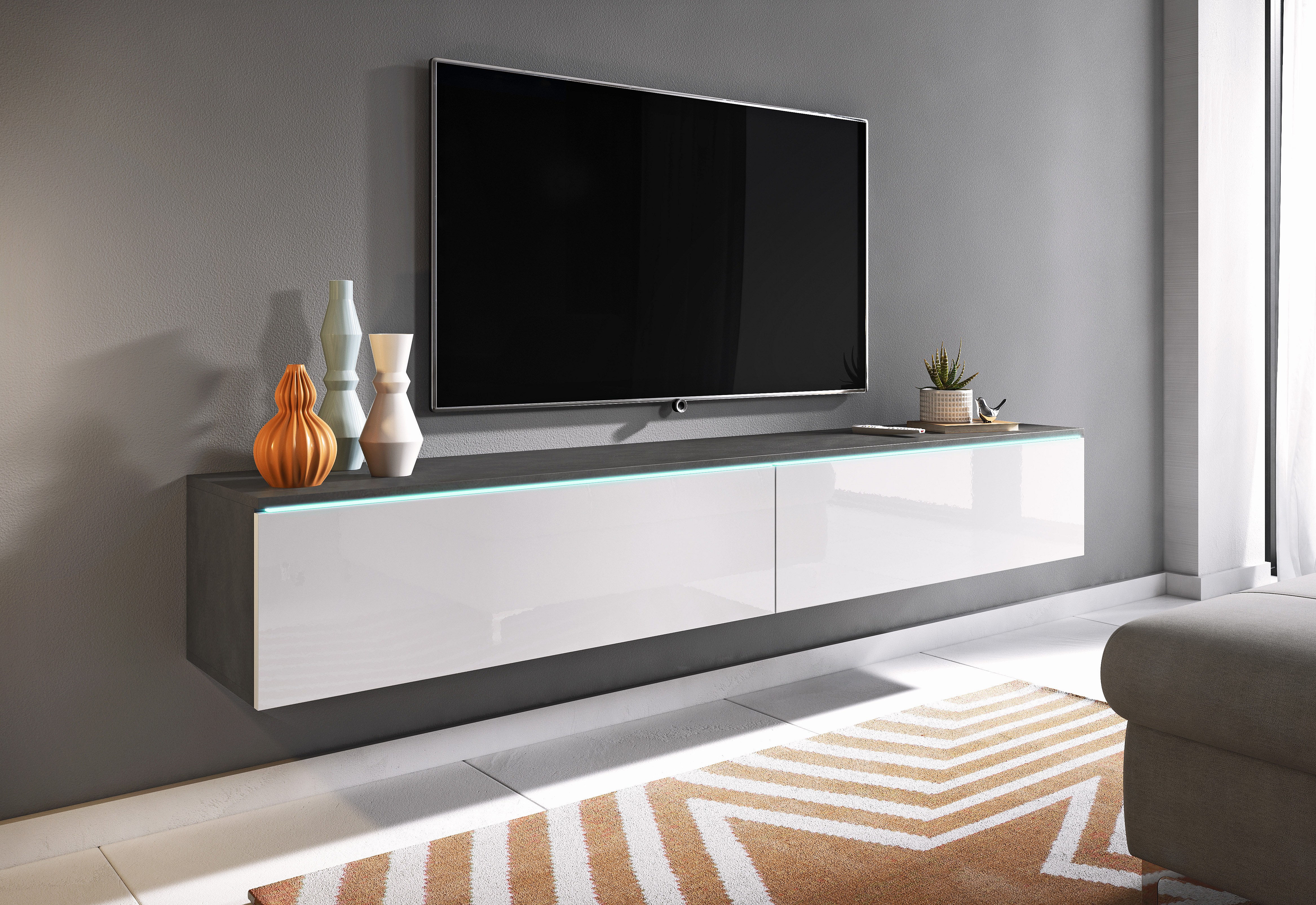 Mueble de TV moderno 180 cm para salón con LED – 2 puertas, sin tiradores, cuerpo antracita mate, frentes blanco brillo, de pie o suspendido