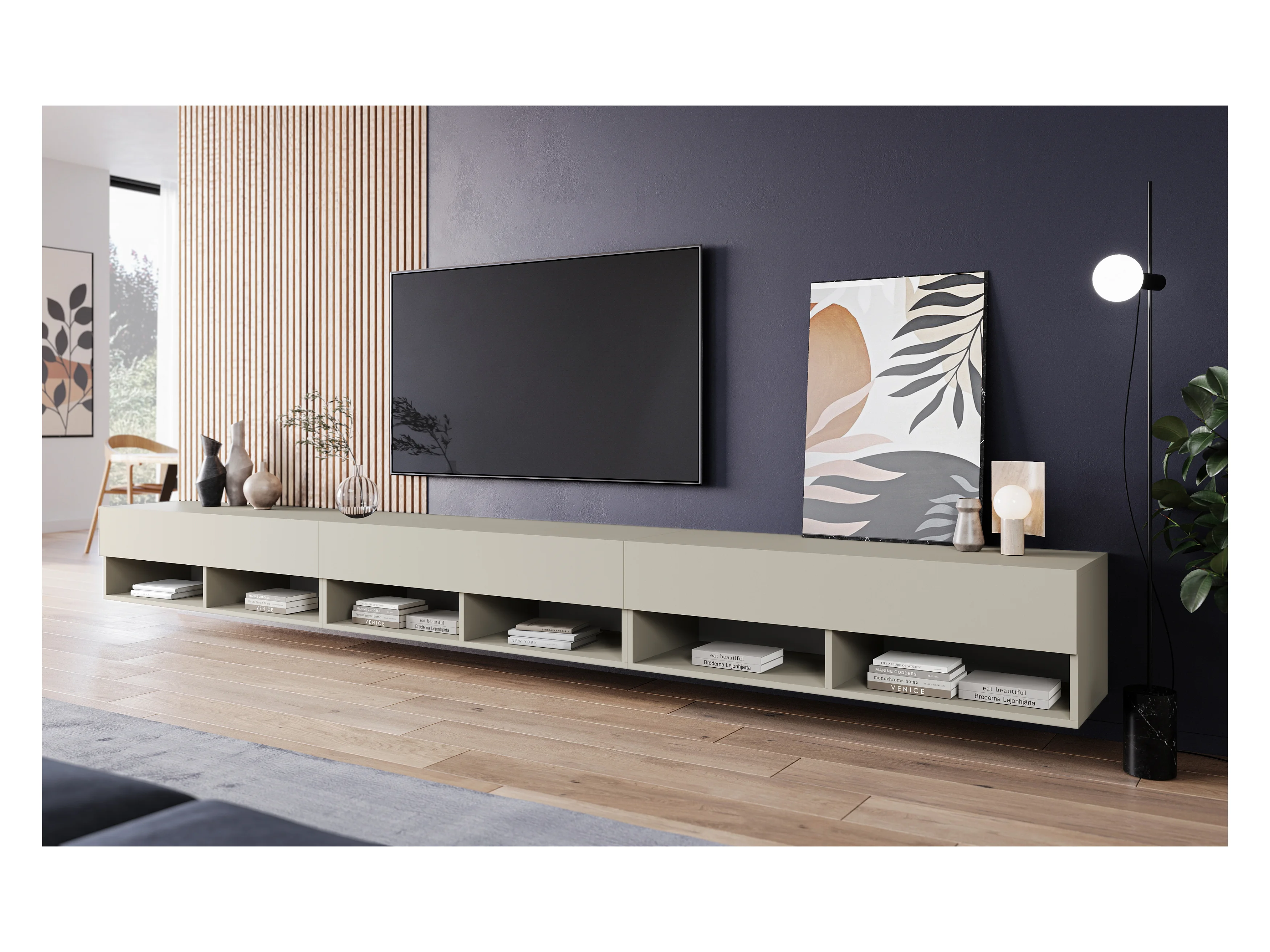 Mueble de TV moderno 300 cm con LED – sin tiradores, beige cachemira mate, de pie o colgante