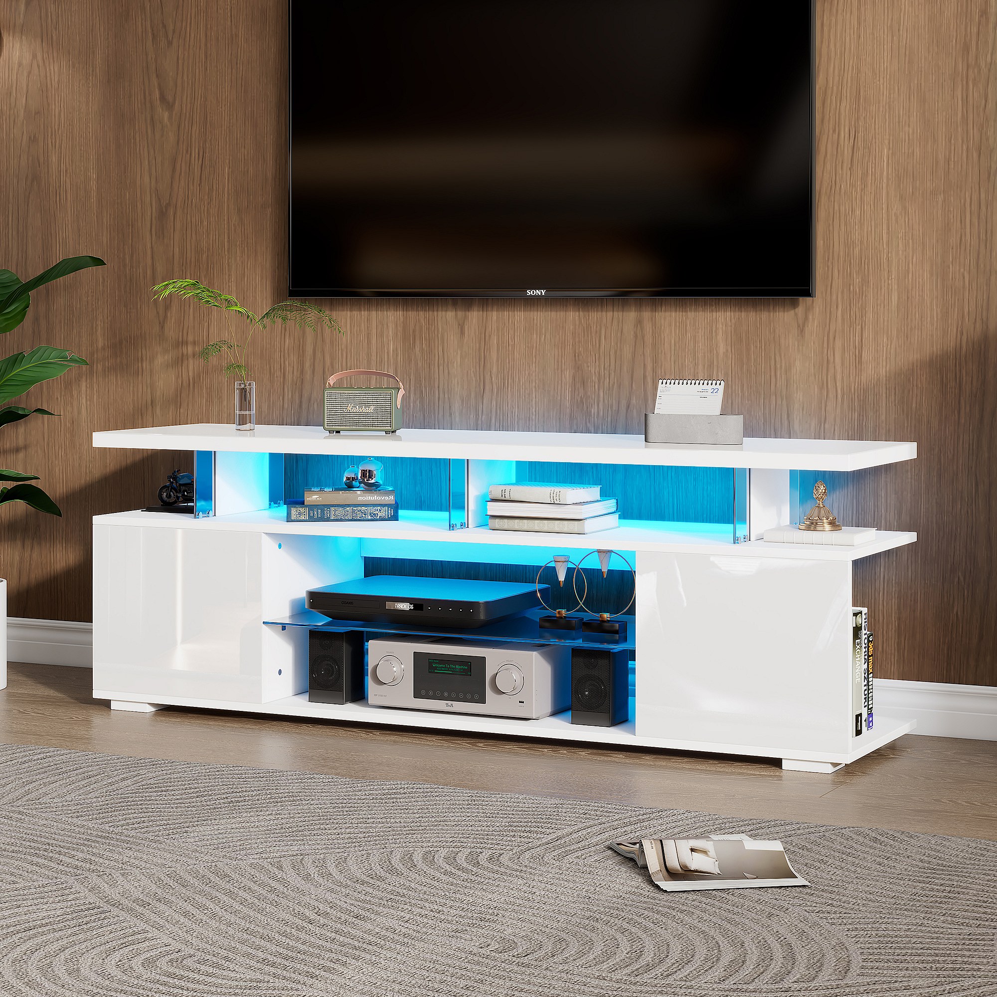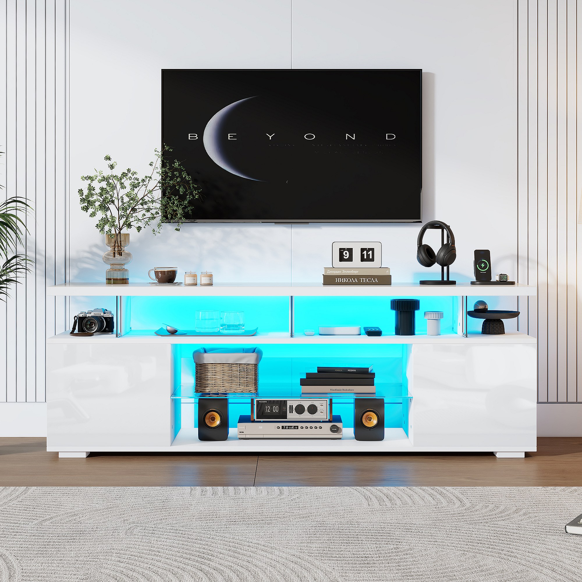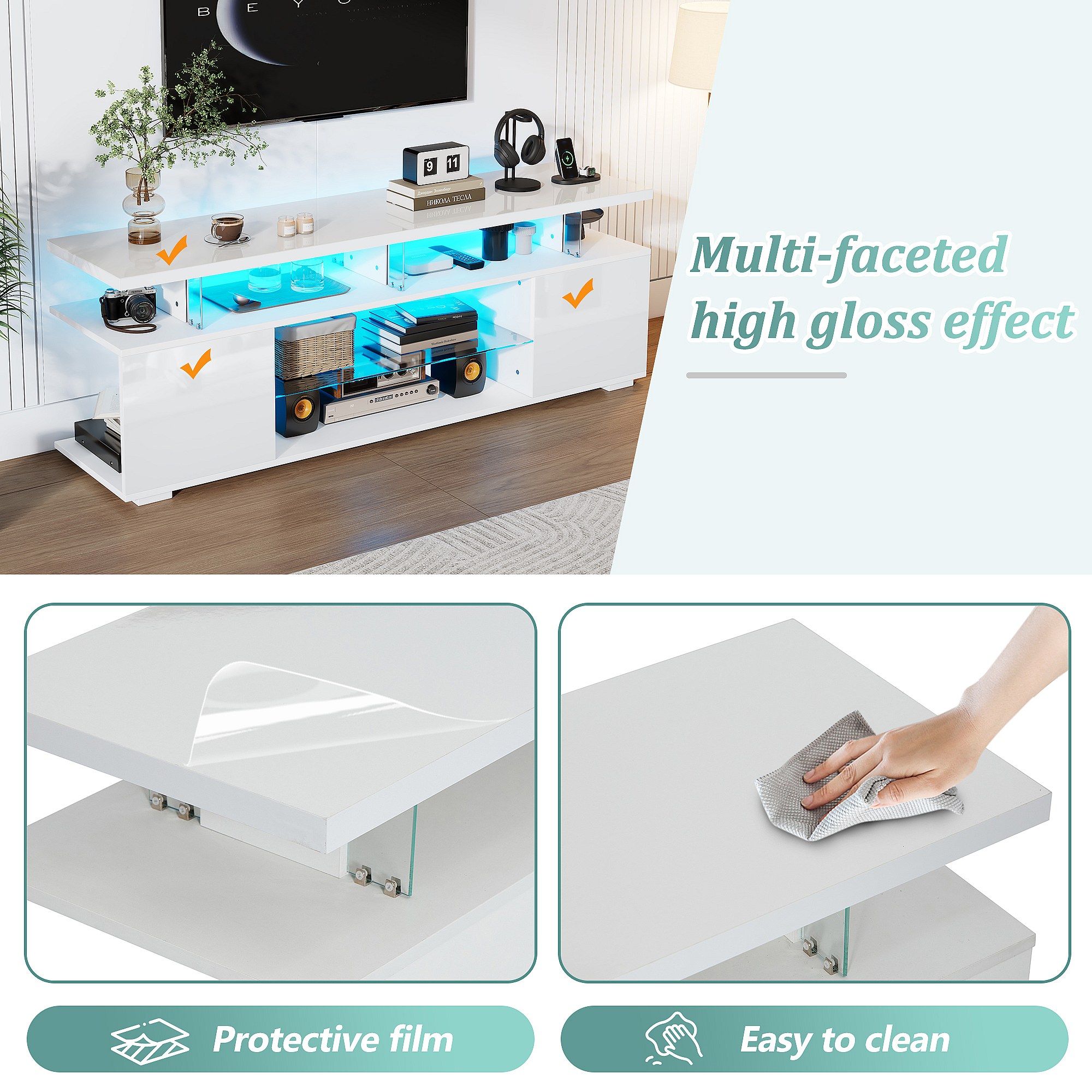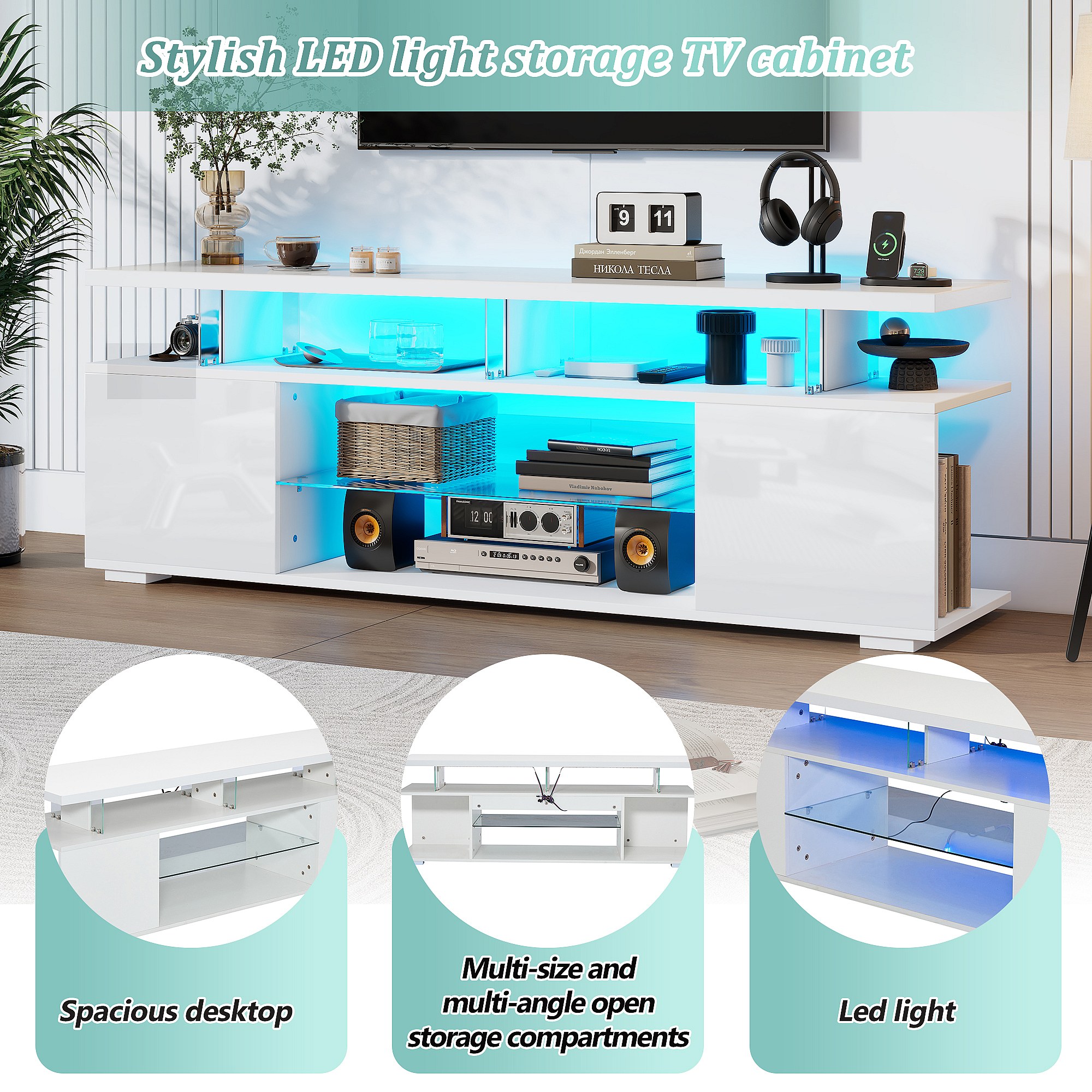 Mueble de TV blanco y gris de 180 cm con LED y Bluetooth, 4 puertas de vidrio templado para TV de 80 pulgadas