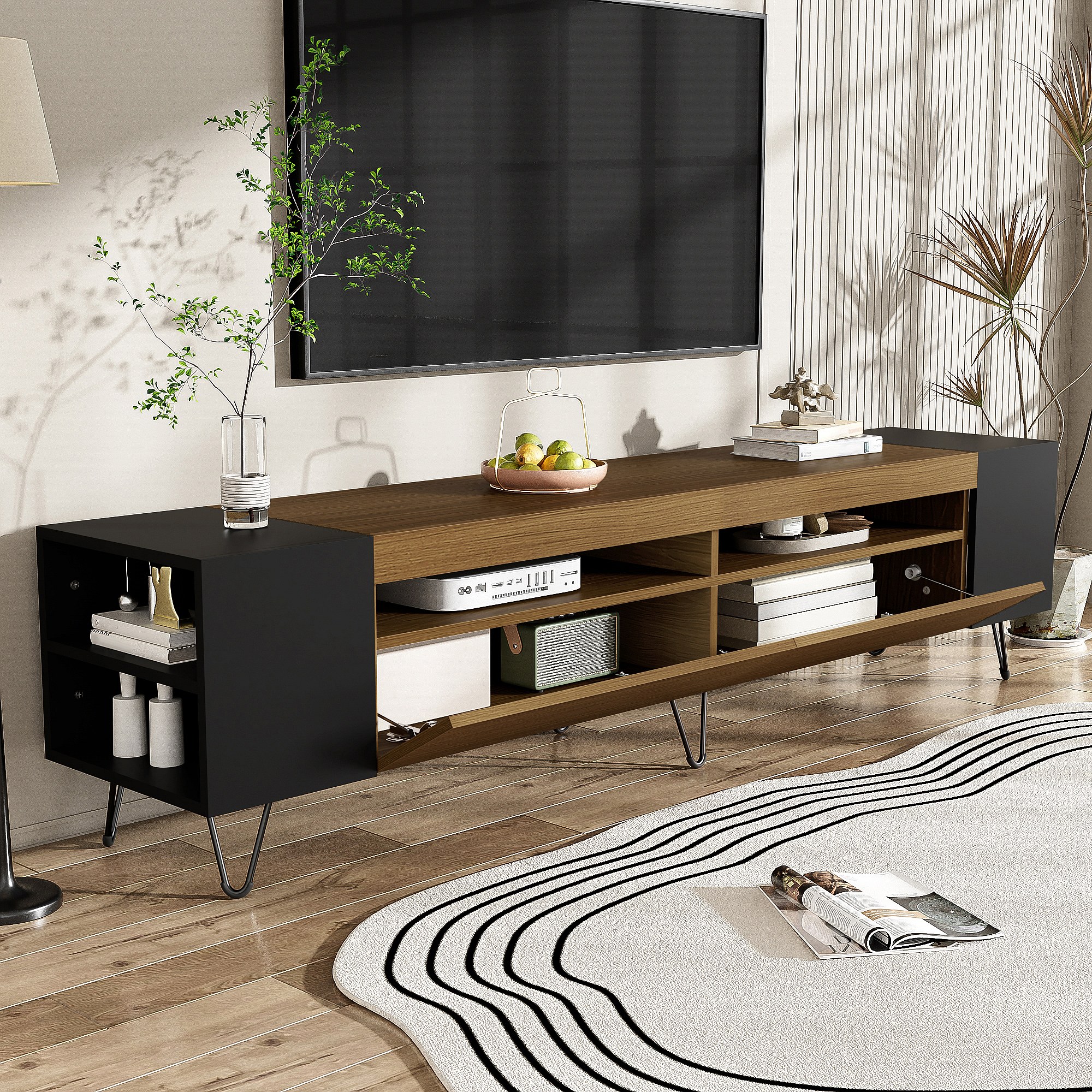 Mueble de TV moderno con 2 puertas, espacio de almacenamiento y patas de metal, 180 x 36 x 43 cm, negro y madera