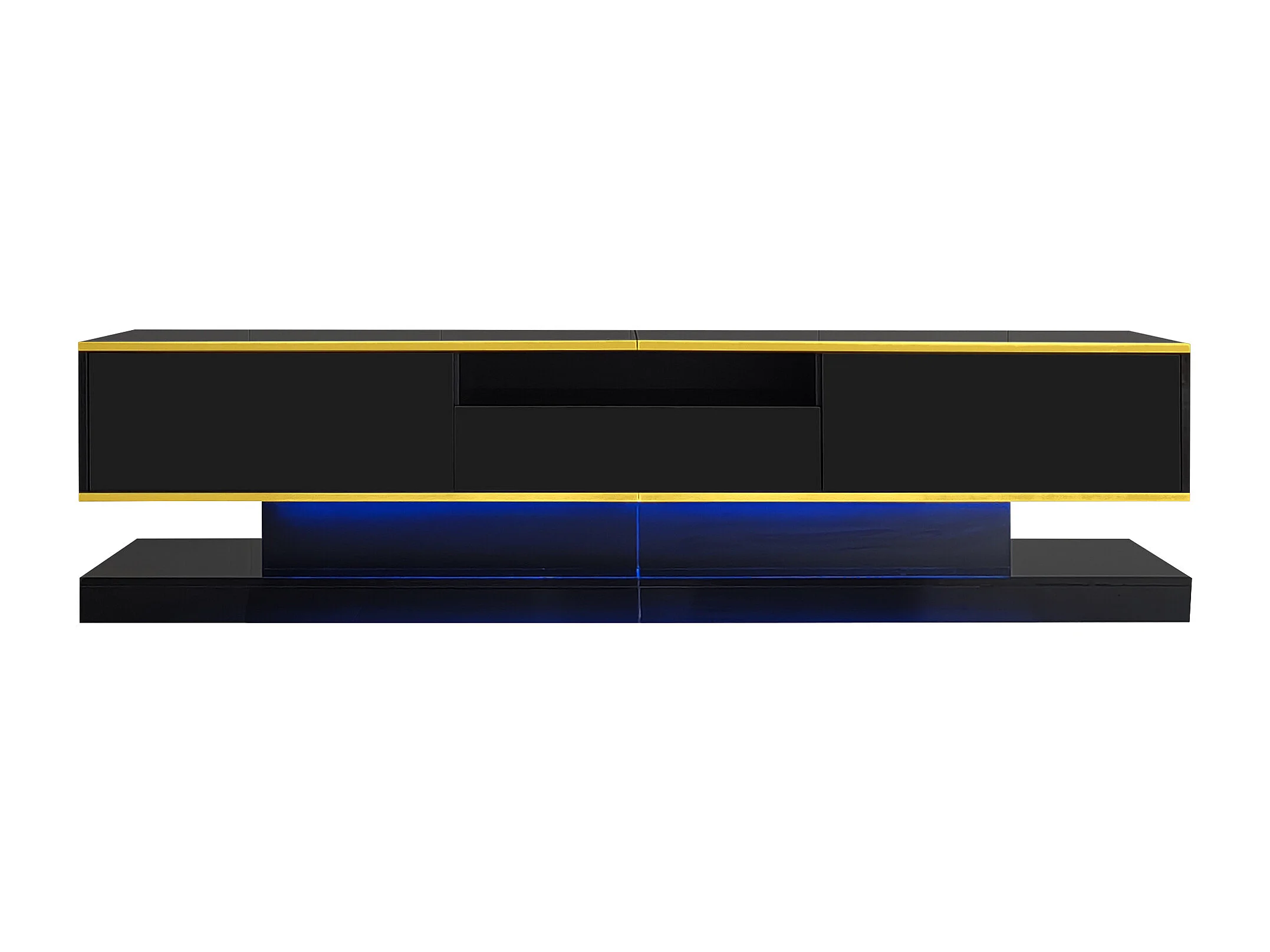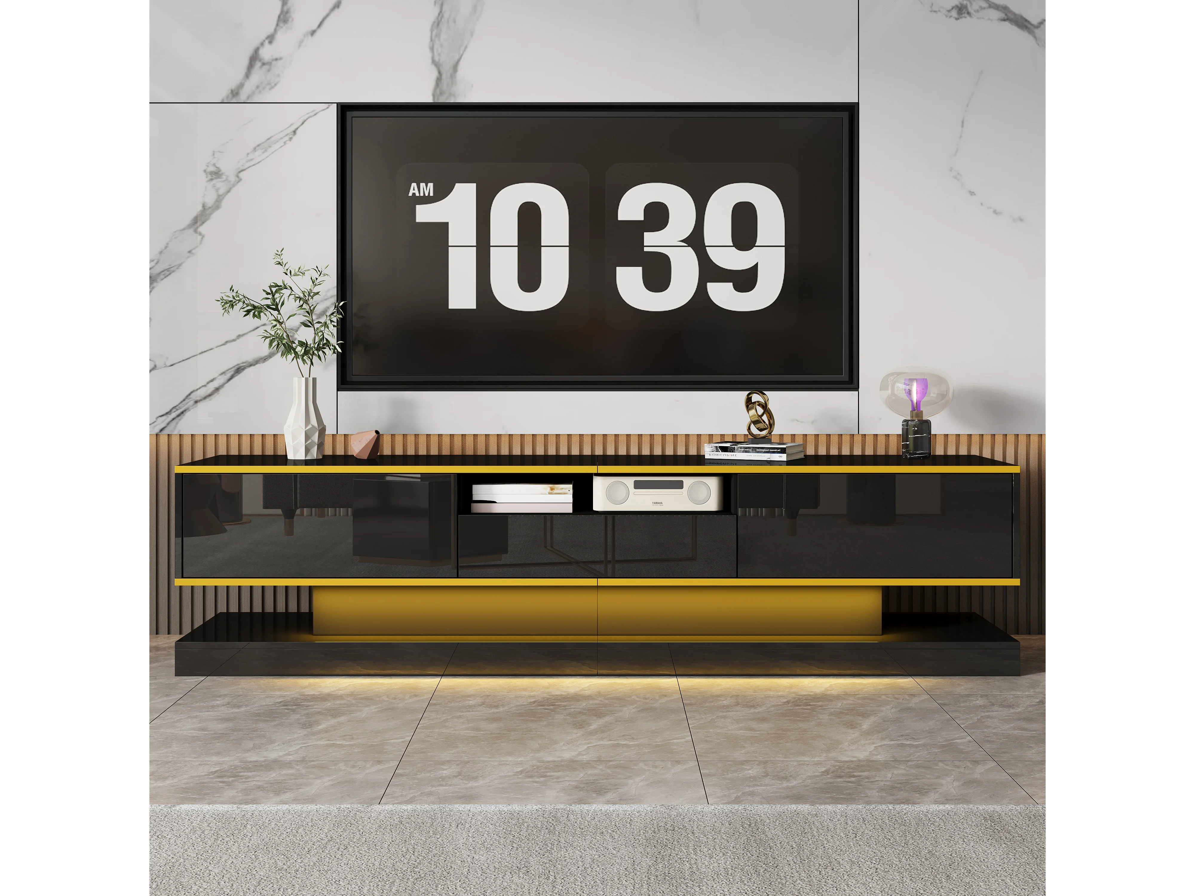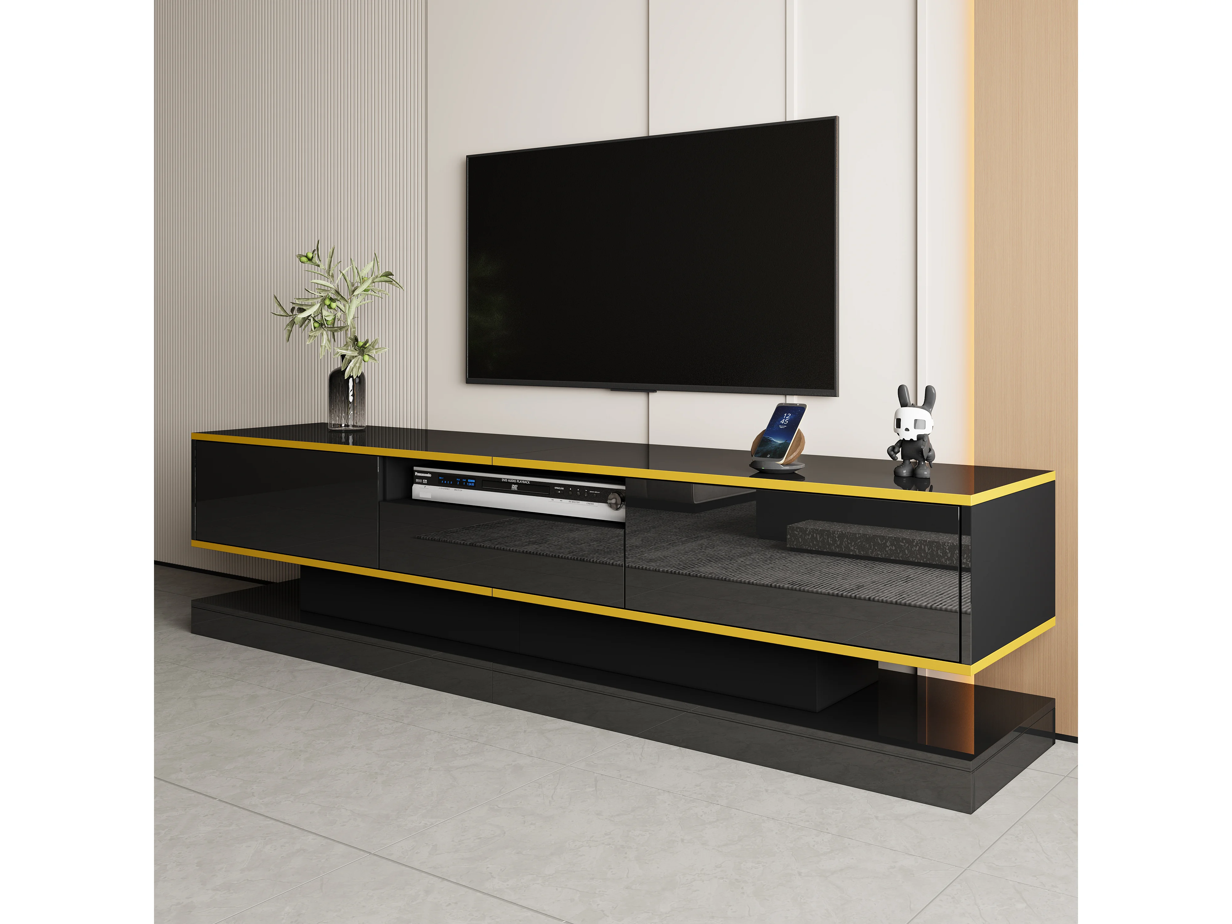 Mueble de TV moderno con 3 cajones, iluminación LED, negro brillante, 180 cm, para salón contemporáneo